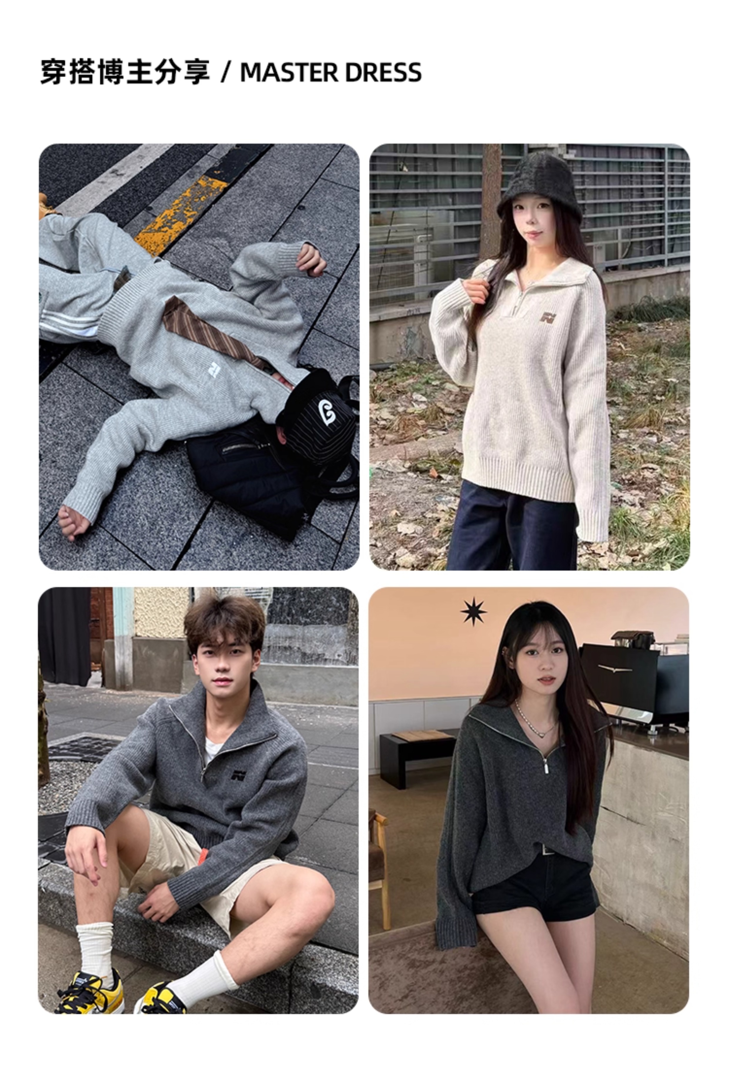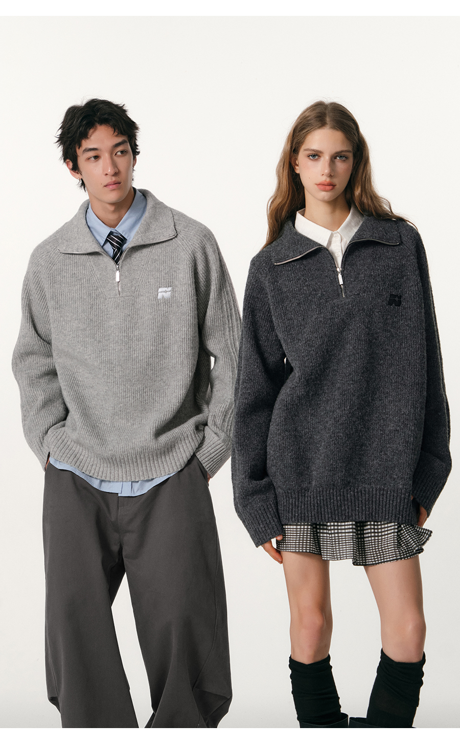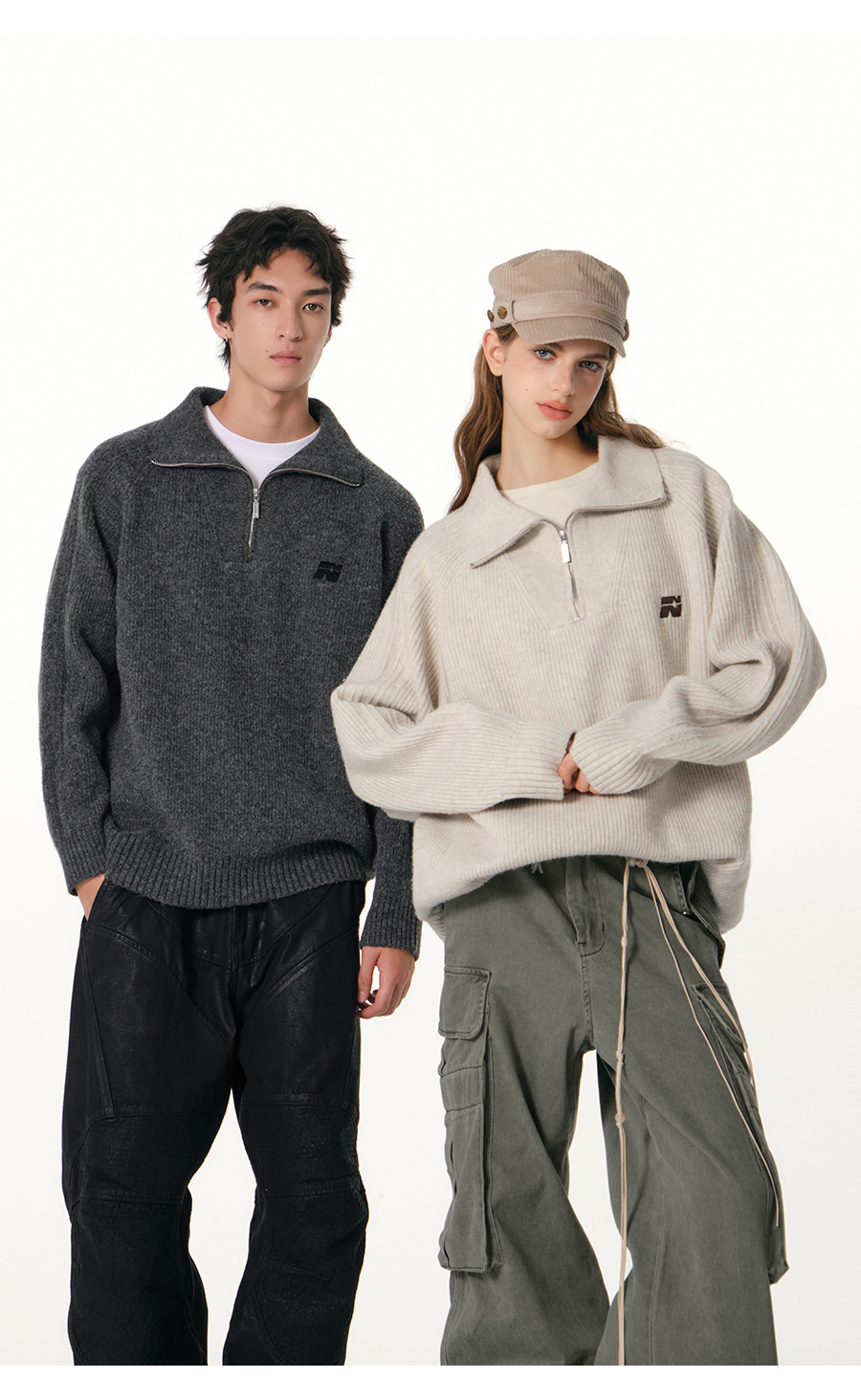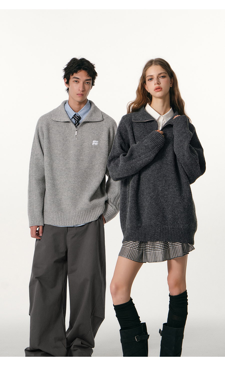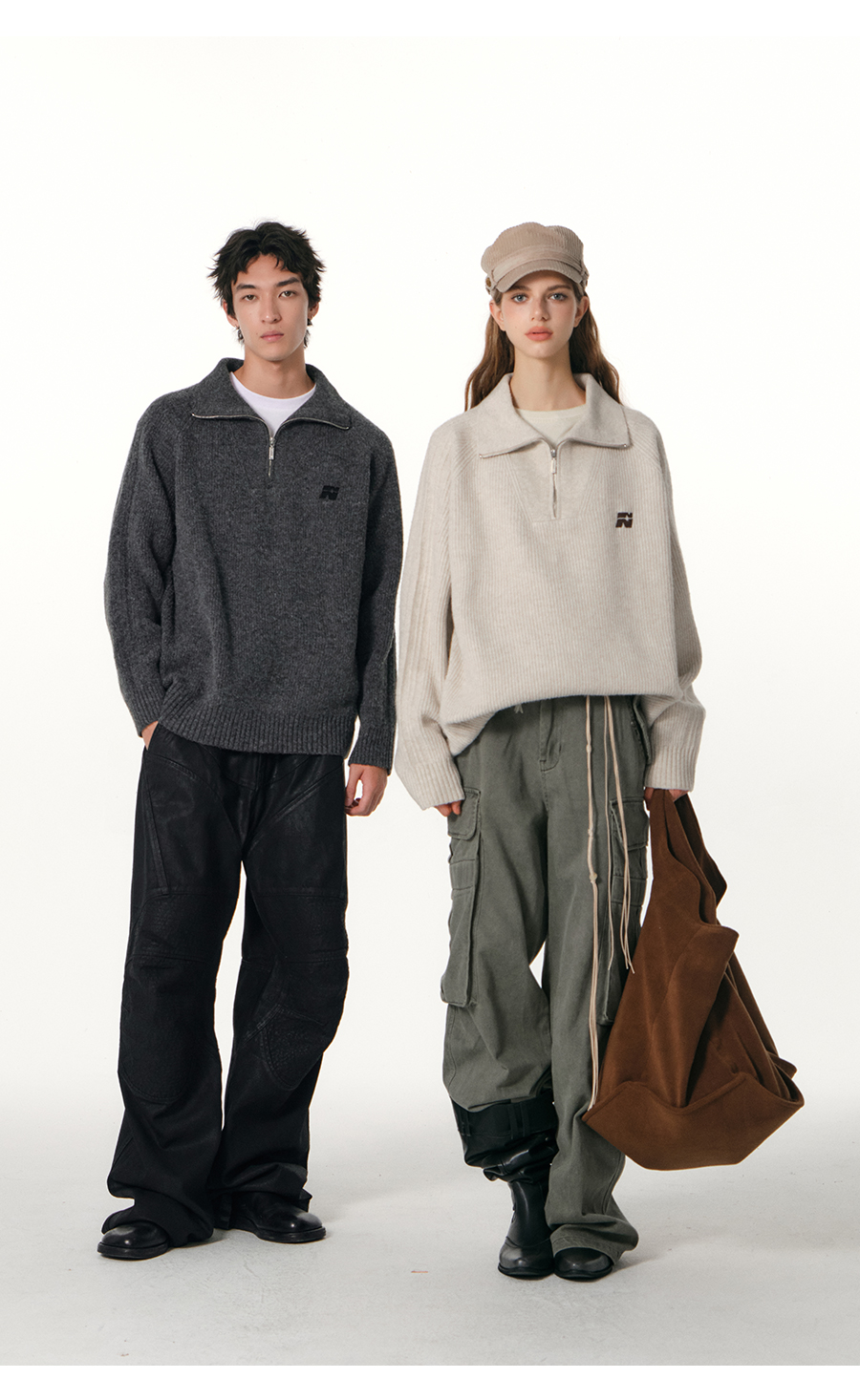 Fornines Contains Sheep Wool, Stand-Up Collar Half-Zip Knitwear for Men and Women, Autumn and Winter Couple Loose High-Neck Casual Knitwear