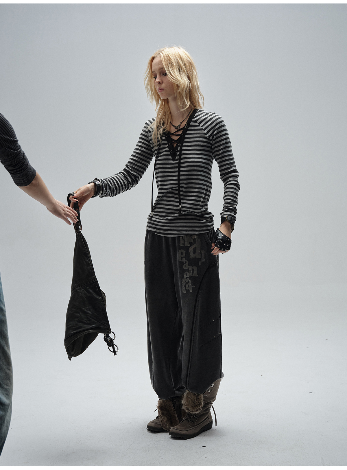 Wearandtear Raw Edge Printed Split Loose Distressed Washed Rivet Retro Punk Elastic Sweatpants Trousers