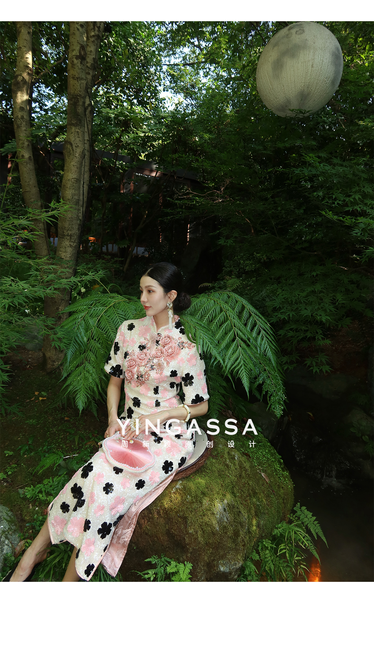 Zhou Xinying Yingassa【Pink Carved Jade】Vintage-Style Chinese-Style Sequin-Embroidered Cheongsam Dress