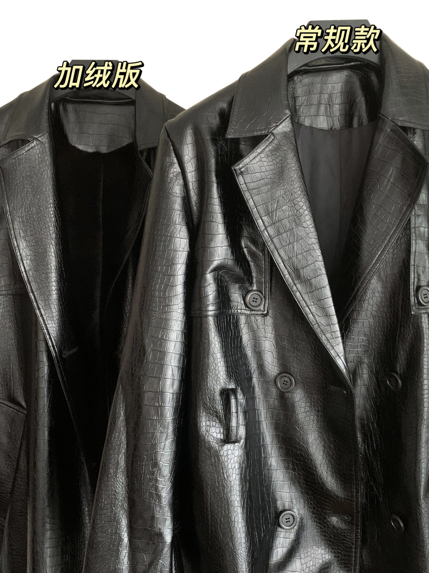 Ninnn 1D【Classic Cool Girl】Crocodile Pattern High-Quality Leather Jacket for Women, Autumn and Winter Slimming Long Trench Coat