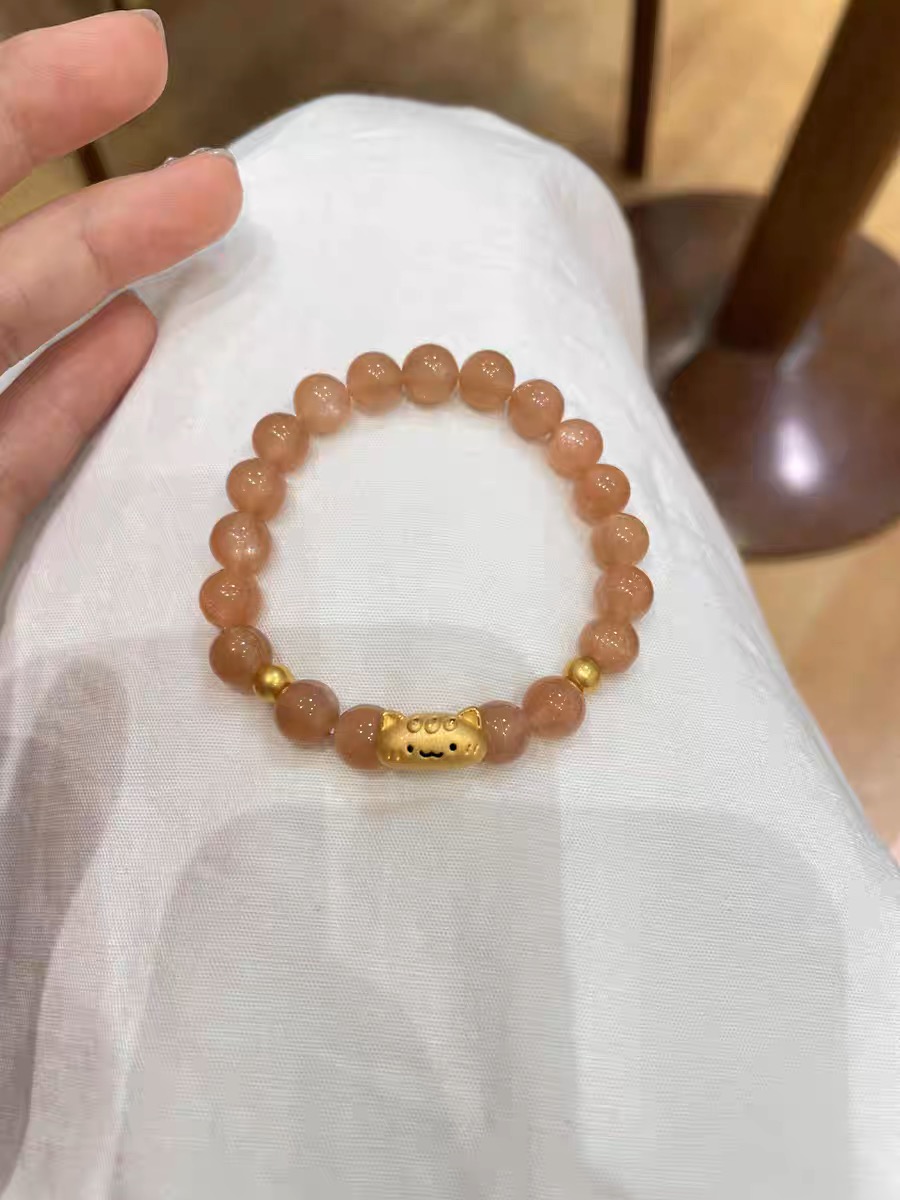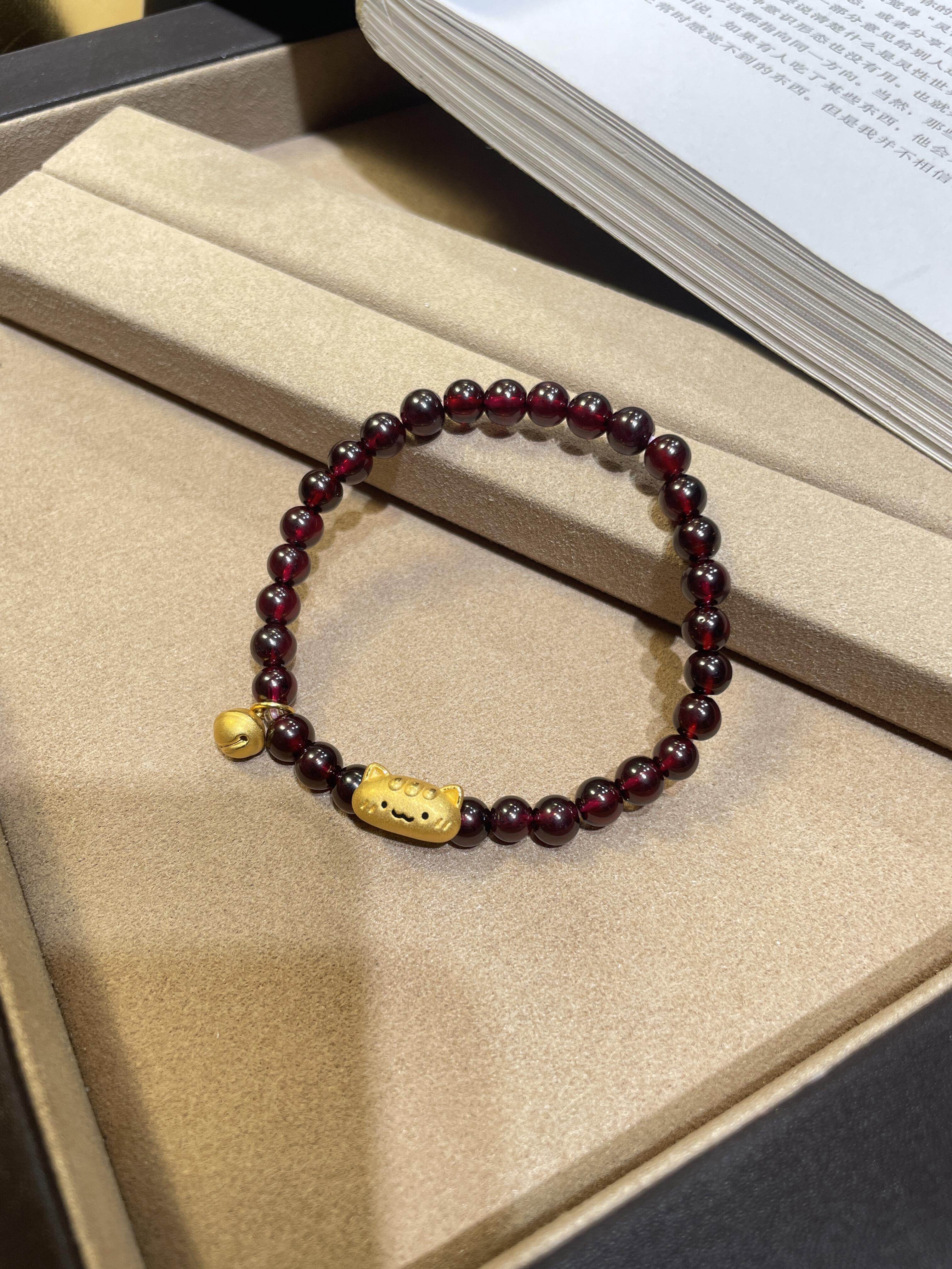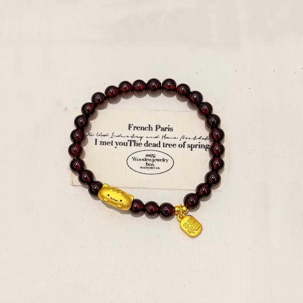 Authentic Pure Gold 999 Gold Baguette Cat Garnet Bracelet Gold Plate Wrapped Sunstone Valentine's Day Gift for Girlfriend