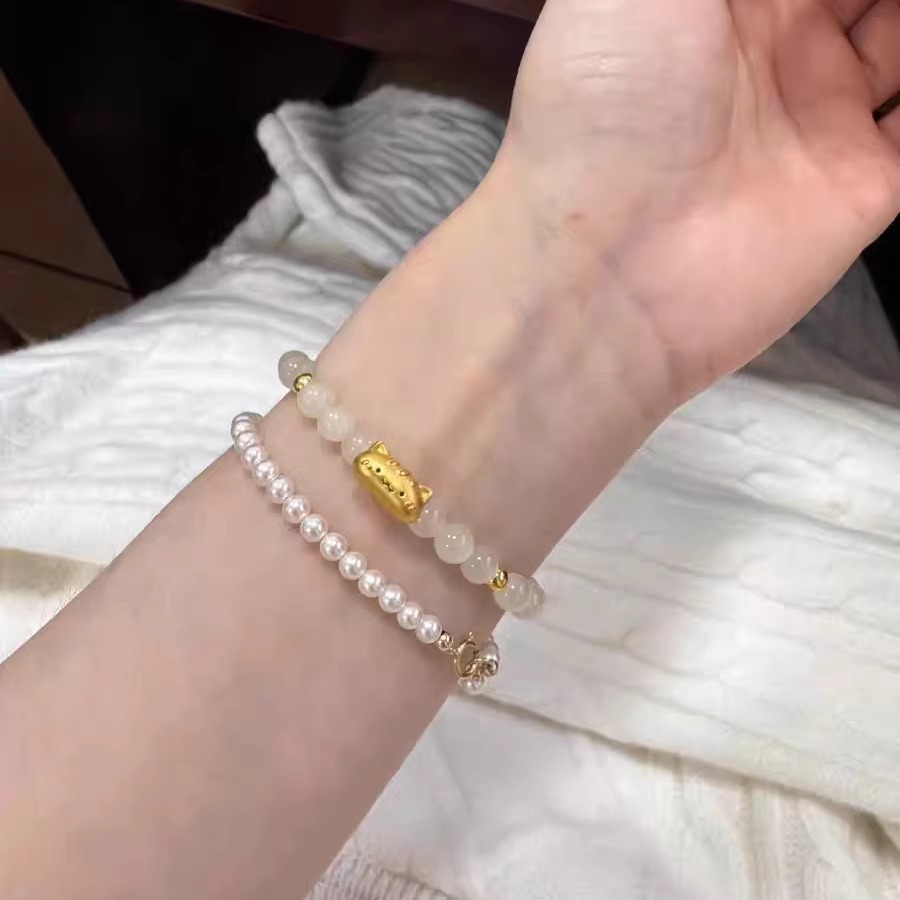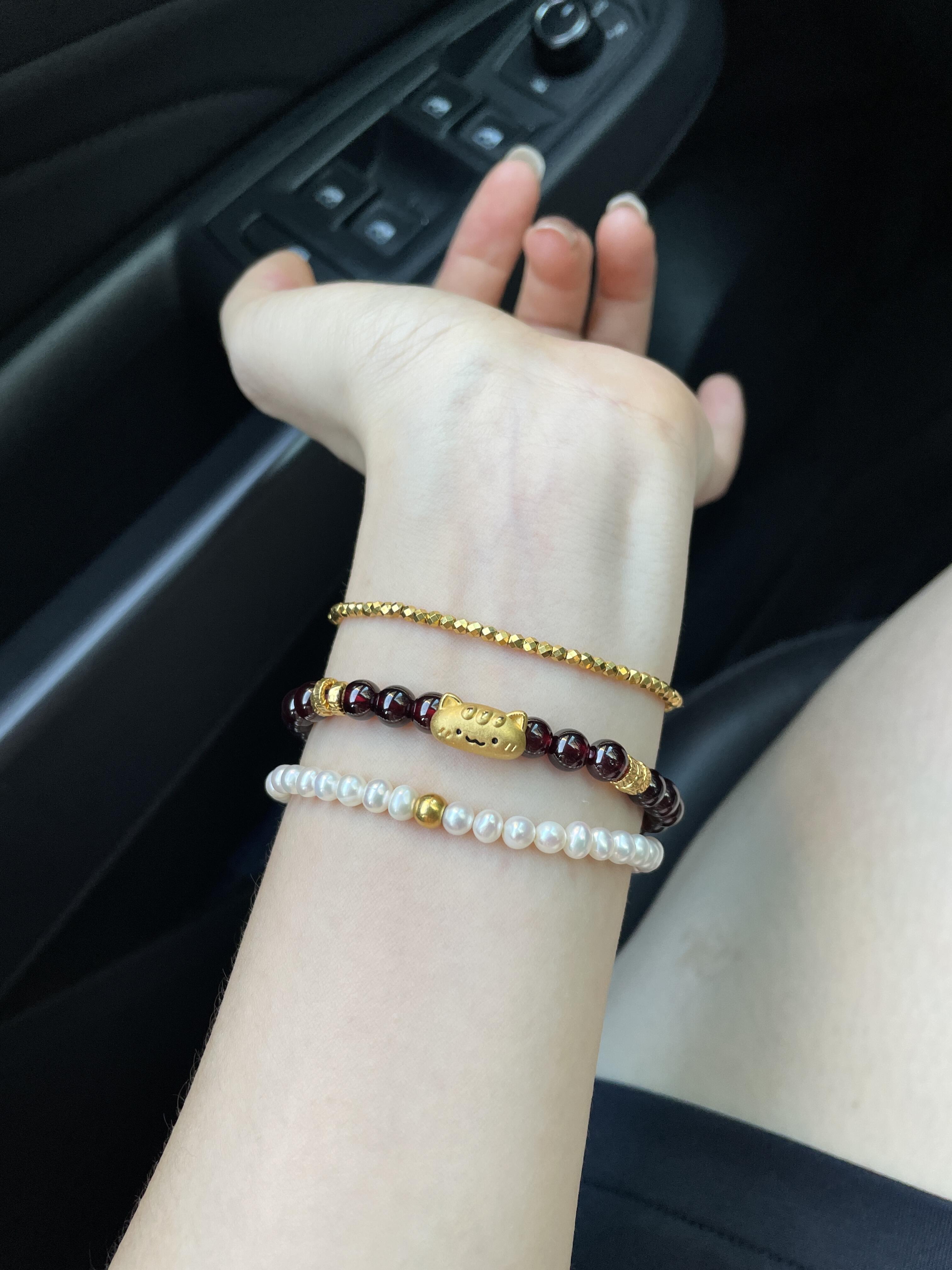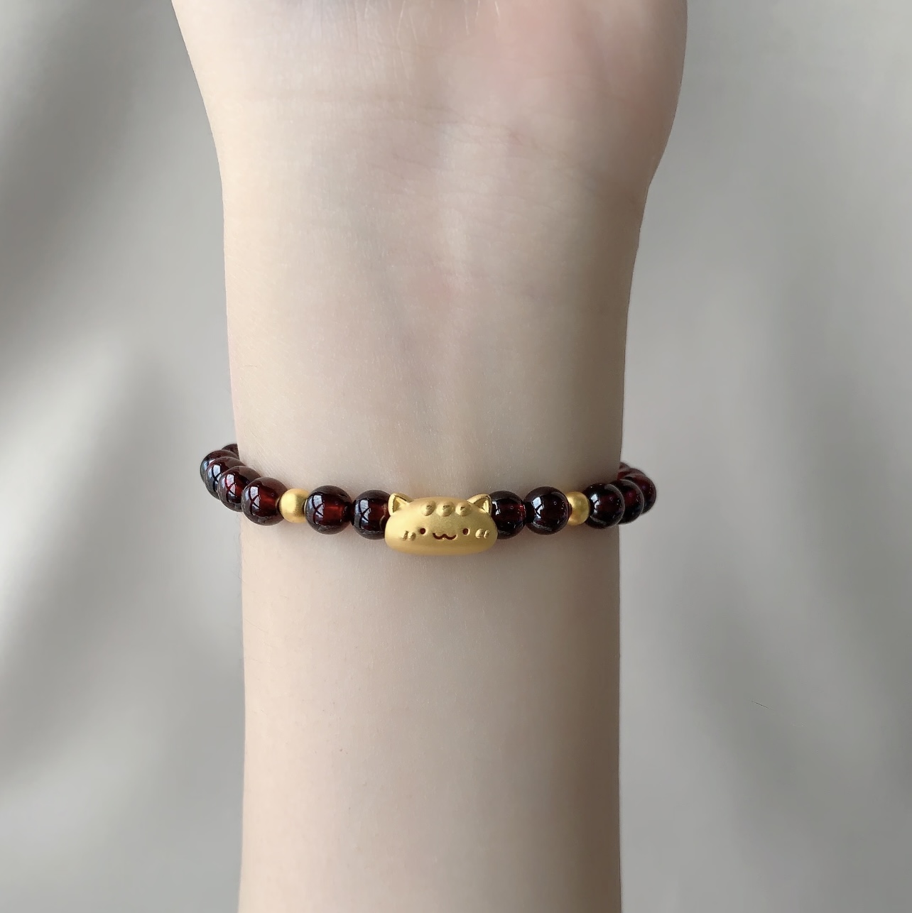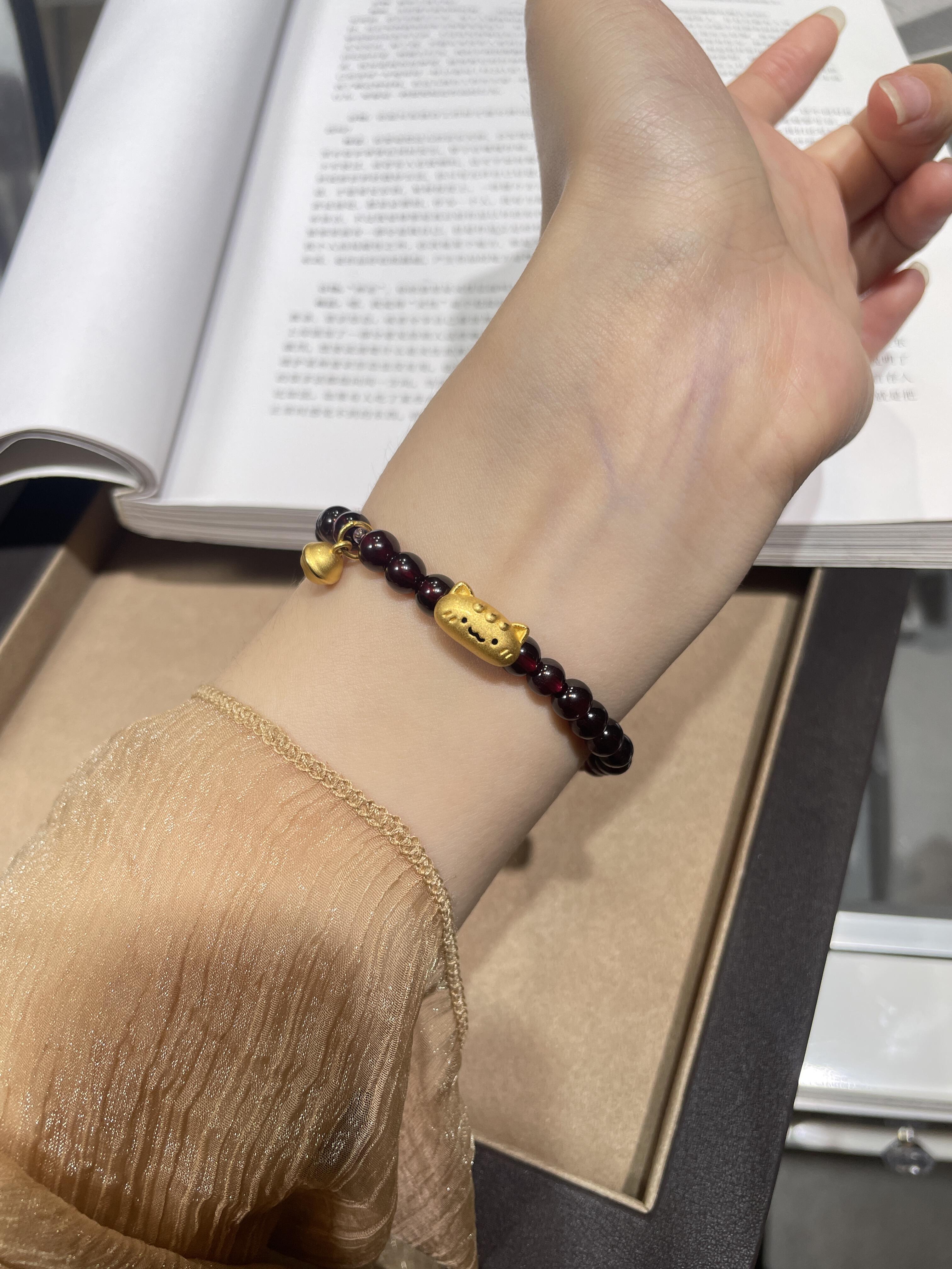 Authentic Pure Gold 999 Gold Baguette Cat Garnet Bracelet Gold Plate Wrapped Sunstone Valentine's Day Gift for Girlfriend