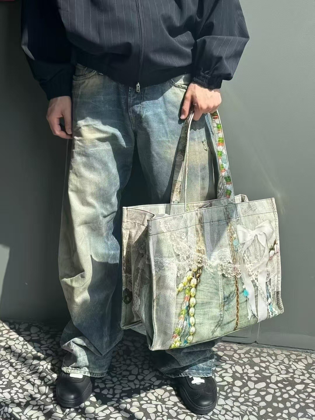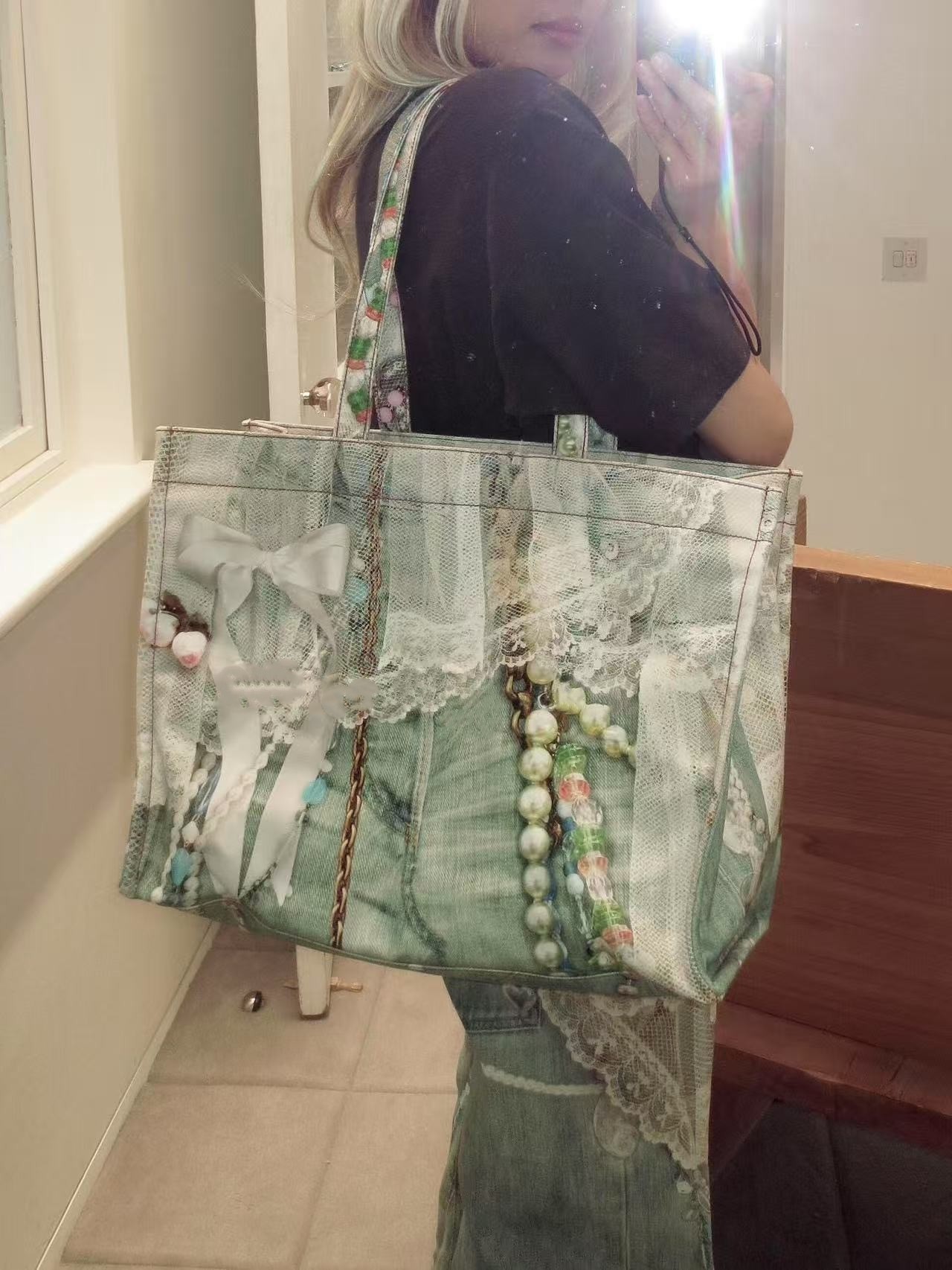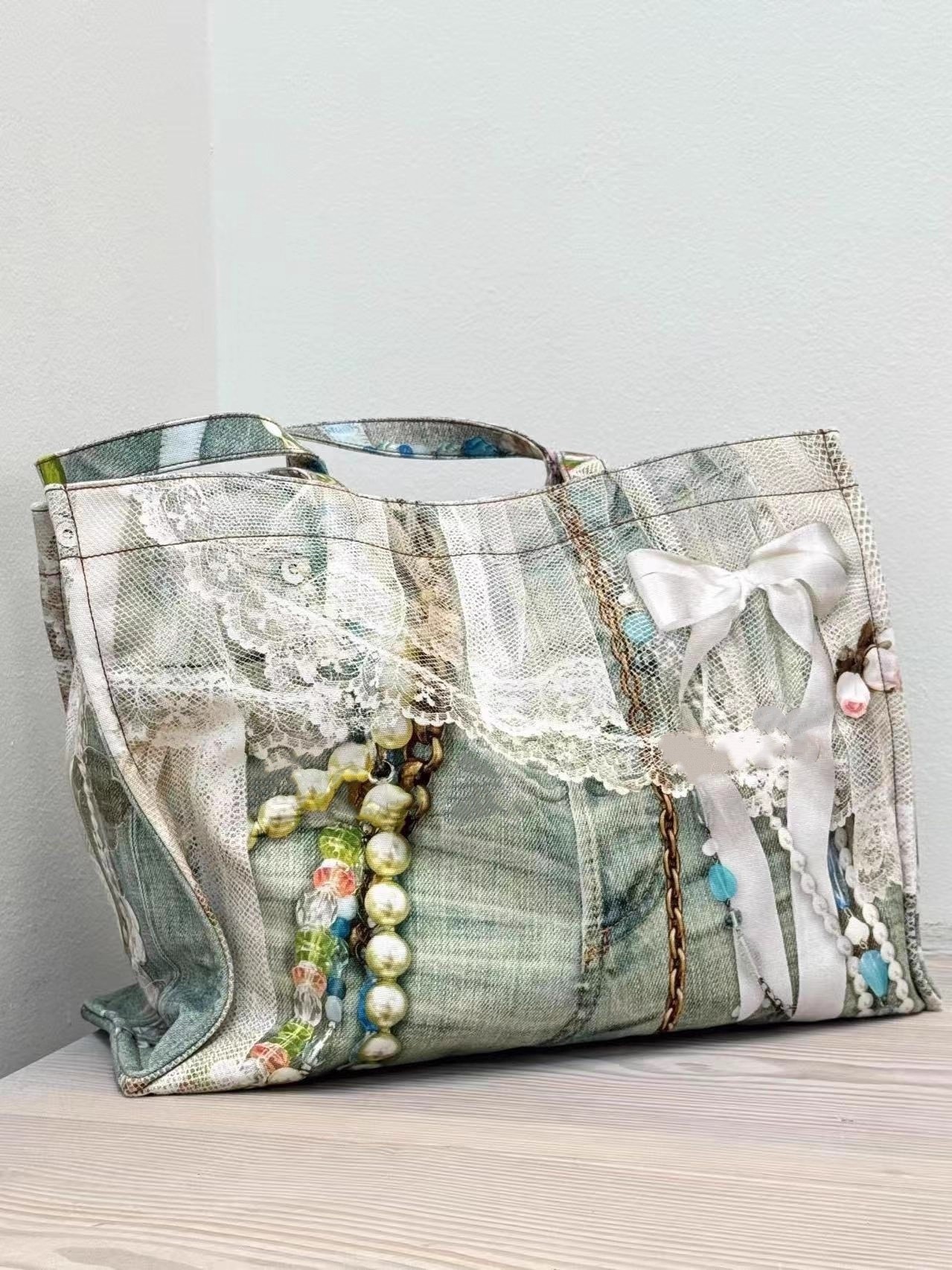 Nanyou Quality Ac* Pearl Necklace Bow Lace Print Large Pocket Denim Tote Bag 25 New Model Women's Bag