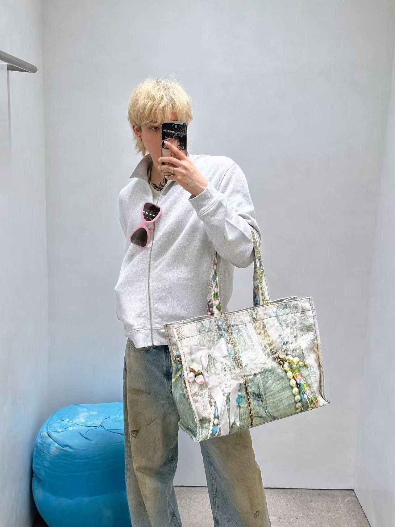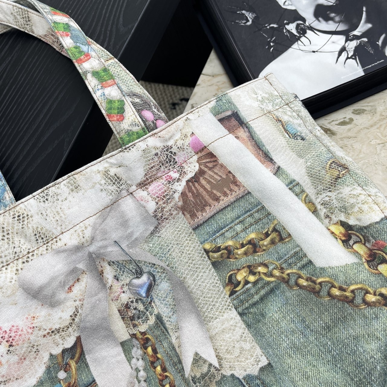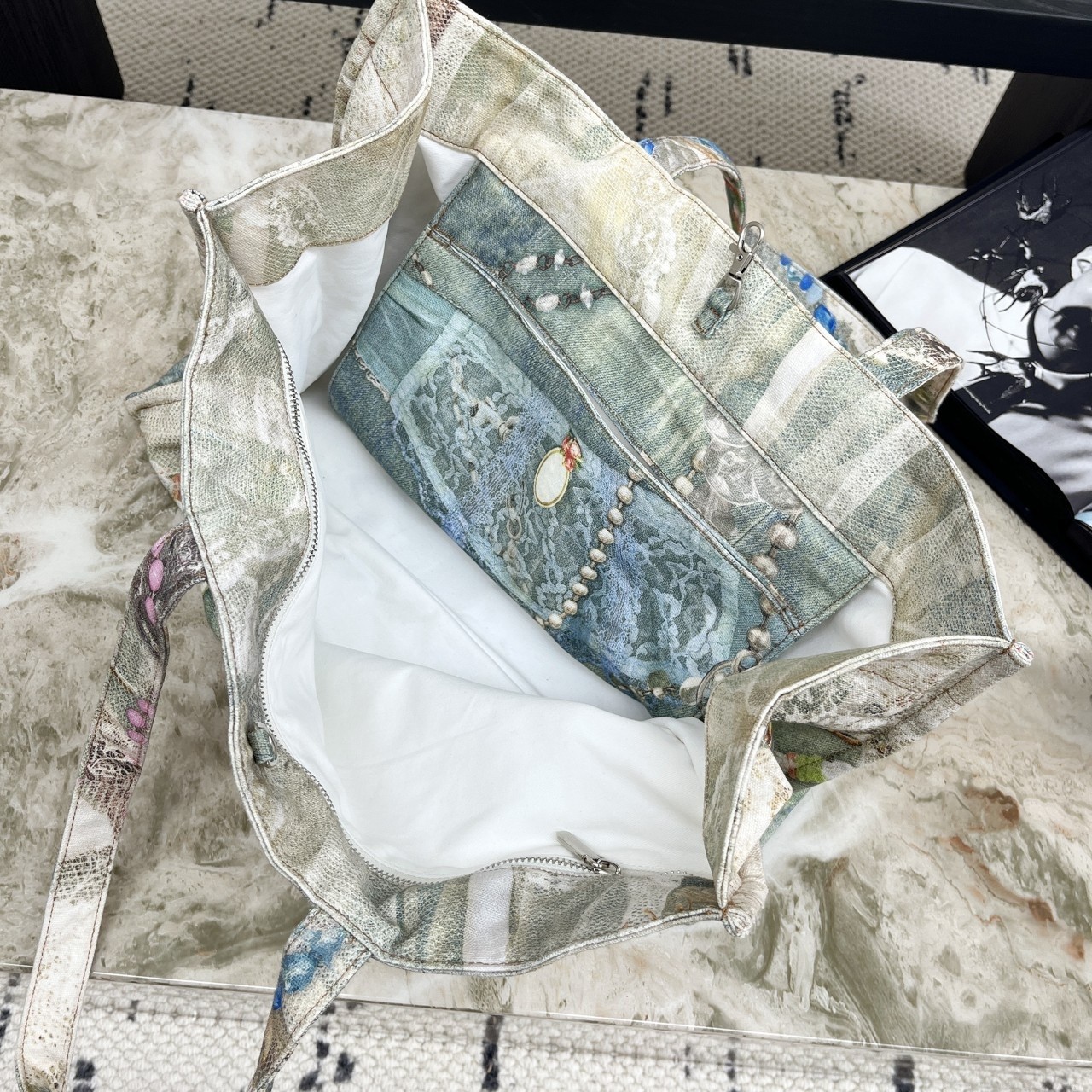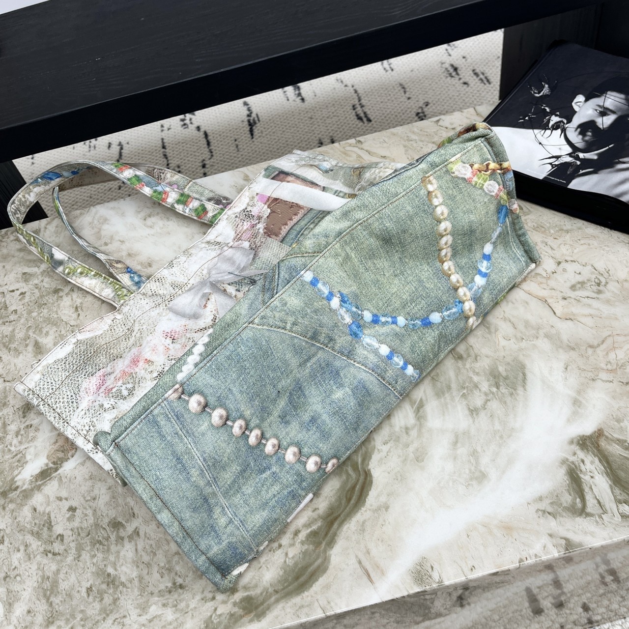 Nanyou Quality Ac* Pearl Necklace Bow Lace Print Large Pocket Denim Tote Bag 25 New Model Women's Bag