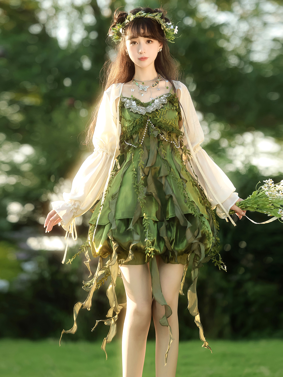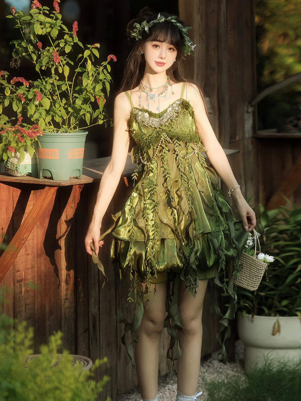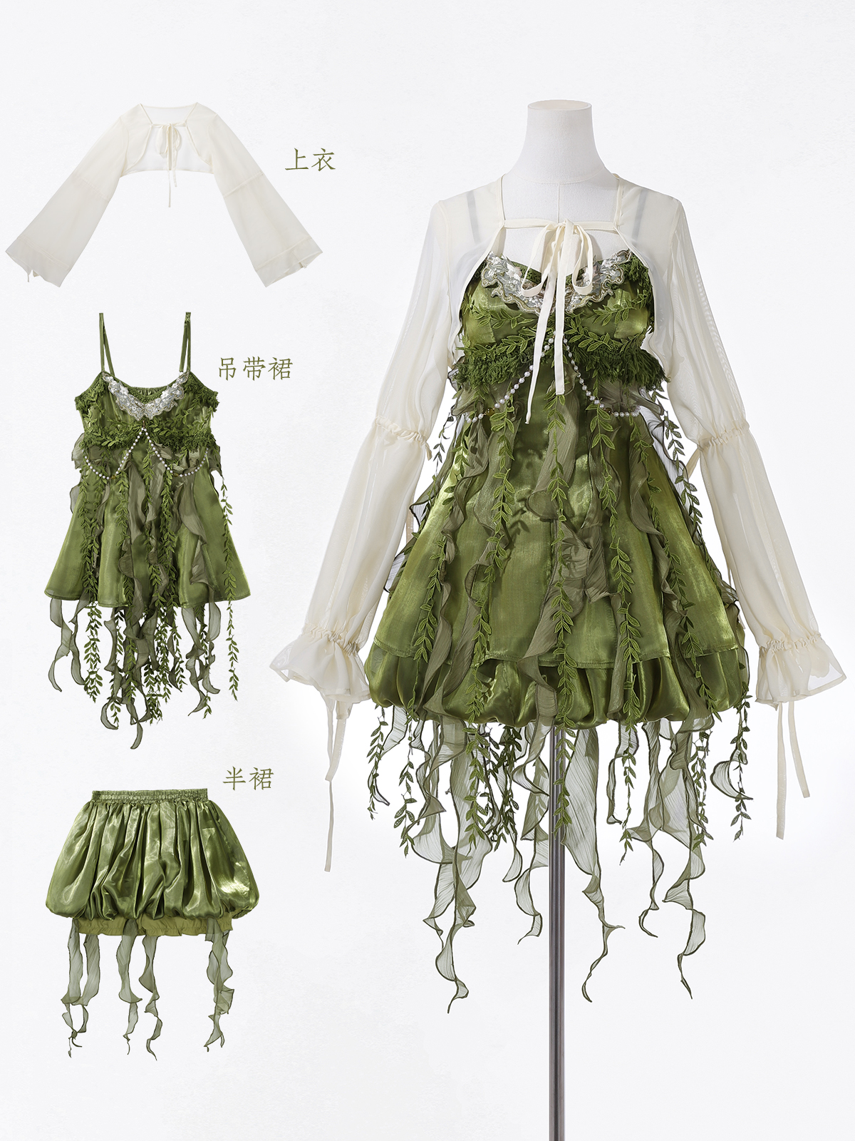 Yusen Green Tassel Suspender Skirt Short Skirt Set Green Fairy Tale Dress Mori Style National Style Girl Bud Skirt Autumn