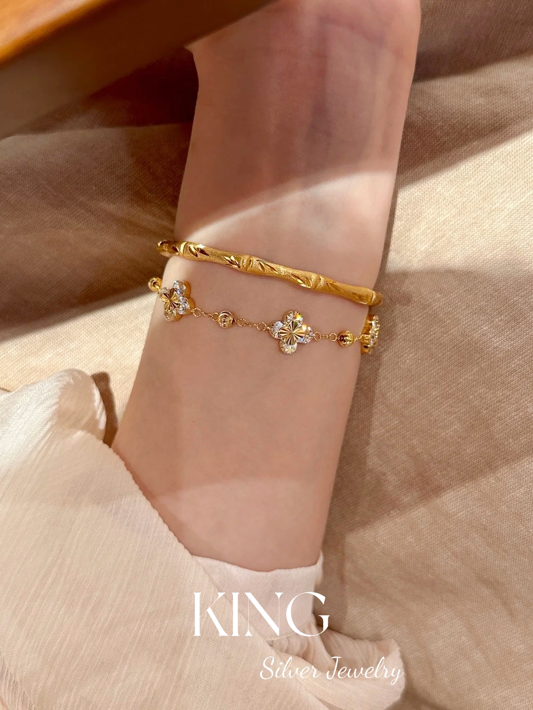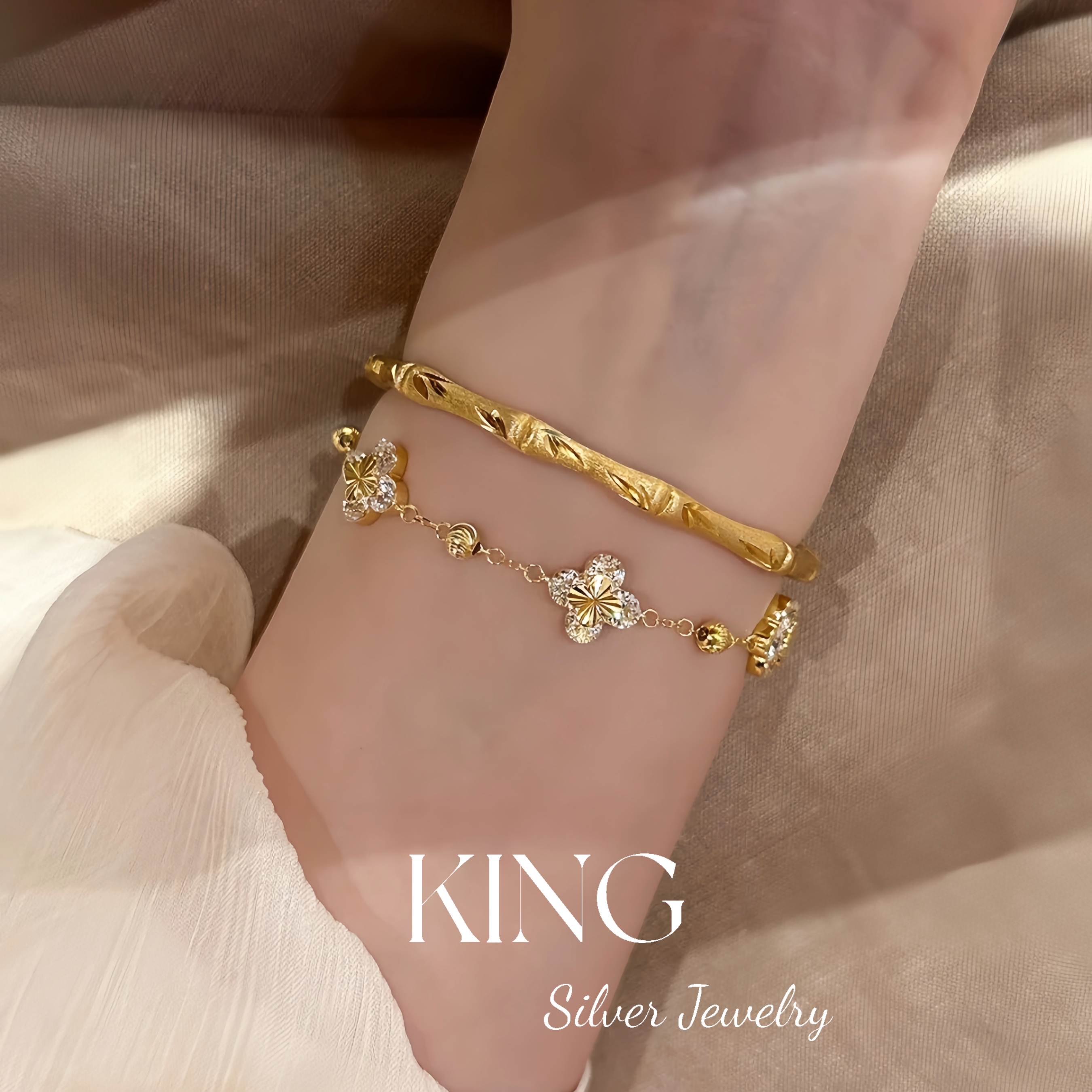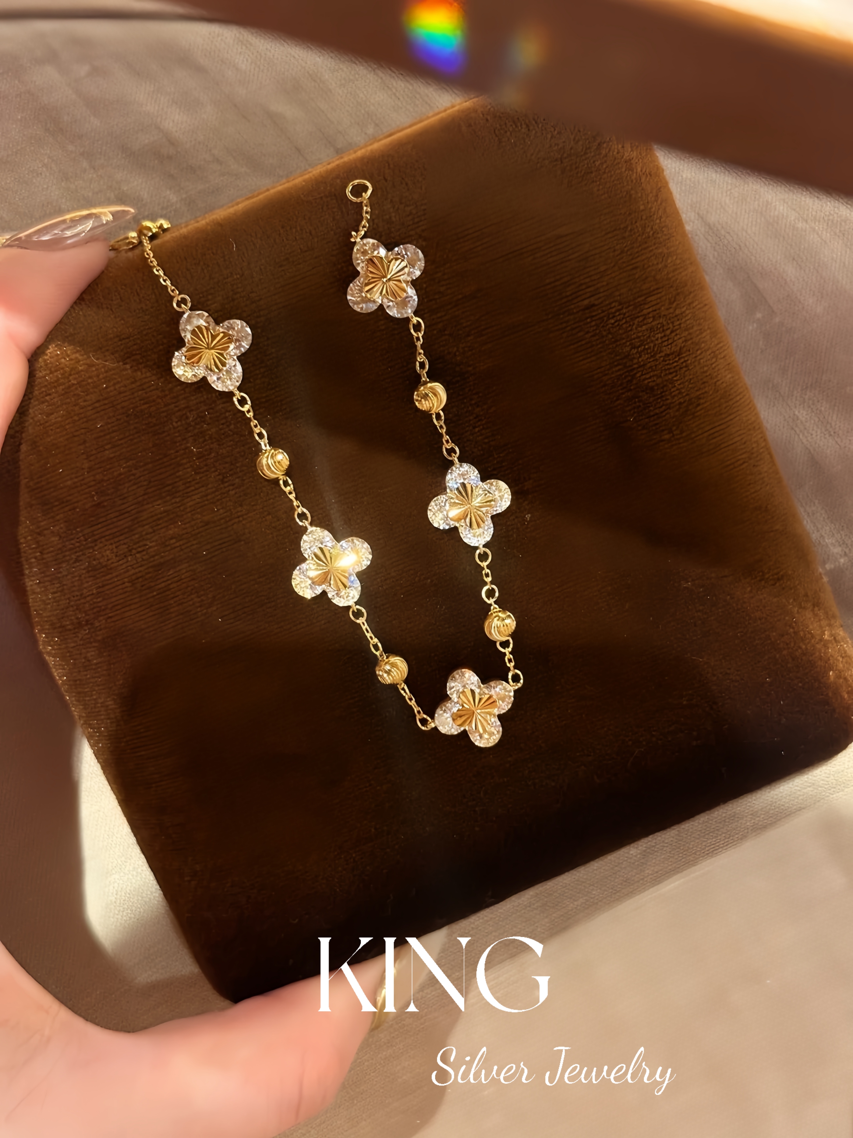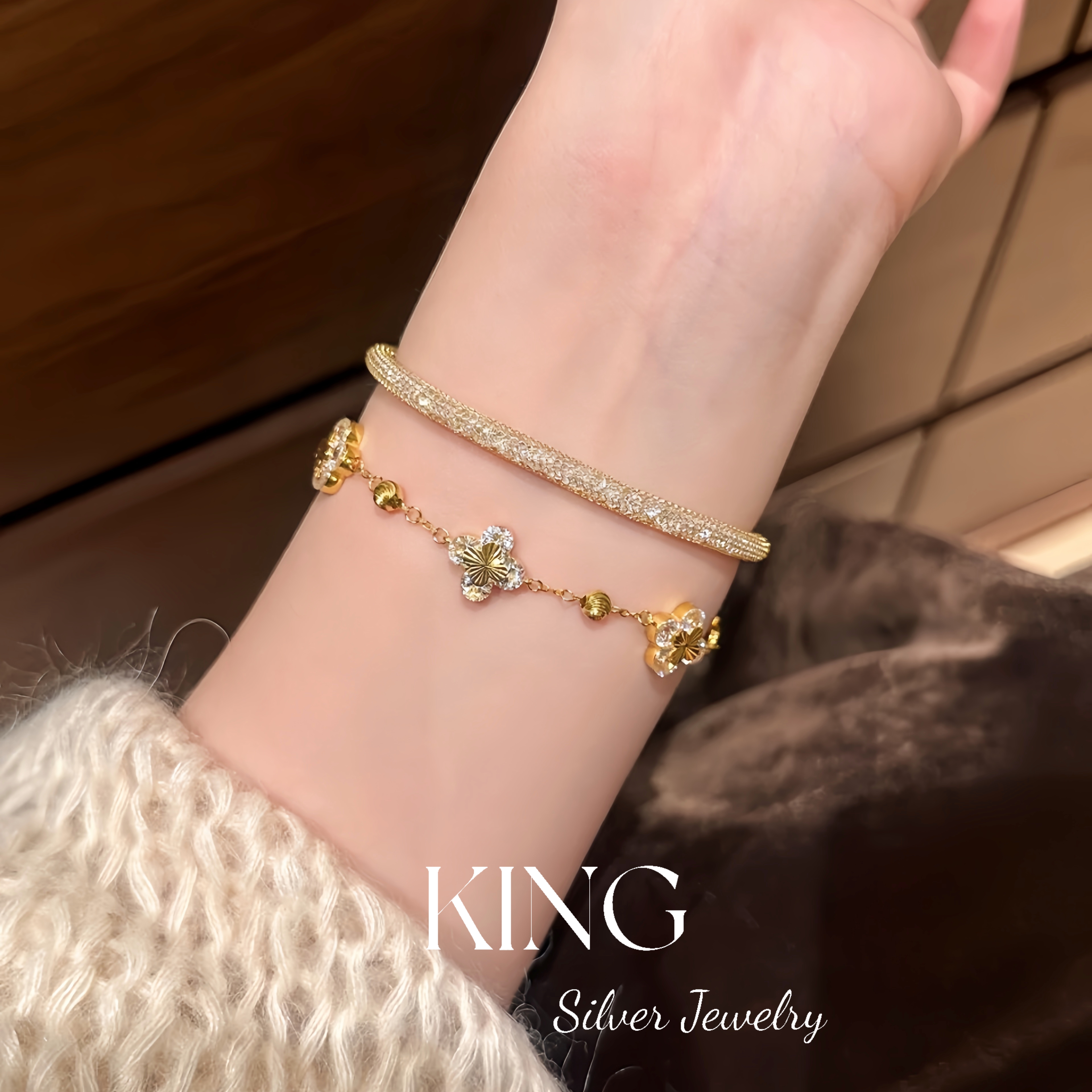 Four-leaf Zhiqiu | king Silver Jewelry S925 Silver Gold-plated Laser Four-leaf Flower CNC Female Fashion Sterling Silver Bracelet