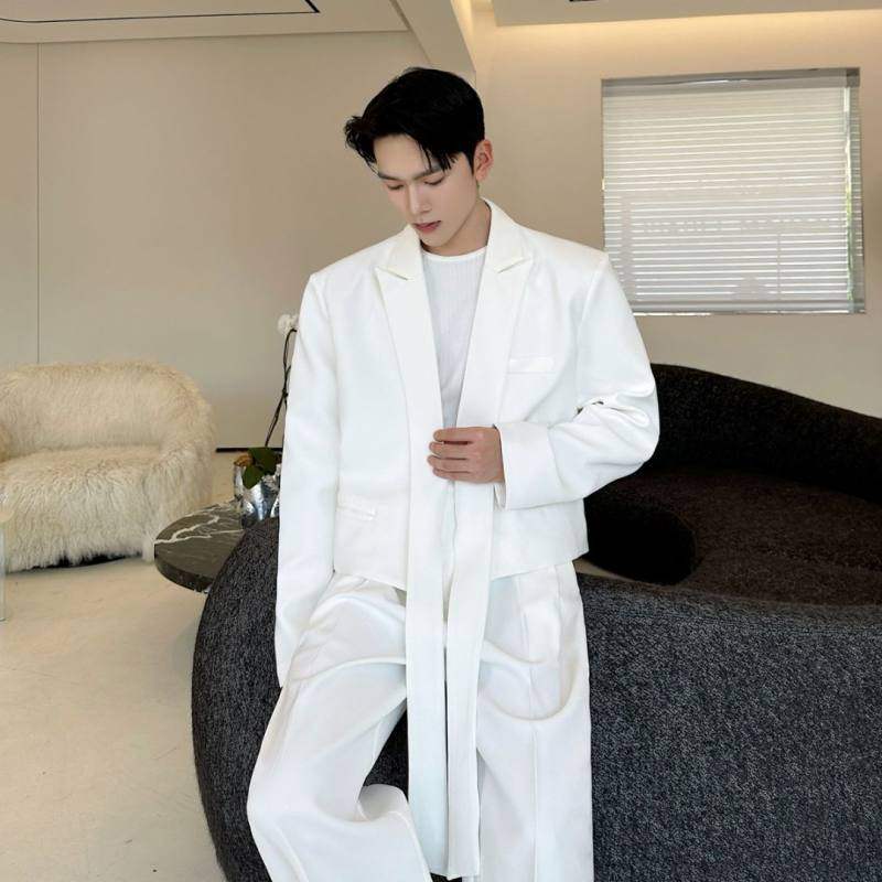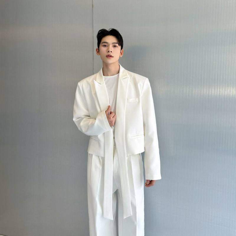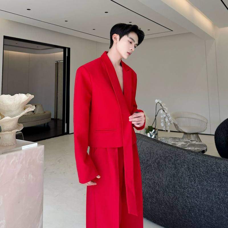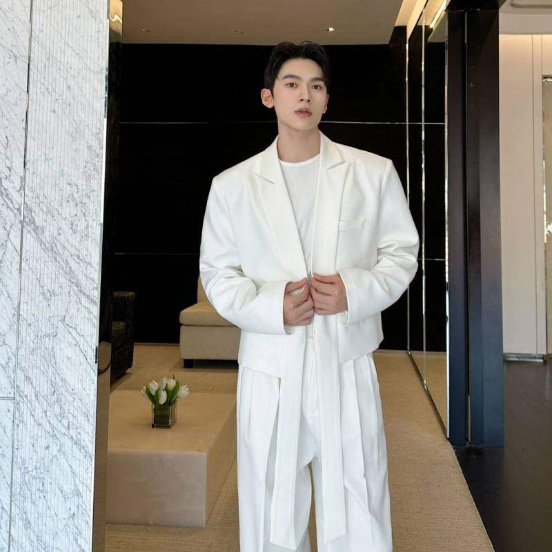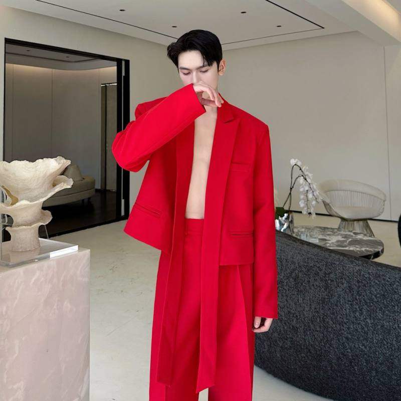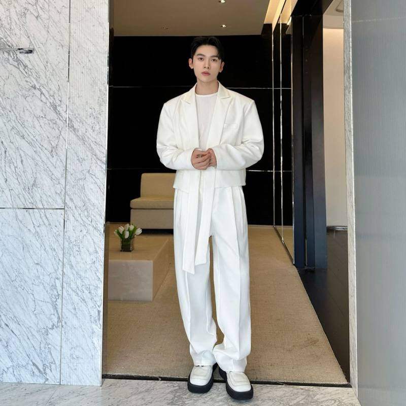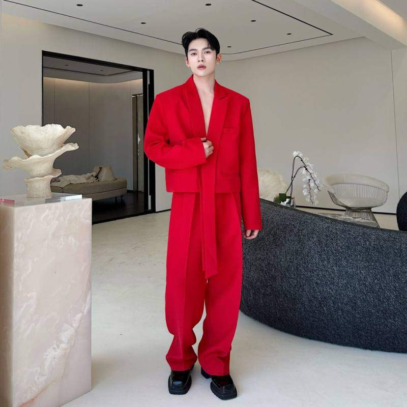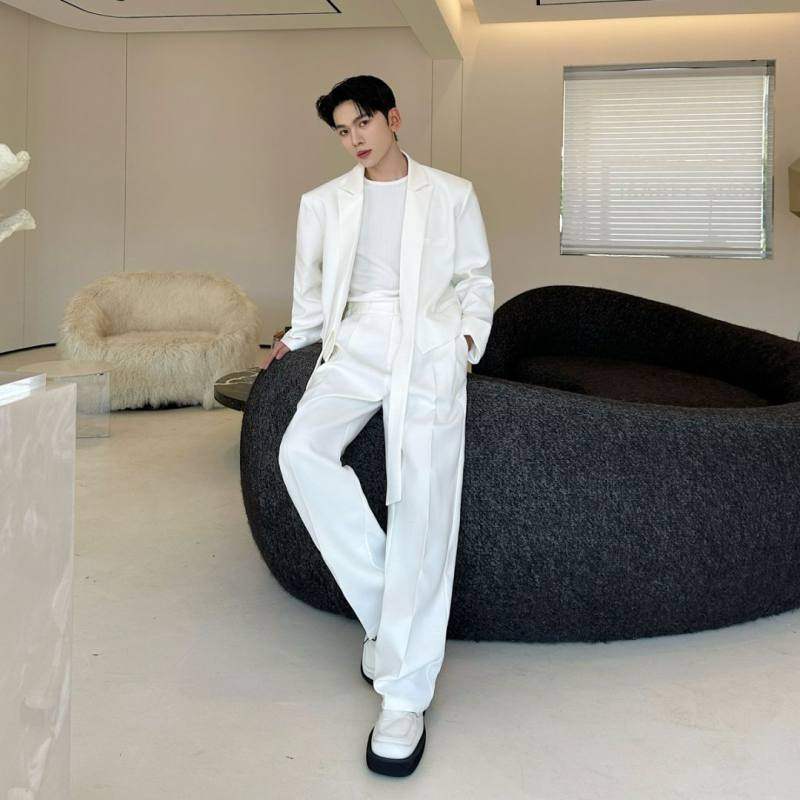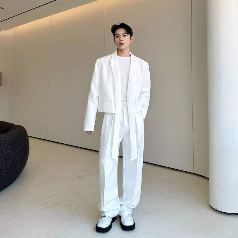 Autumn Fashion Ribbon Design Minimalist Suit Jacket for Men, High-End and Elegant Straight-Leg Trousers Two-Piece Set Trendy