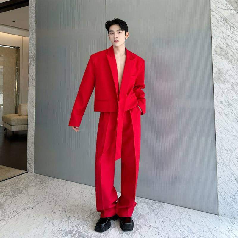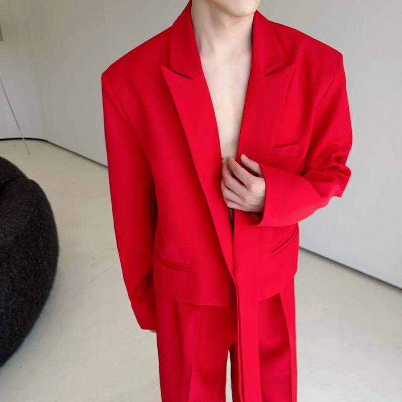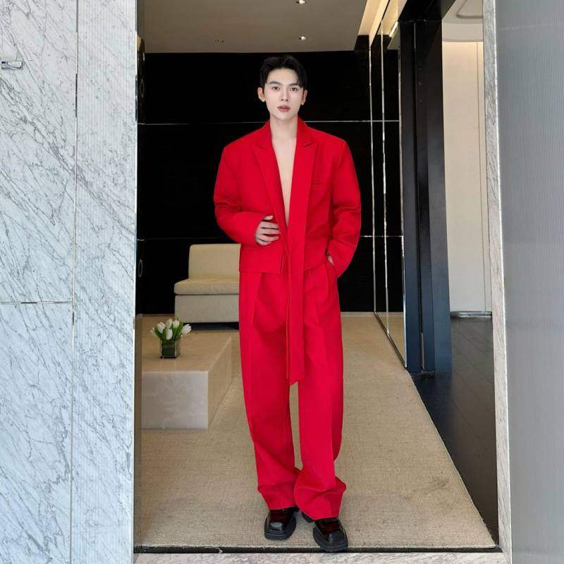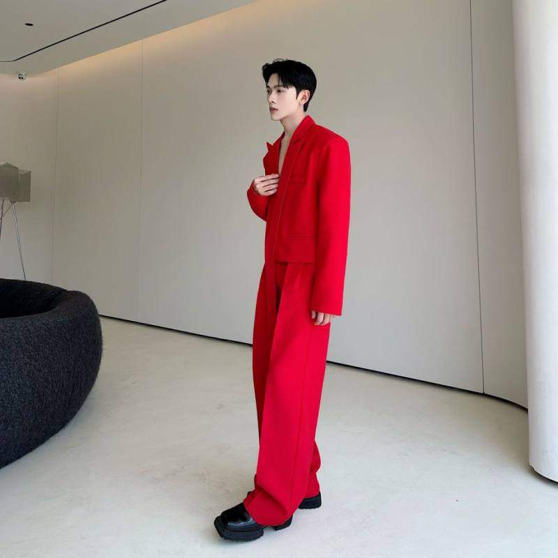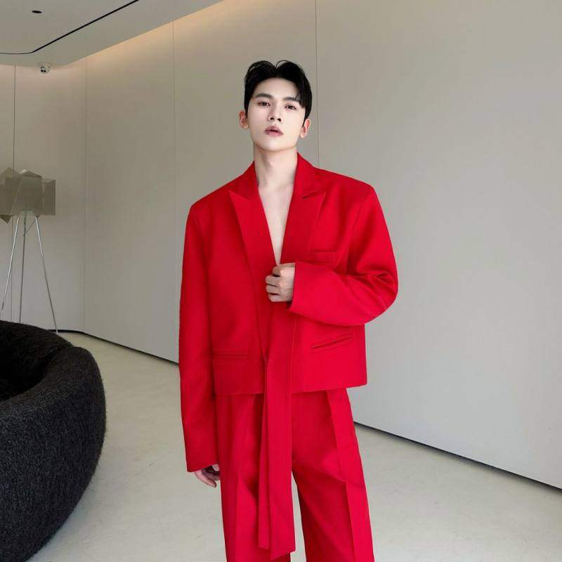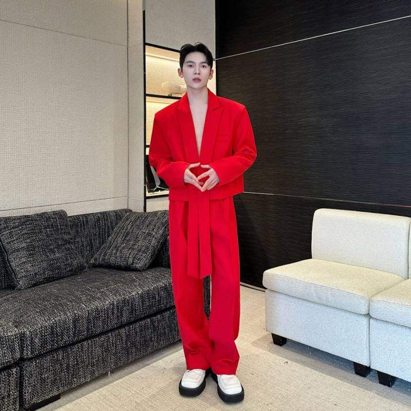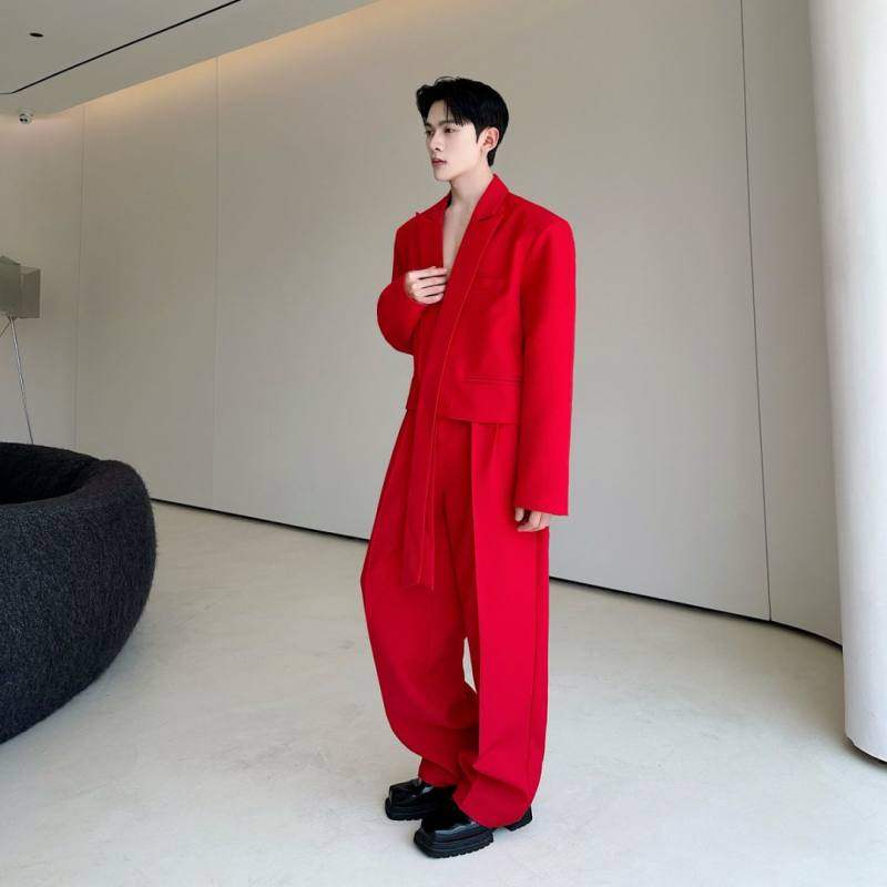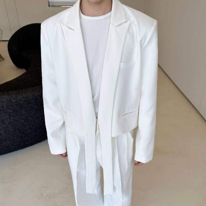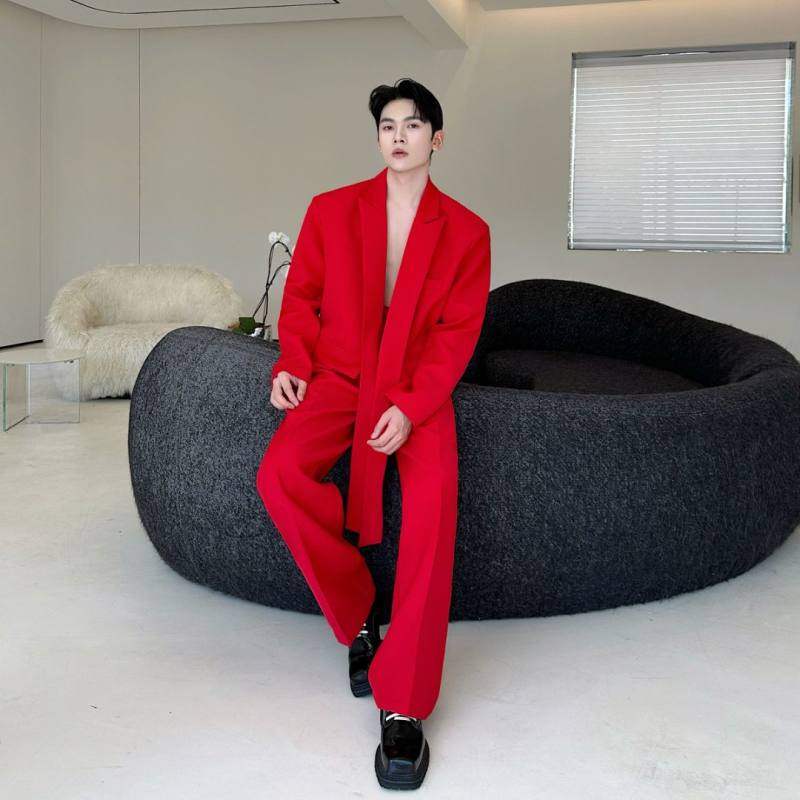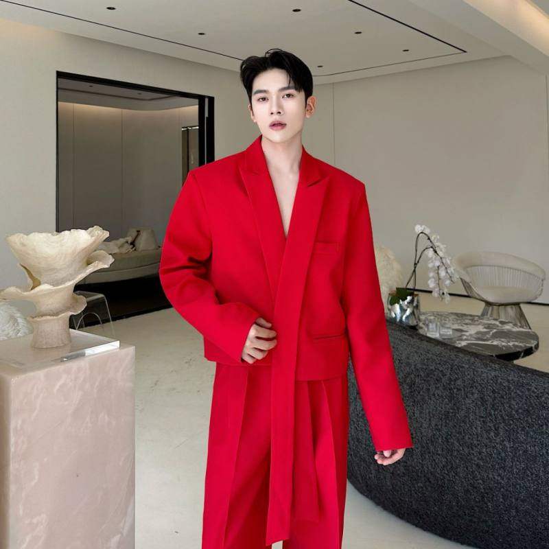 Autumn Fashion Ribbon Design Minimalist Suit Jacket for Men, High-End and Elegant Straight-Leg Trousers Two-Piece Set Trendy