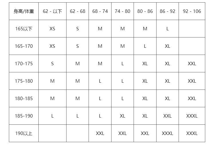 身高/净腰围/尺码 版型注释 胸围 衣长 袖长 下摆围
