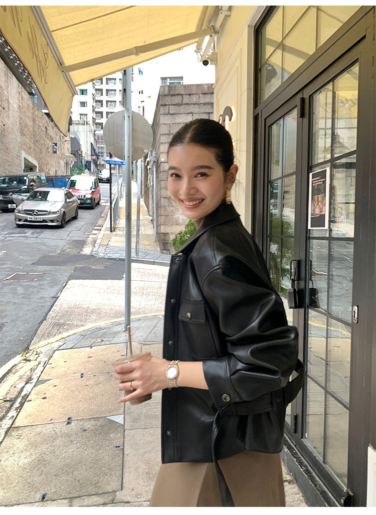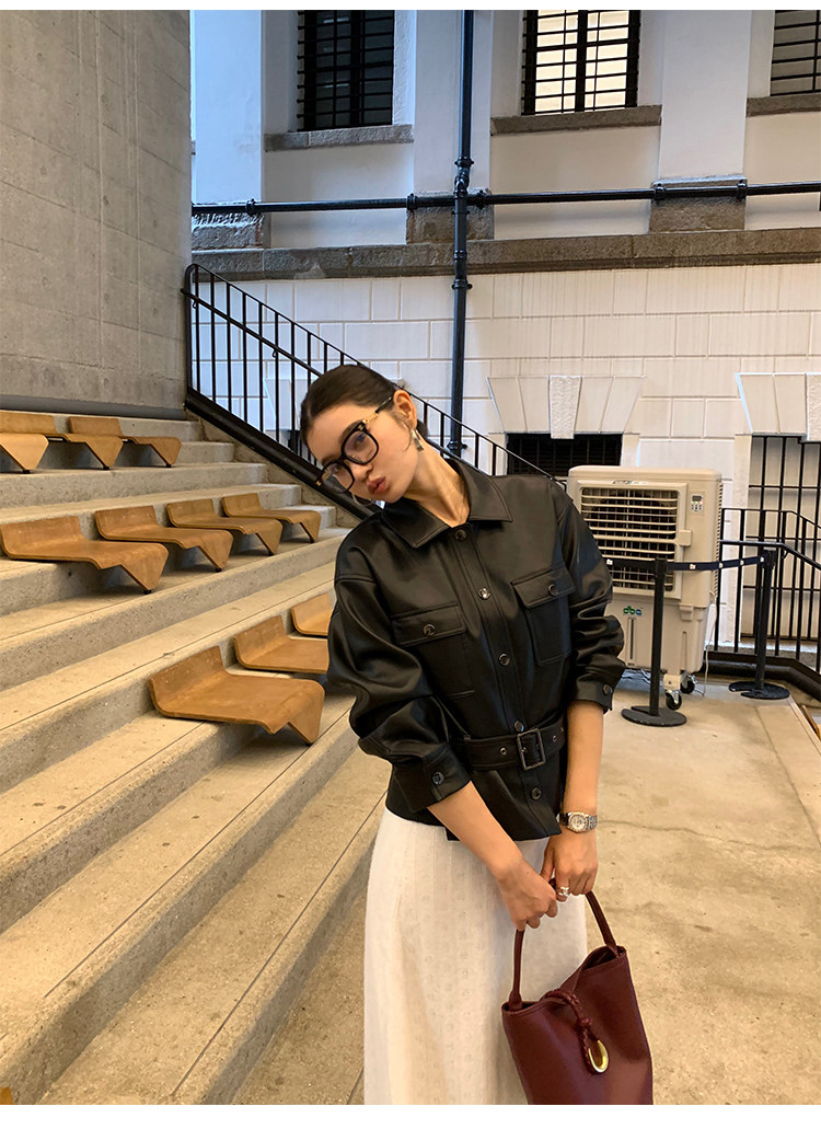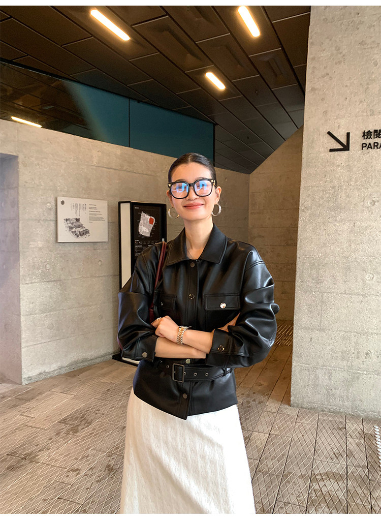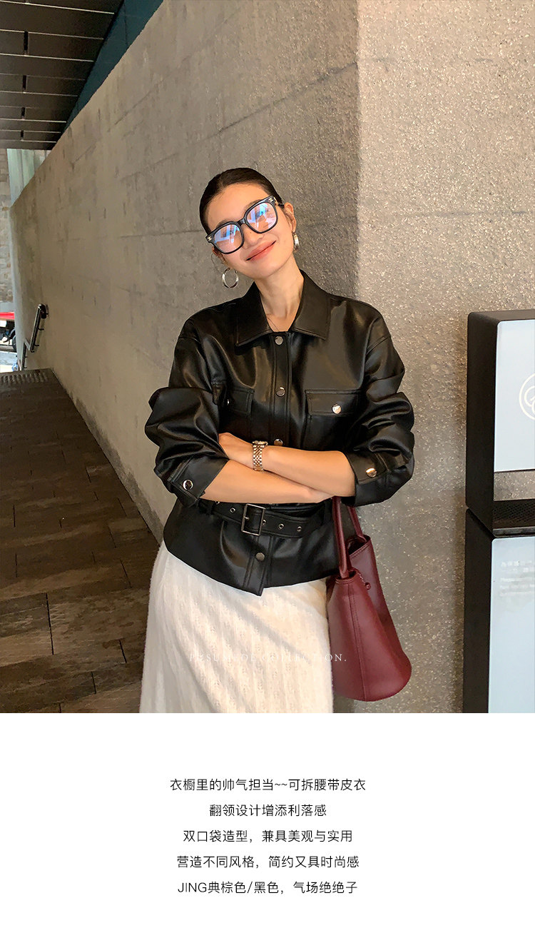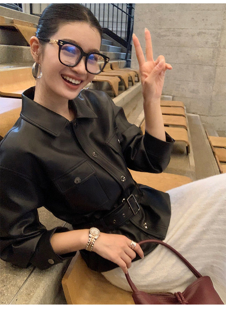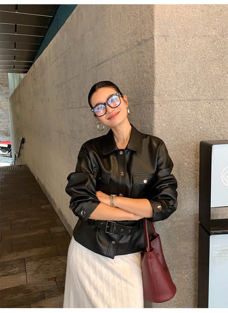 Pusumede Cool and Stylish Black Leather Jacket for Women with Detachable Belt Pu Leather Short Jacket