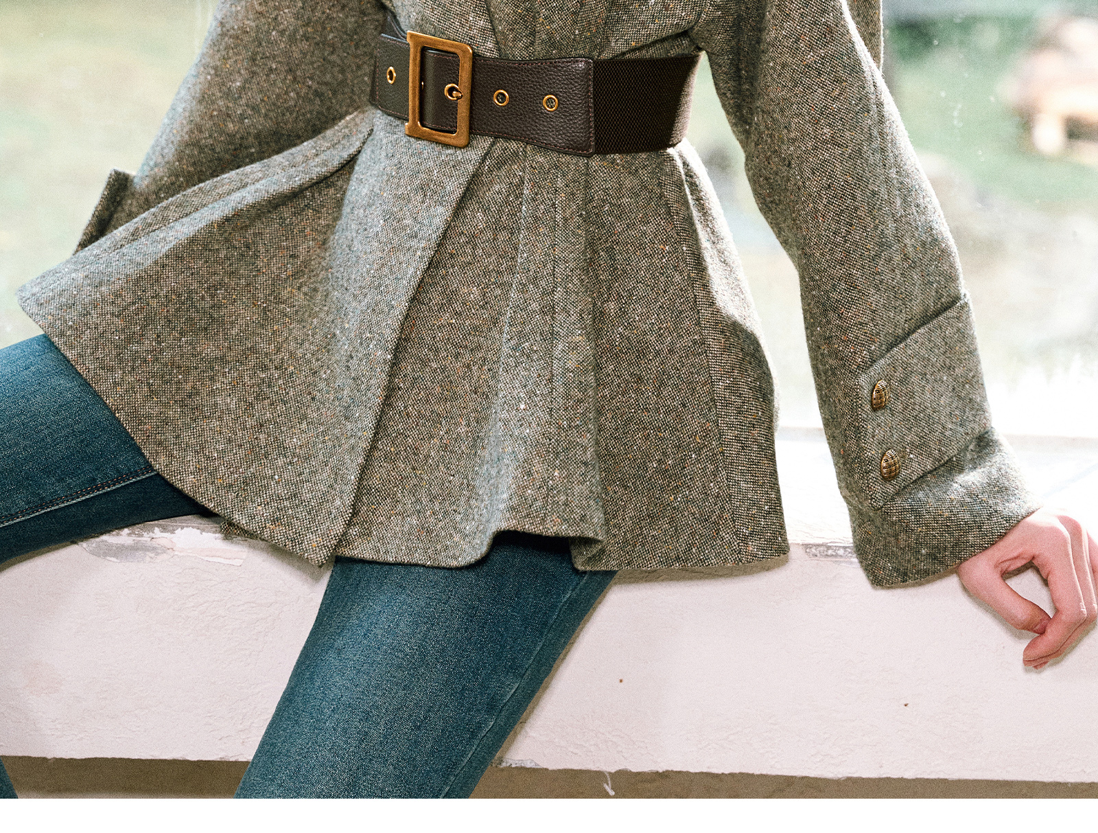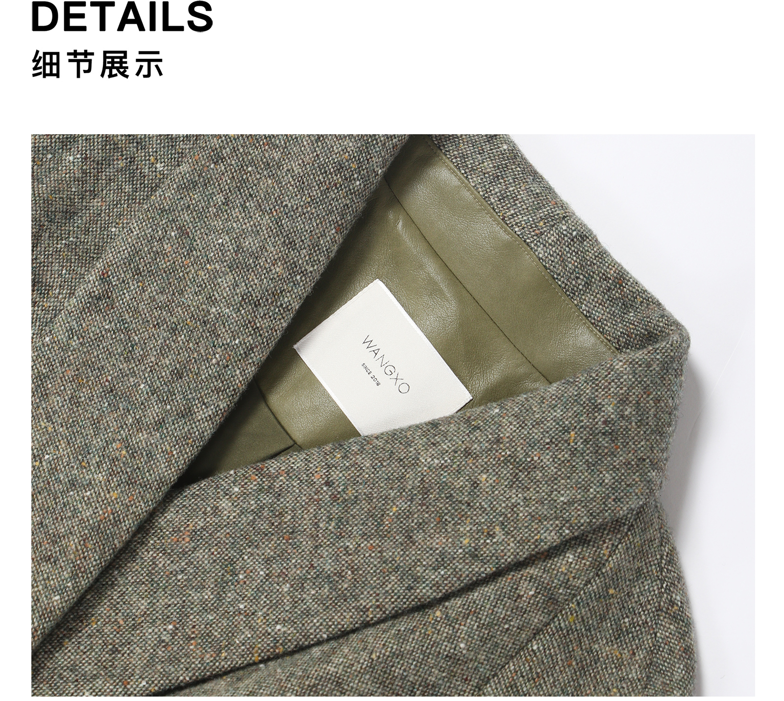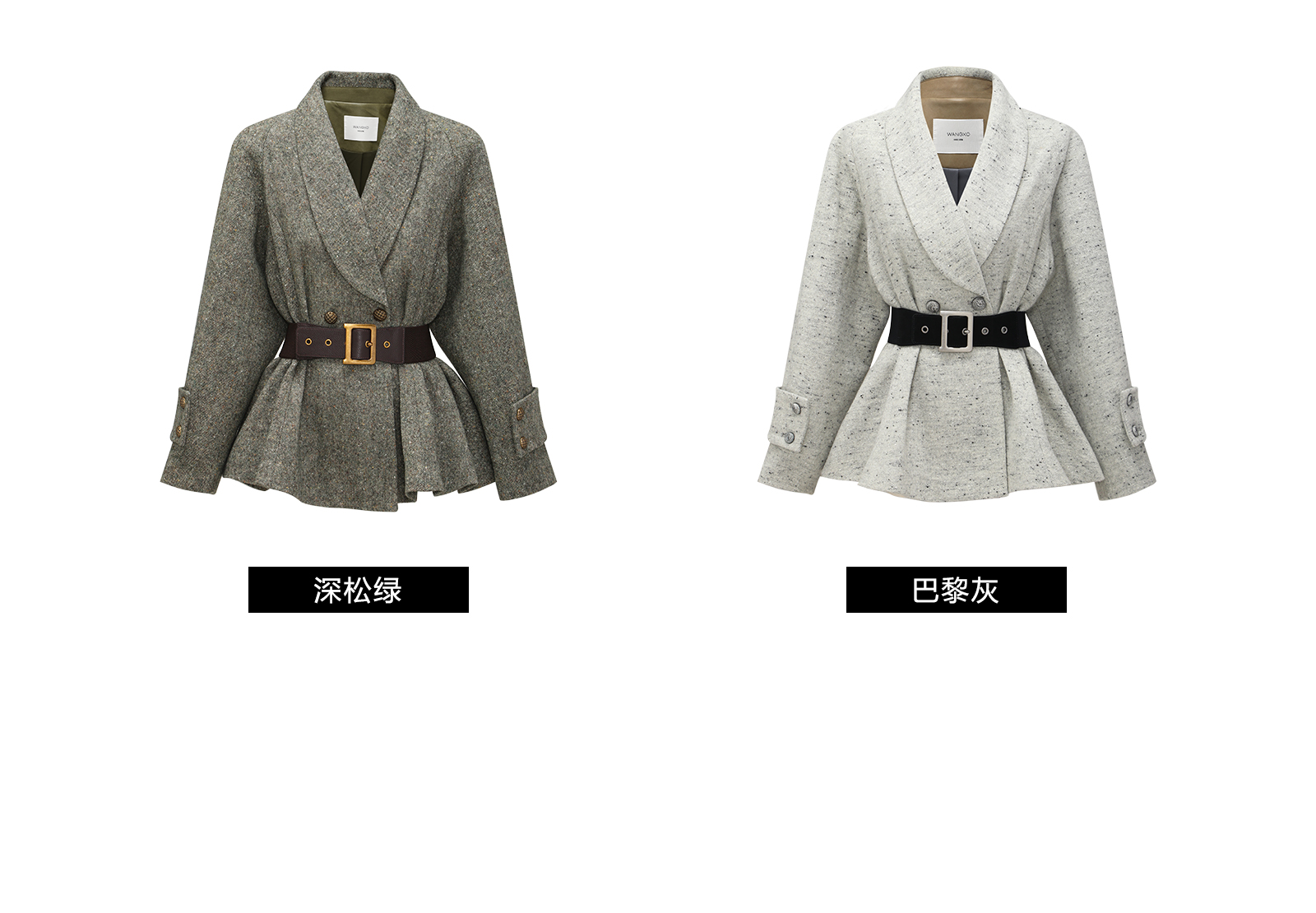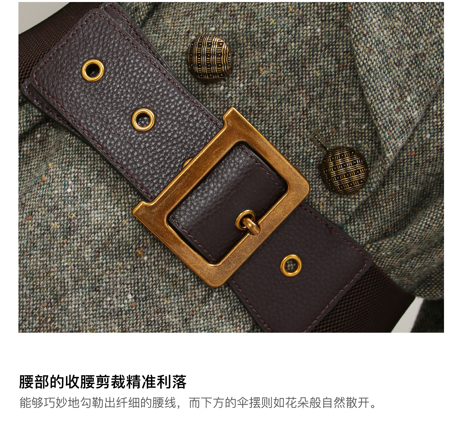 Wangxo|High-Proportion Wool Artistic Color Dots|Genuine Leather Belt Vintage Old Money Green Fruit Collar Umbrella Hem Coat