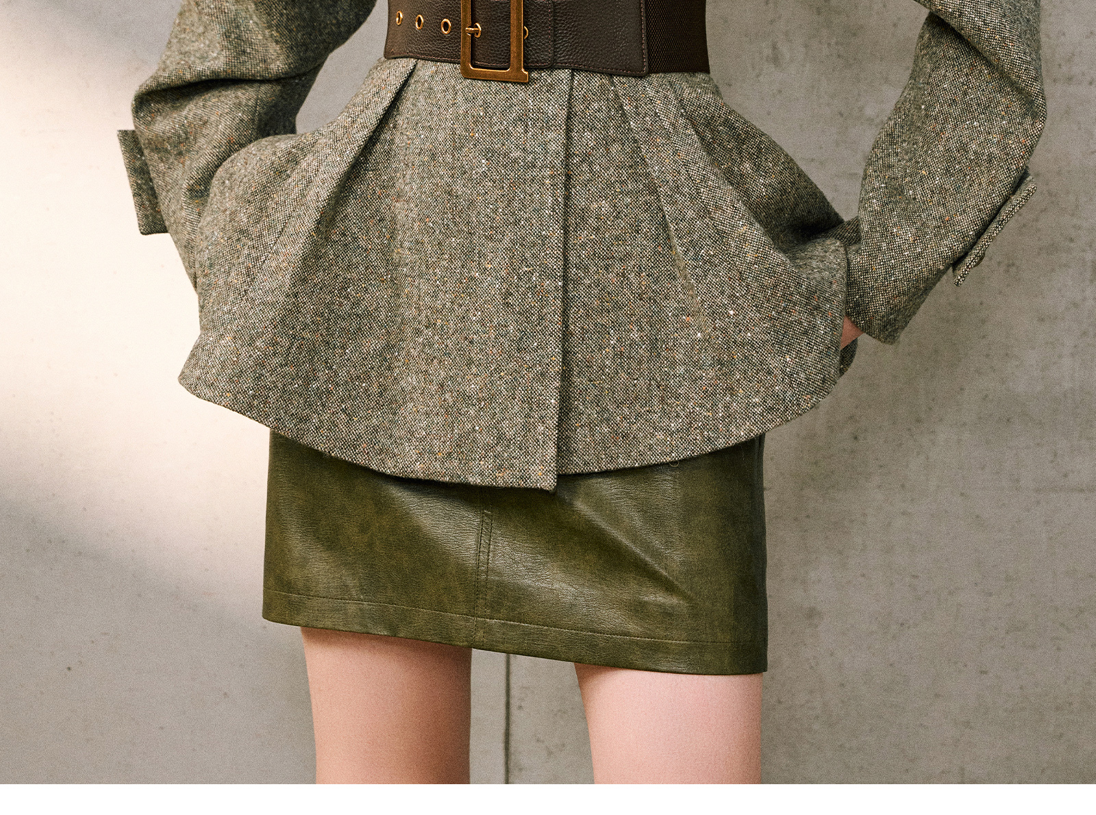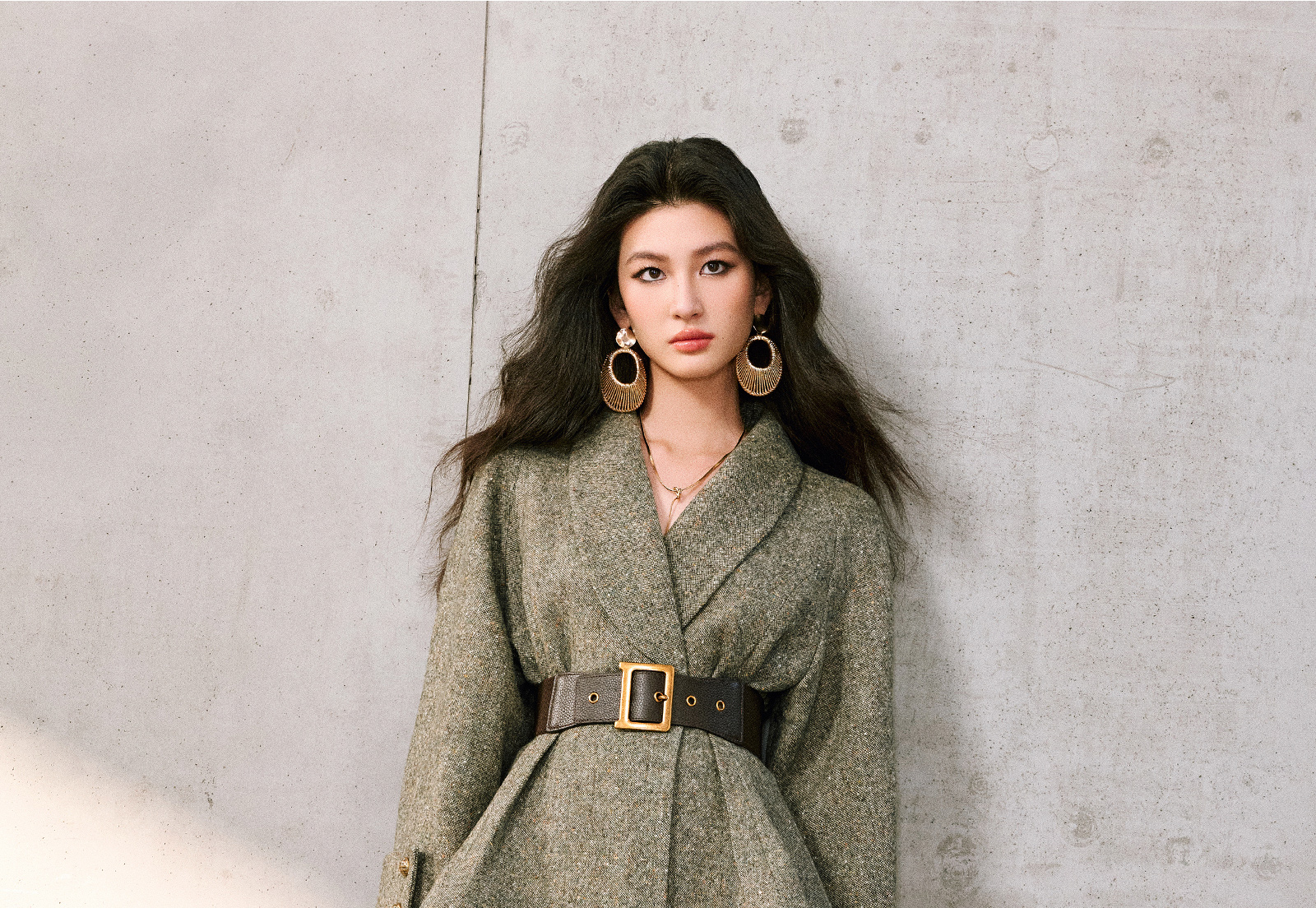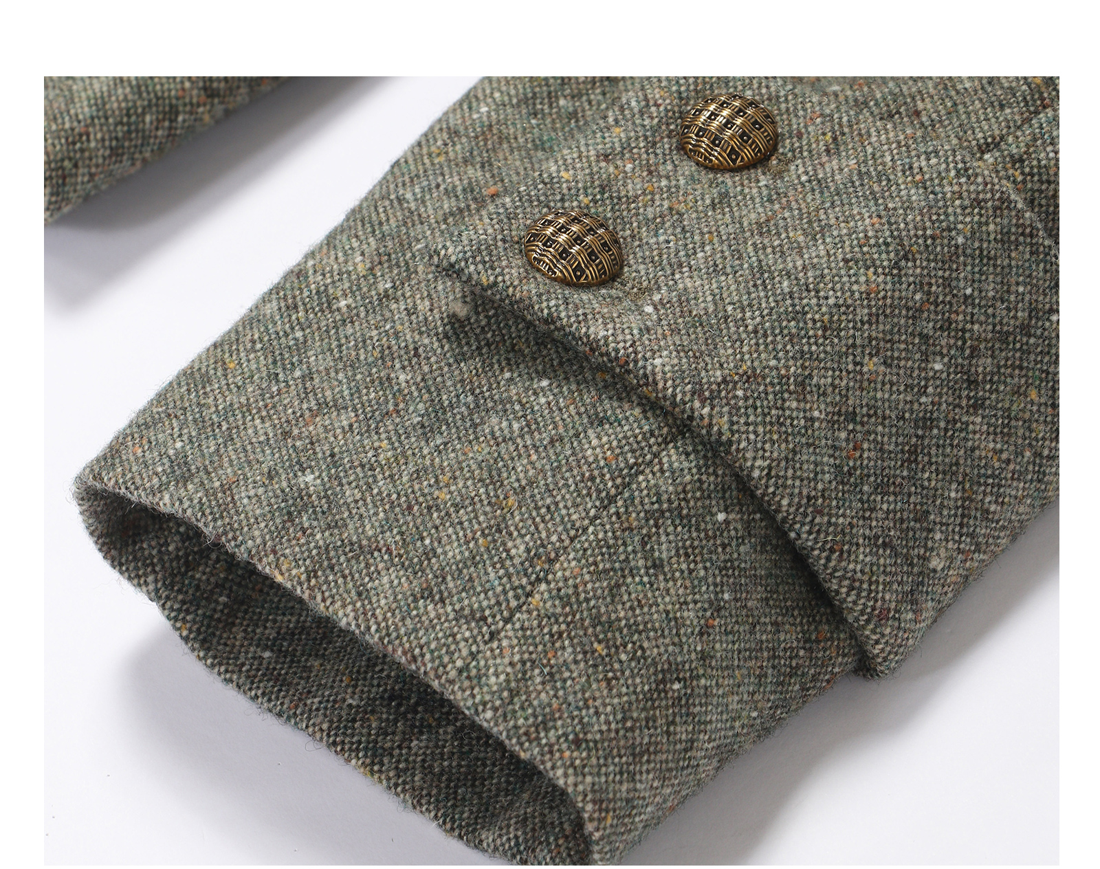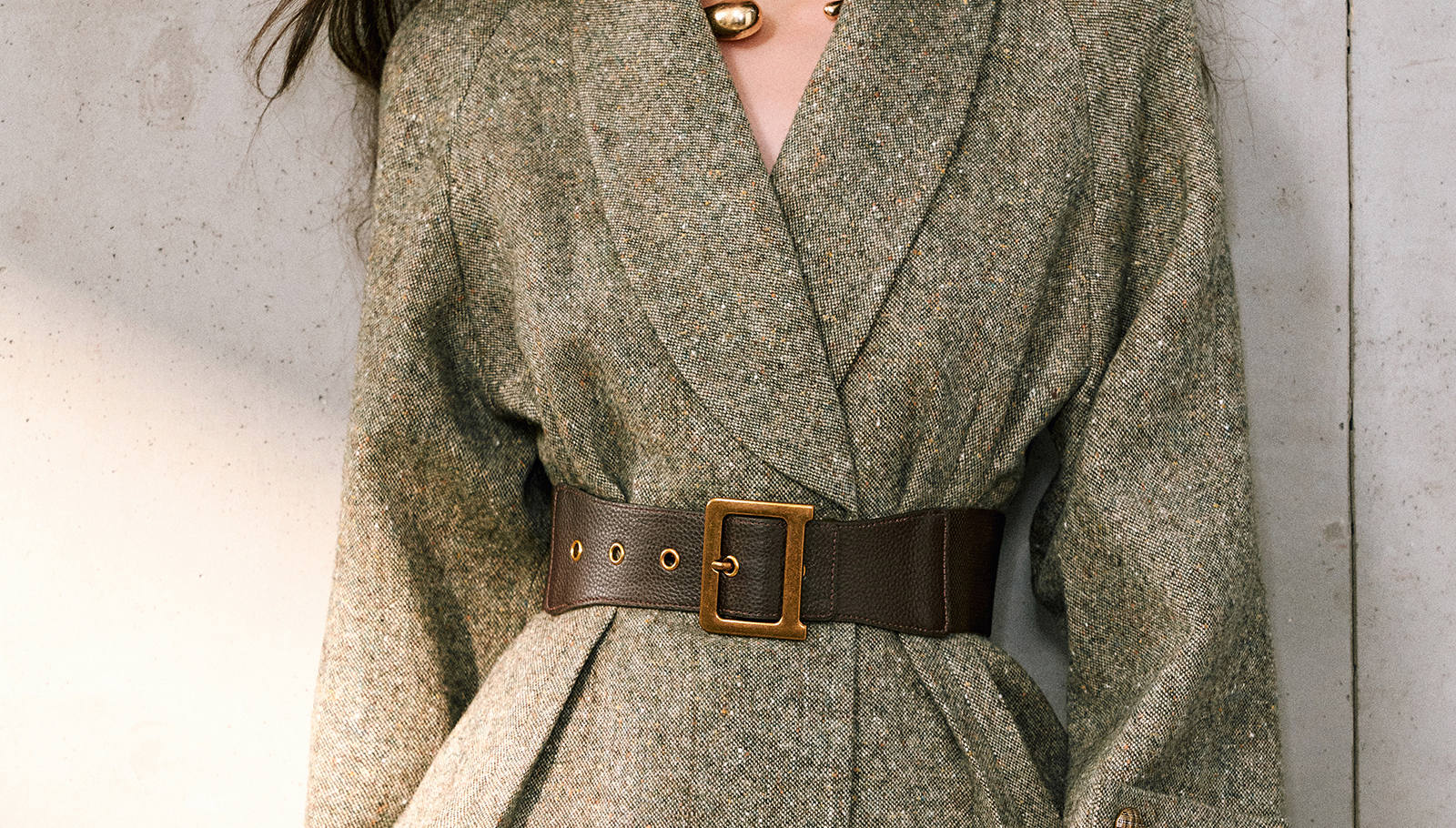 Wangxo|High-Proportion Wool Artistic Color Dots|Genuine Leather Belt Vintage Old Money Green Fruit Collar Umbrella Hem Coat