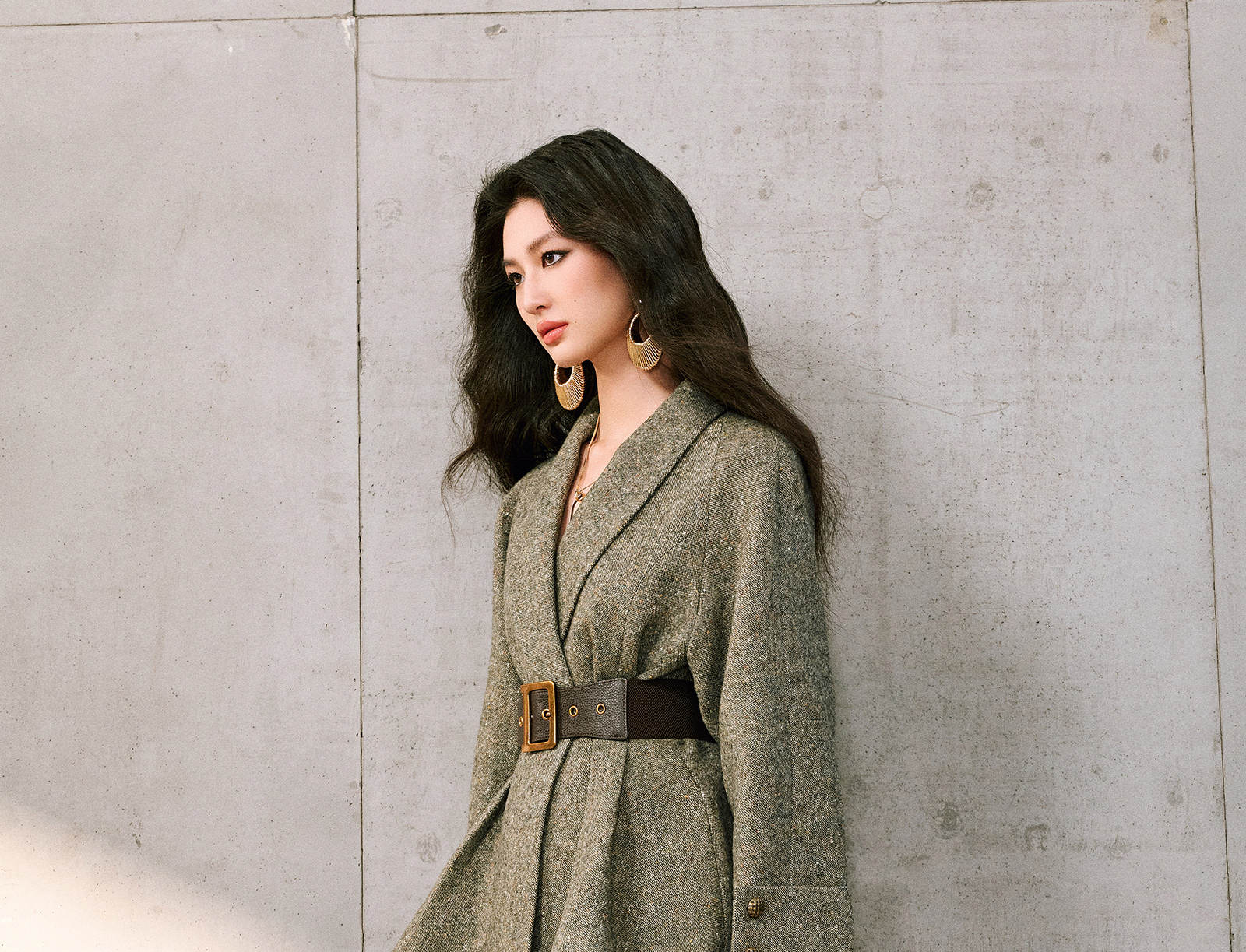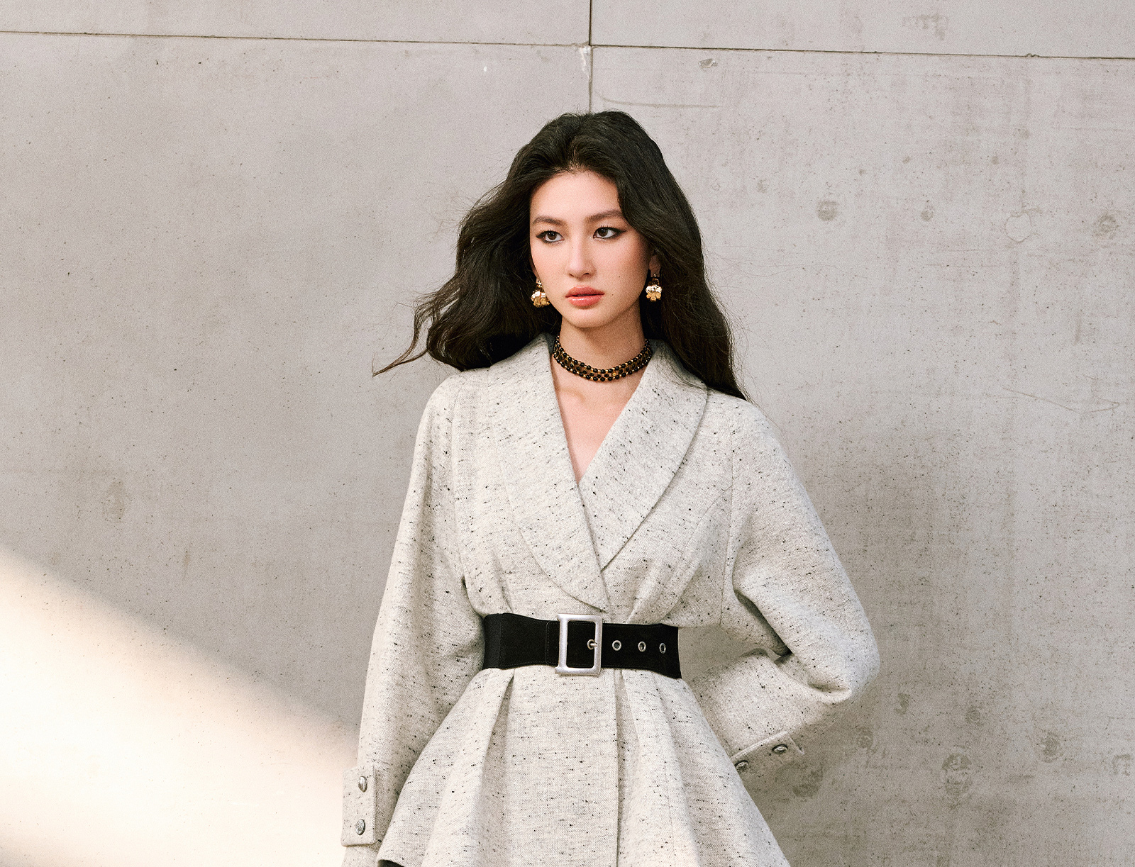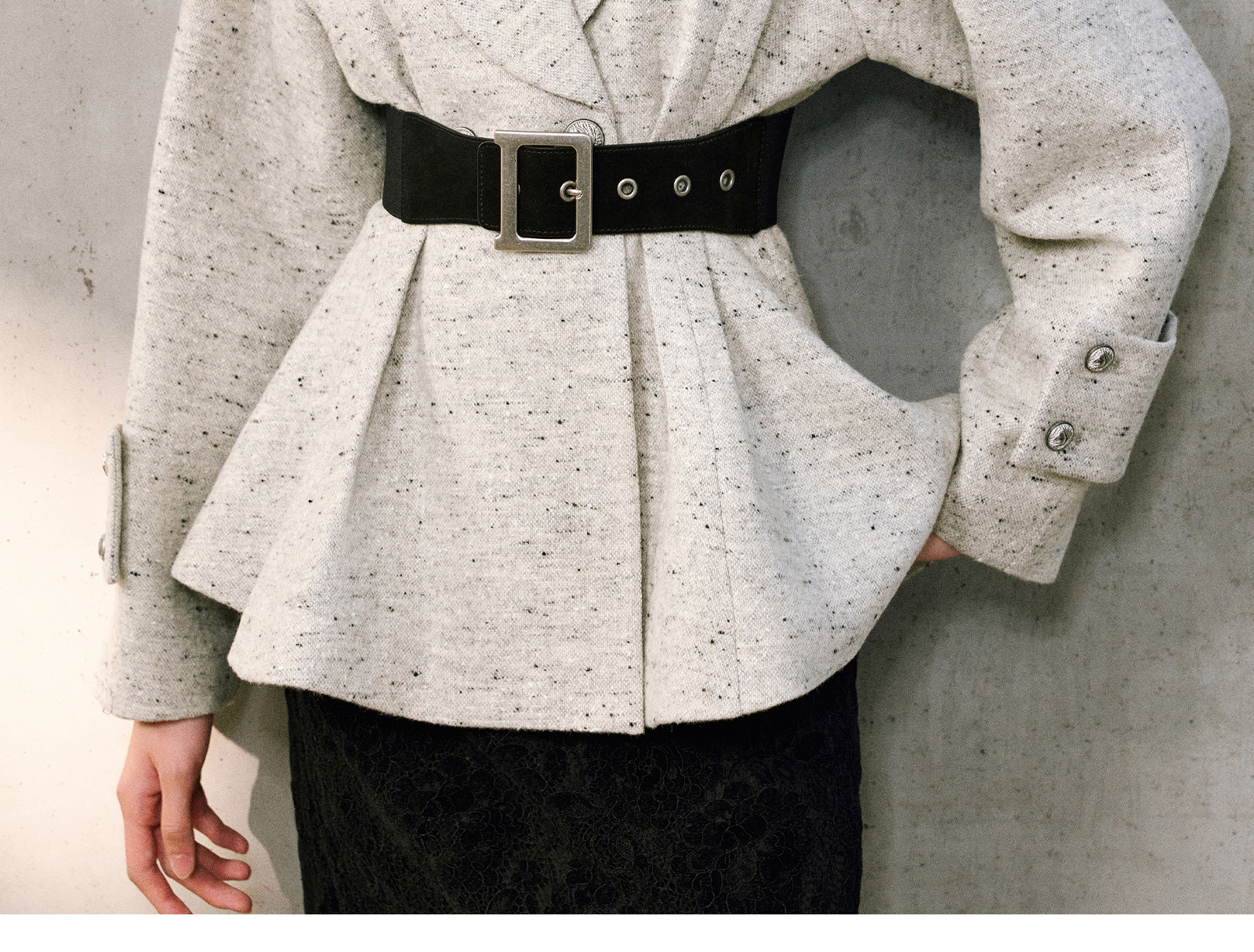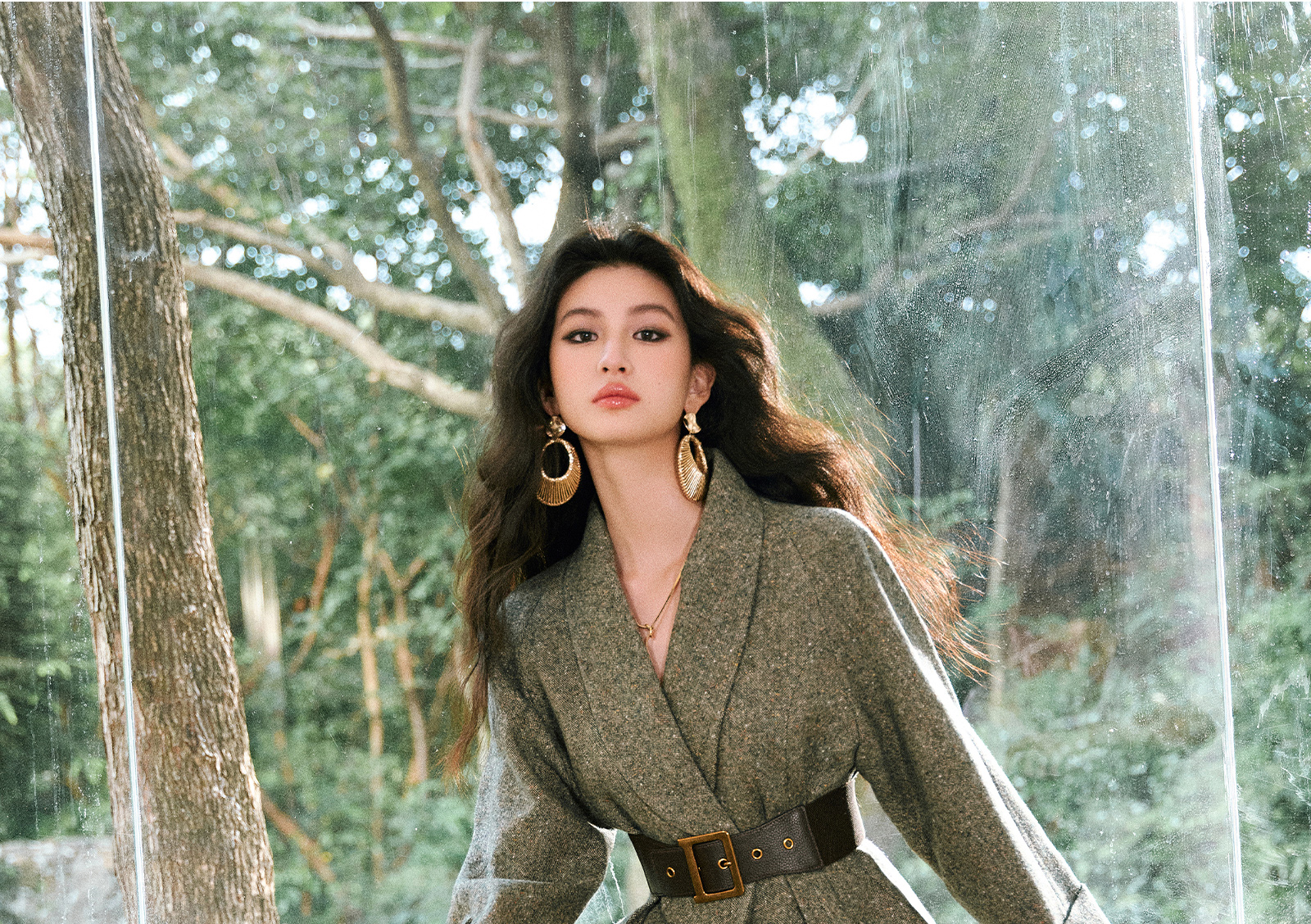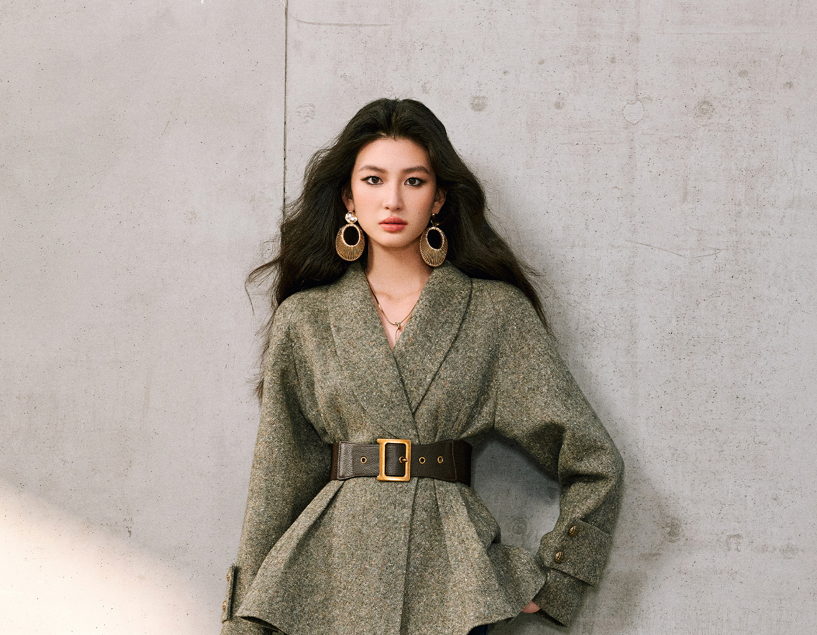 Wangxo|High-Proportion Wool Artistic Color Dots|Genuine Leather Belt Vintage Old Money Green Fruit Collar Umbrella Hem Coat