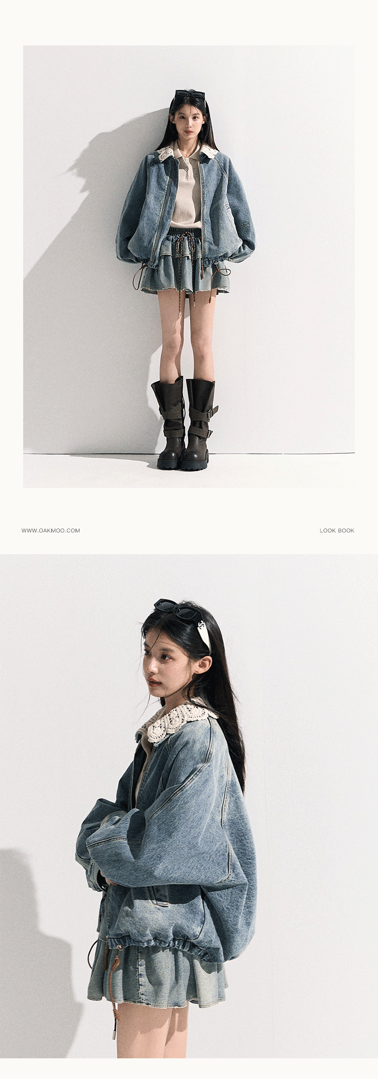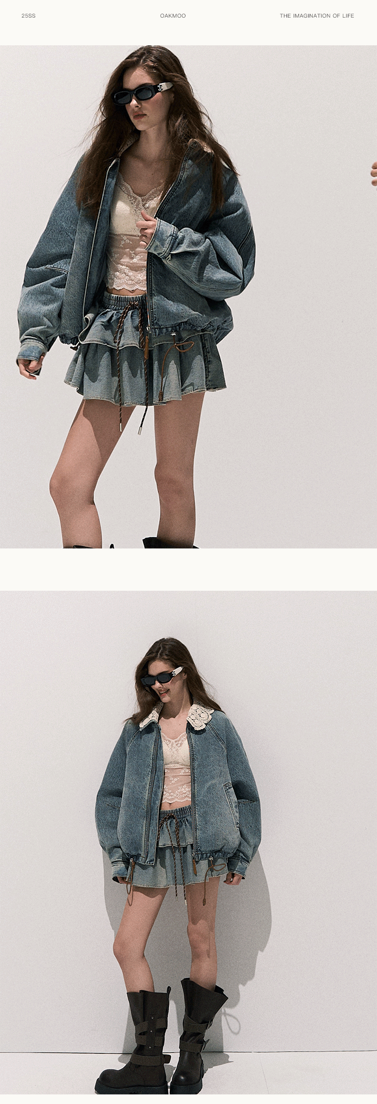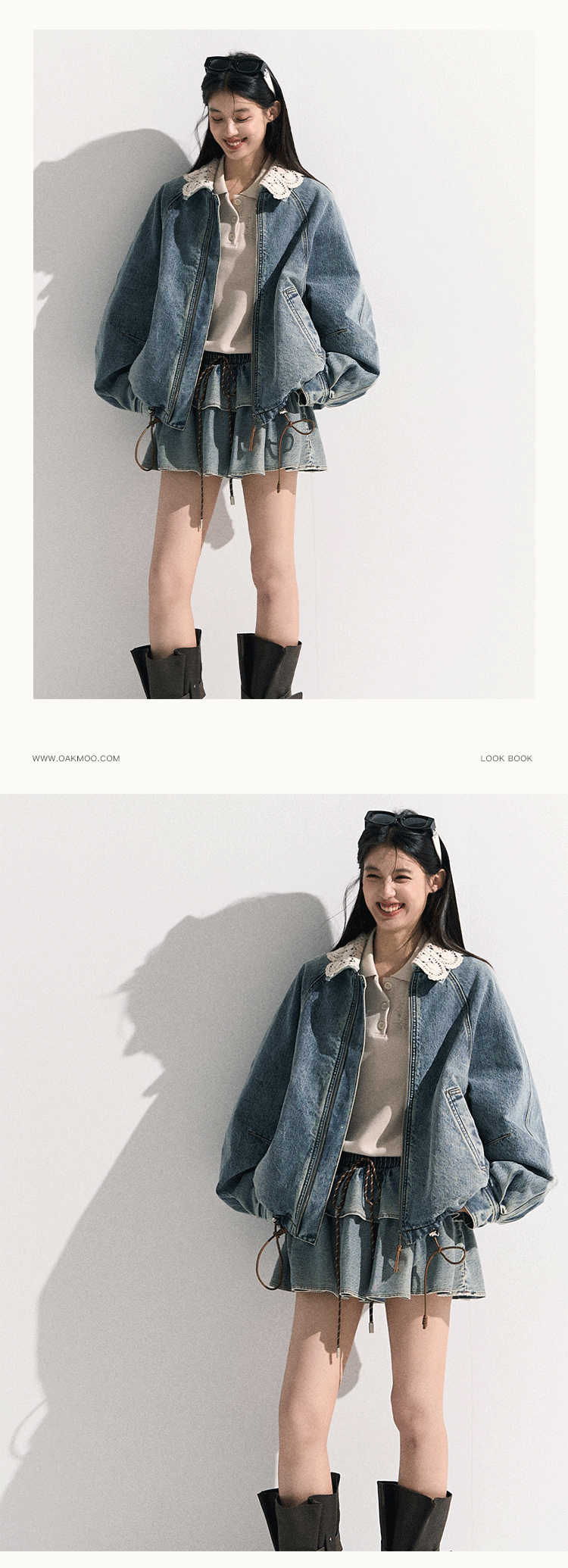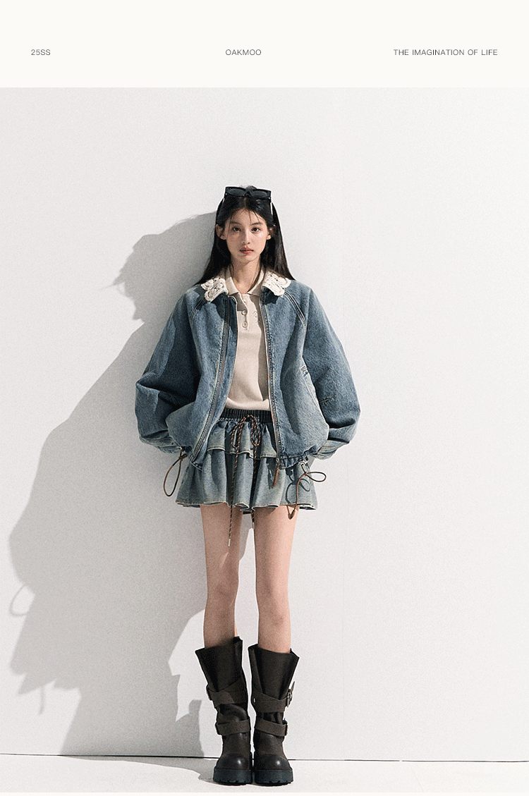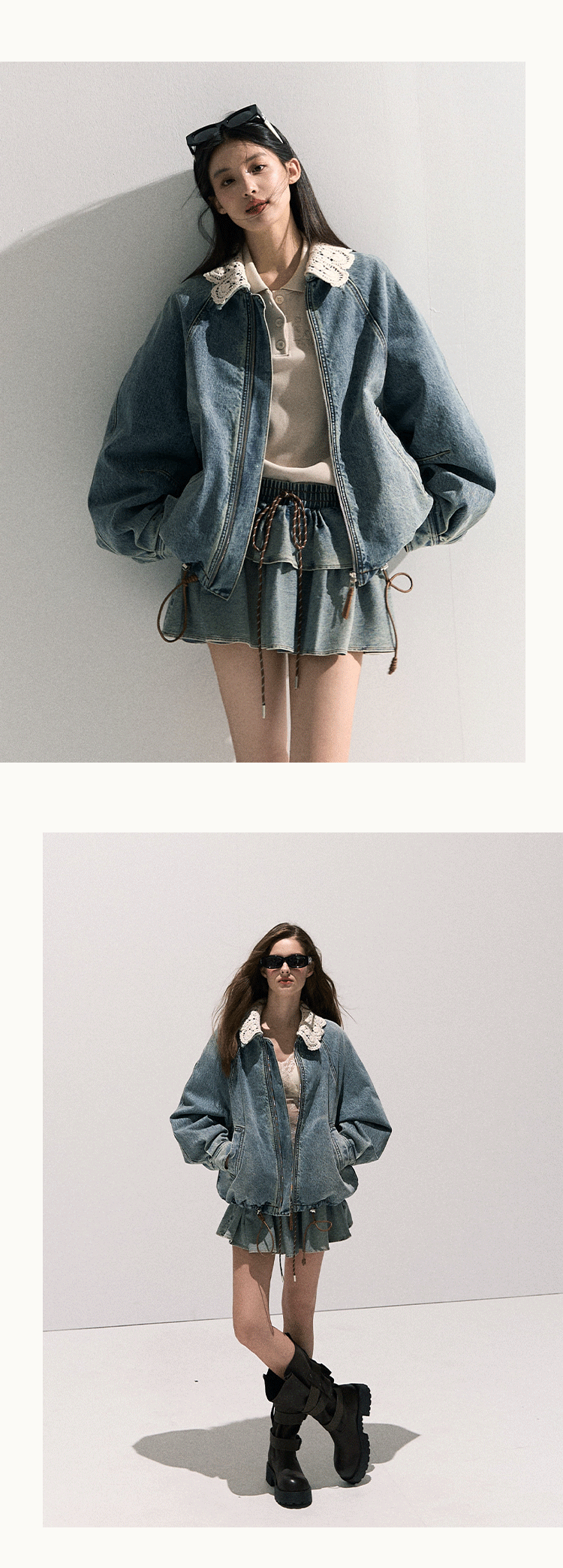 Oakmoo/ "When the Grapes Are Ripe" Handmade Crochet Flower Bud Denim Jacket Padded Coat Distressed Short Skirt Set