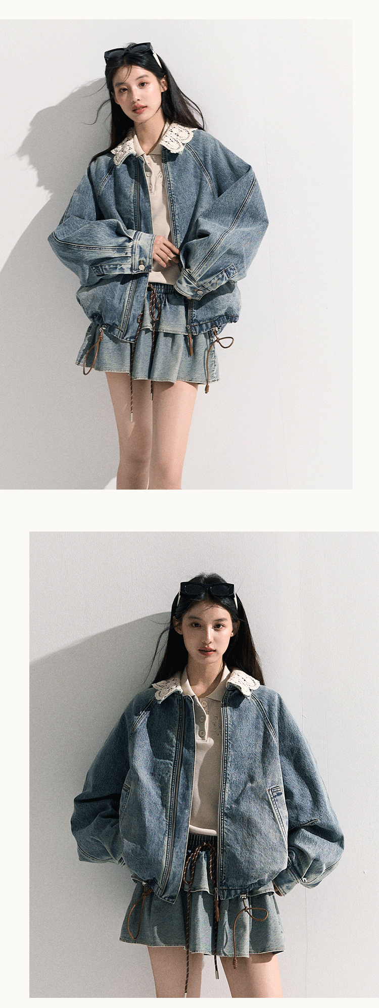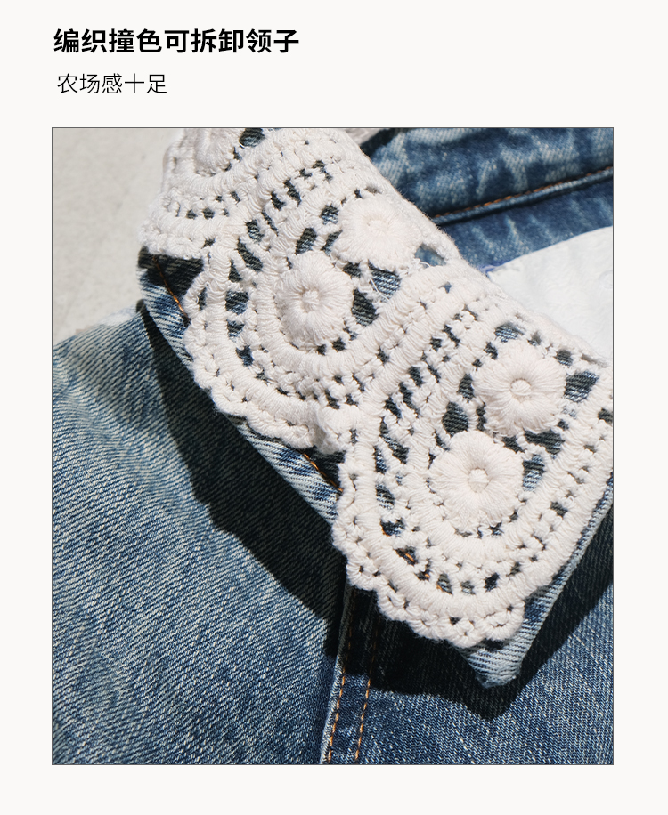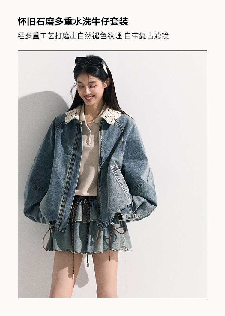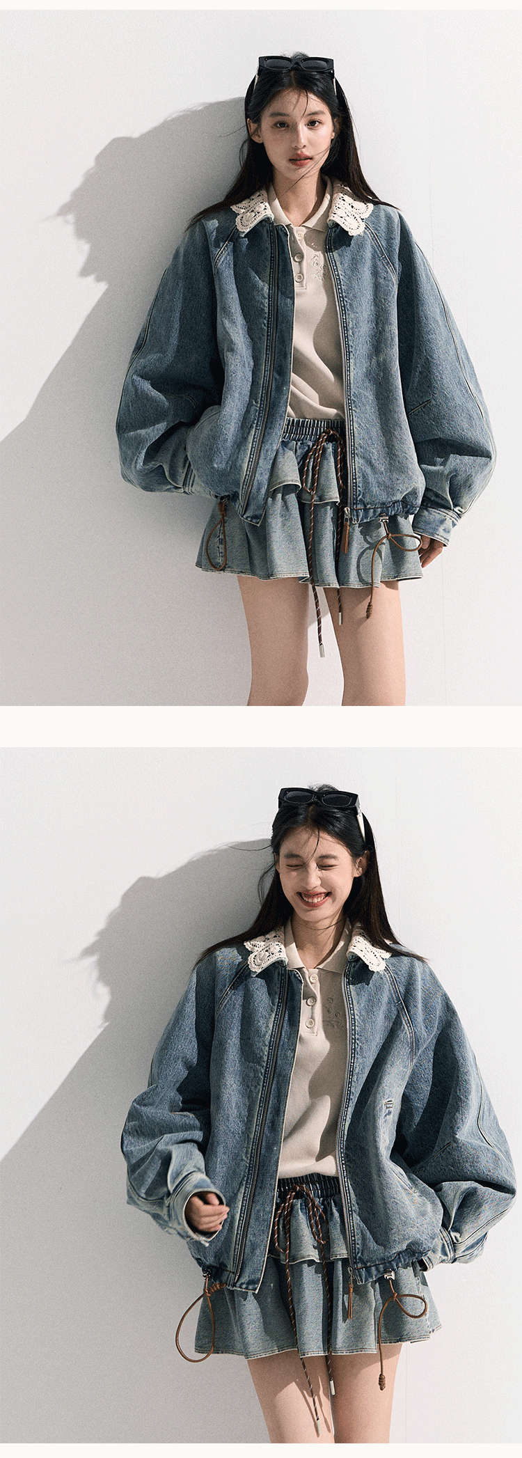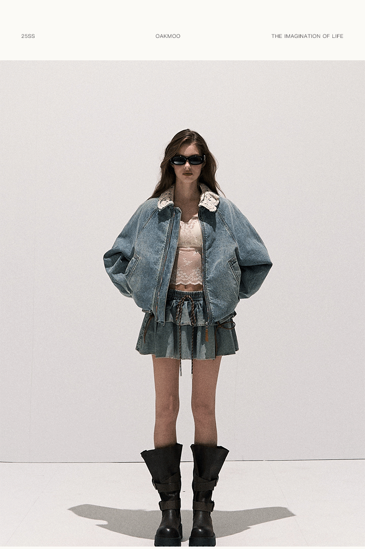 Oakmoo/ "When the Grapes Are Ripe" Handmade Crochet Flower Bud Denim Jacket Padded Coat Distressed Short Skirt Set