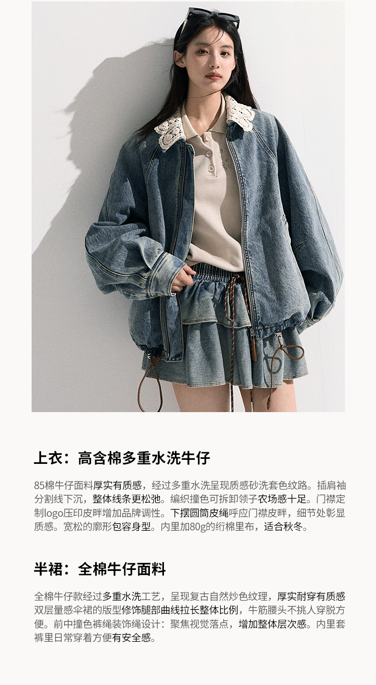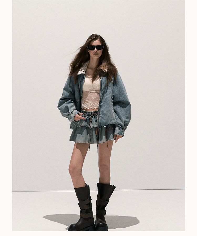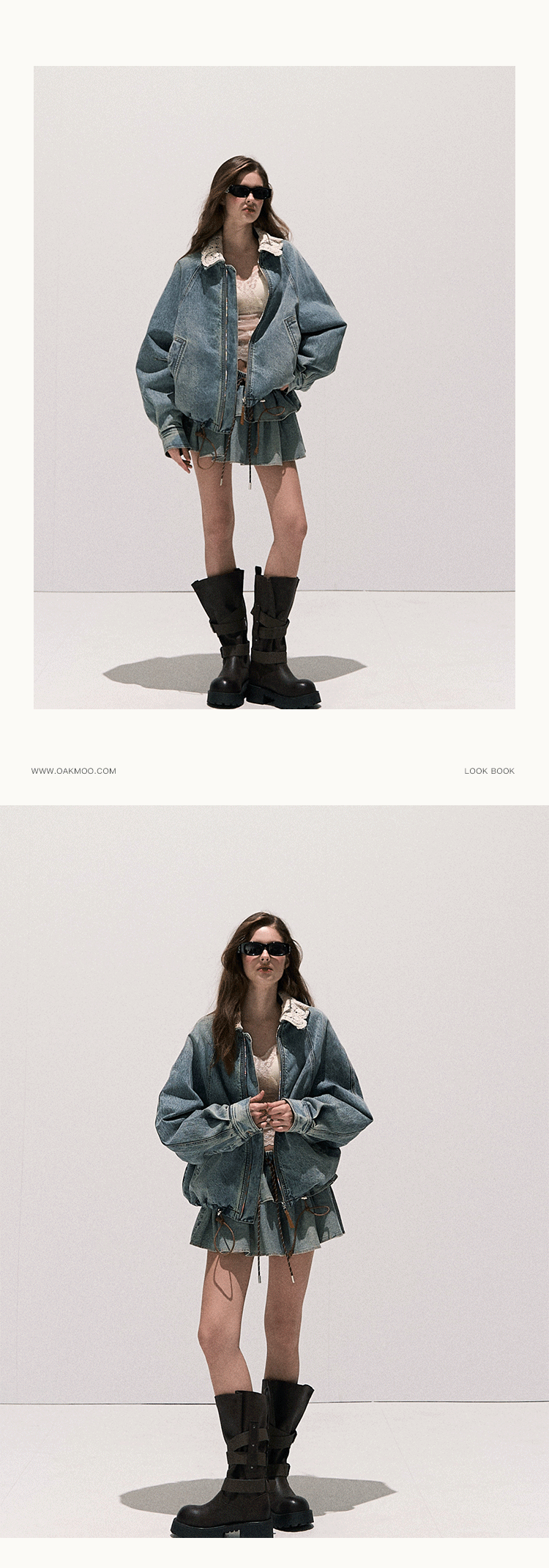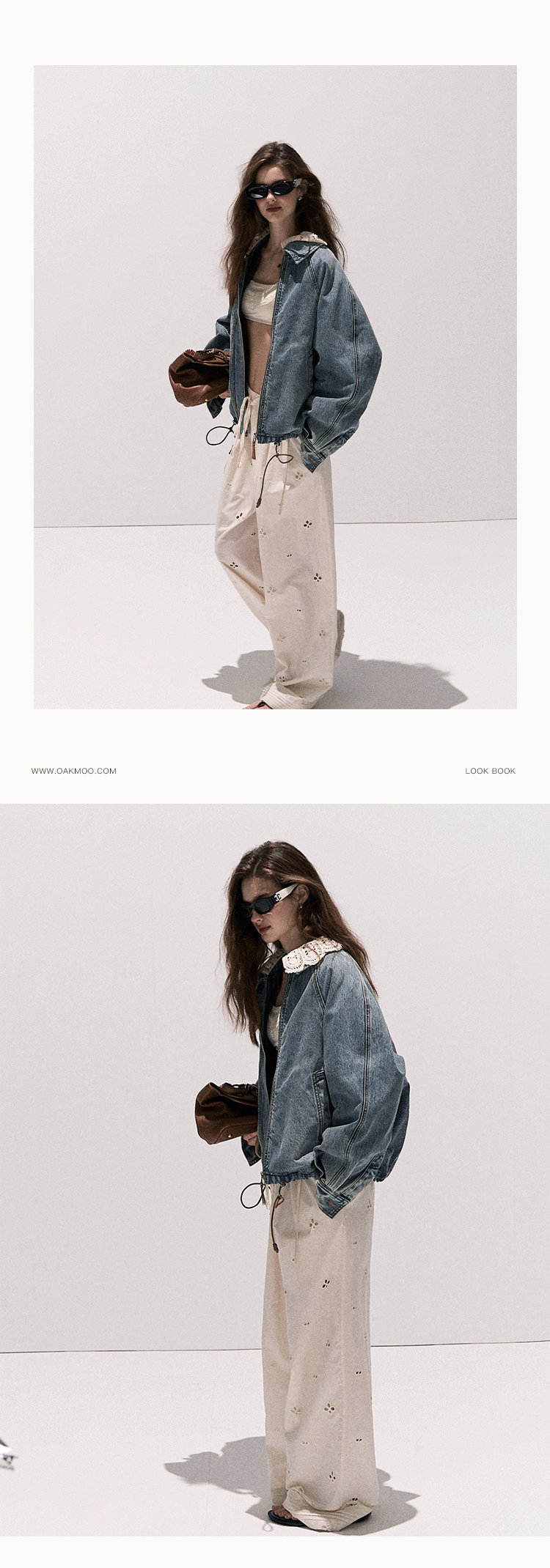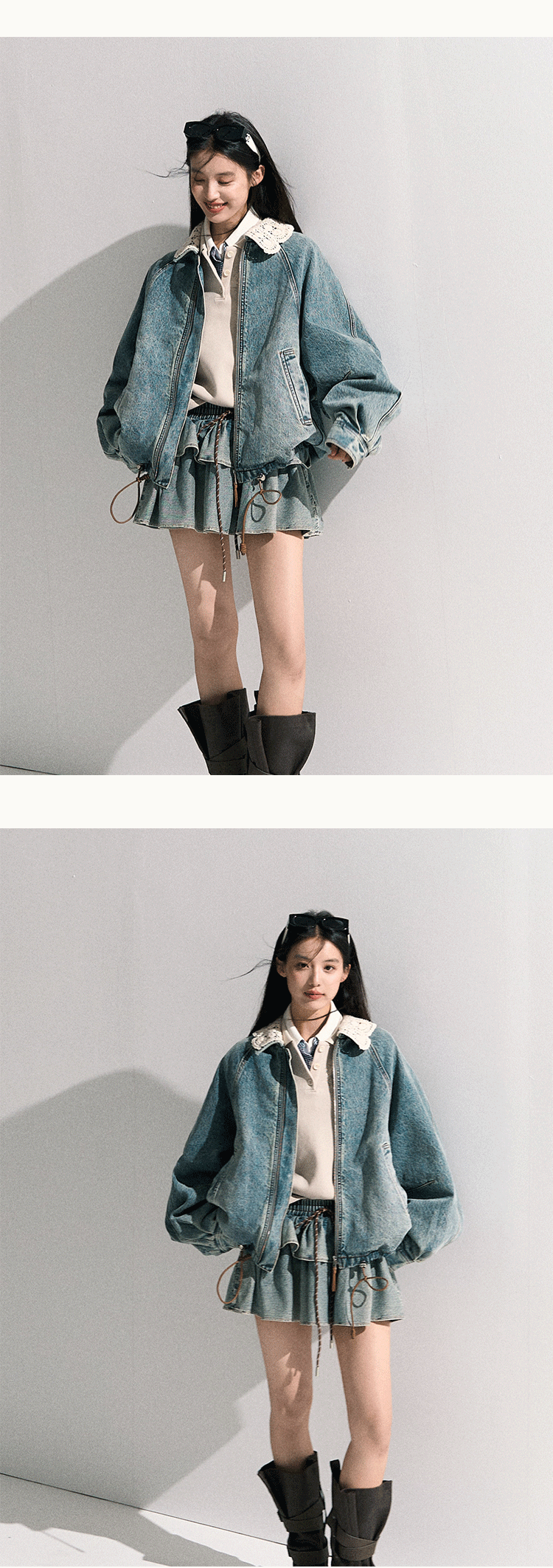 Oakmoo/ "When the Grapes Are Ripe" Handmade Crochet Flower Bud Denim Jacket Padded Coat Distressed Short Skirt Set
