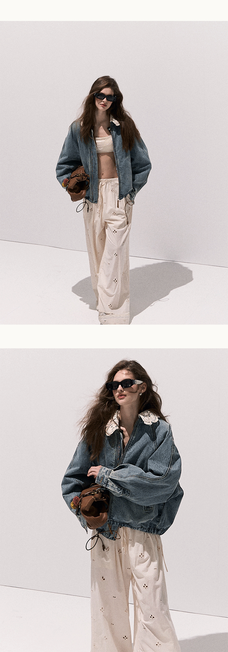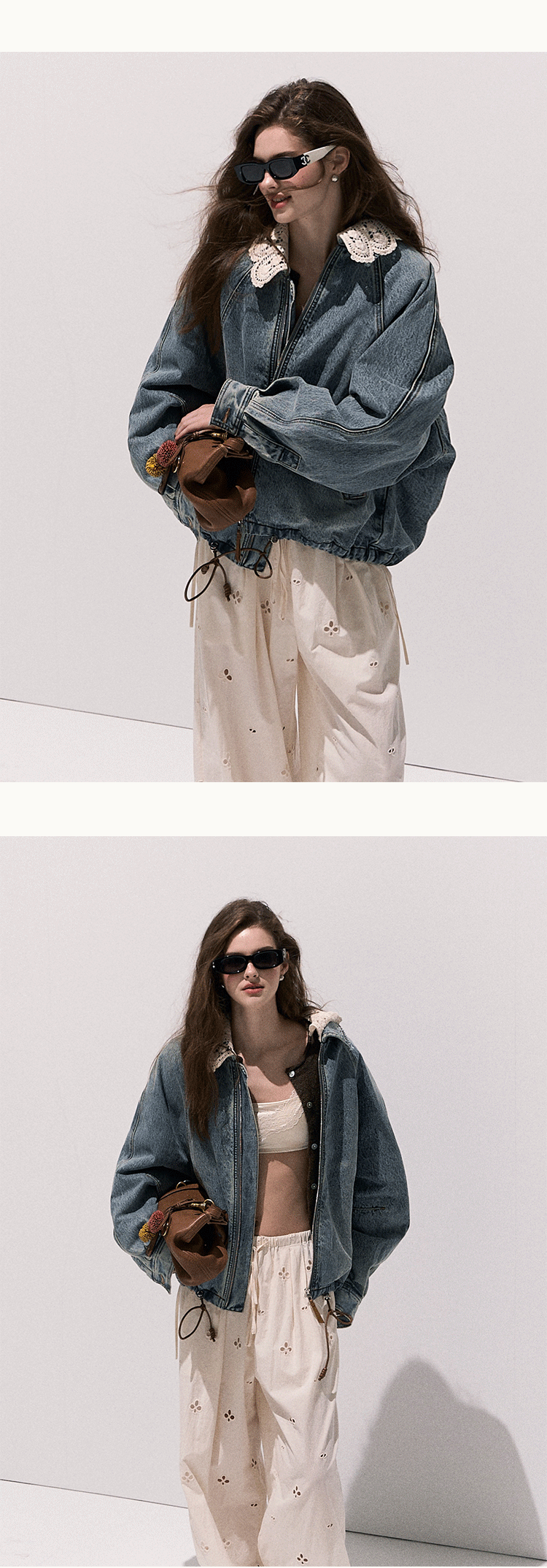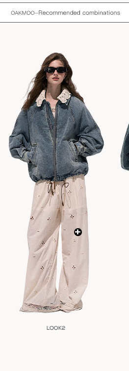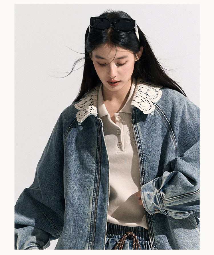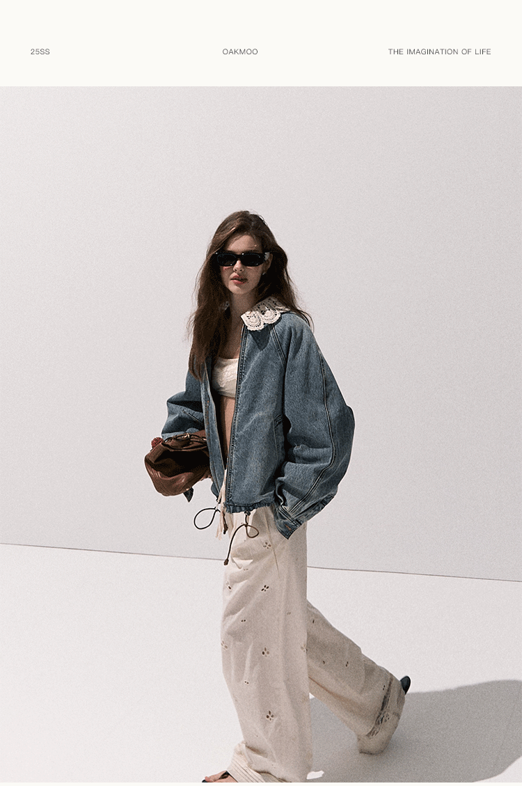 Oakmoo/ "When the Grapes Are Ripe" Handmade Crochet Flower Bud Denim Jacket Padded Coat Distressed Short Skirt Set