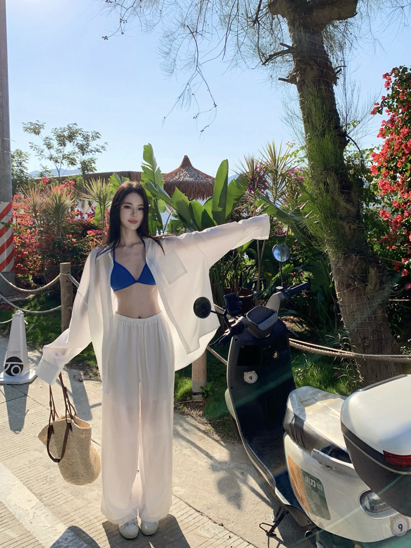 Thai Seaside Resort Style White Shirt for Women, Loose Casual Long-Sleeved Sun Protection Shirt, Island Bikini Three-Piece Set