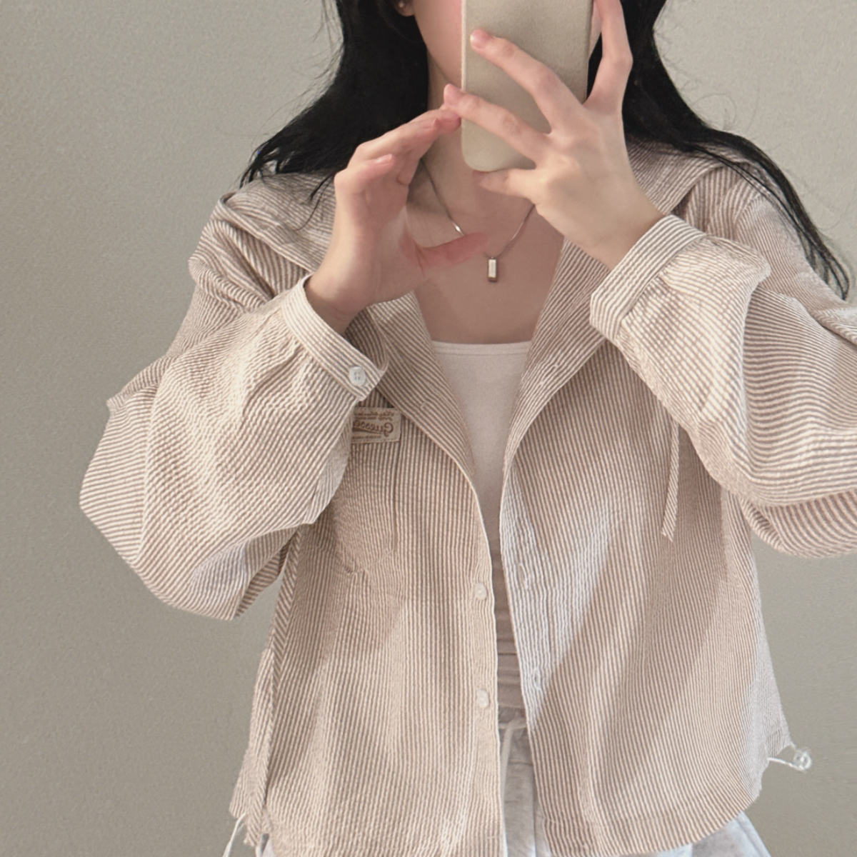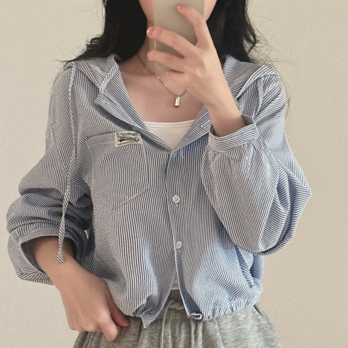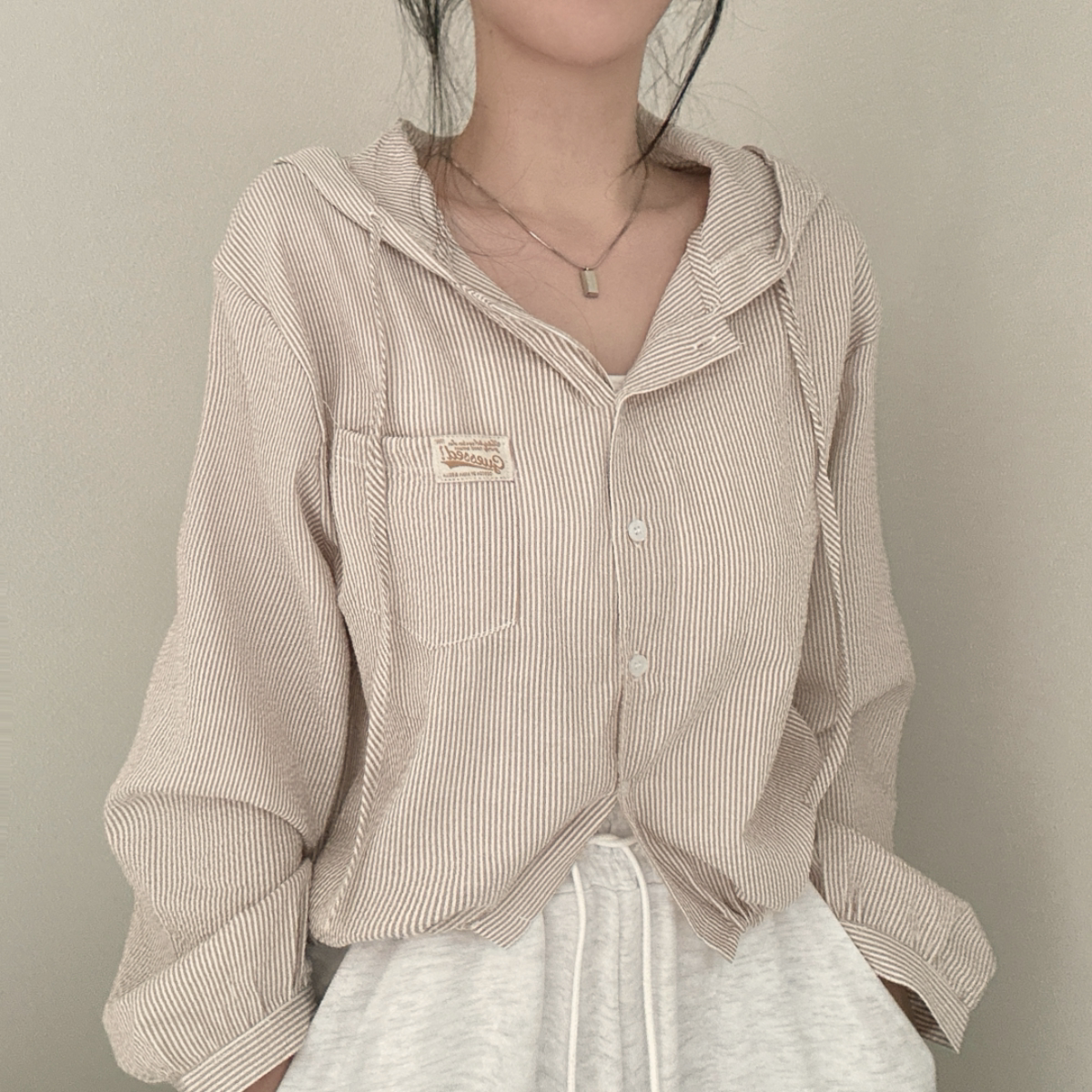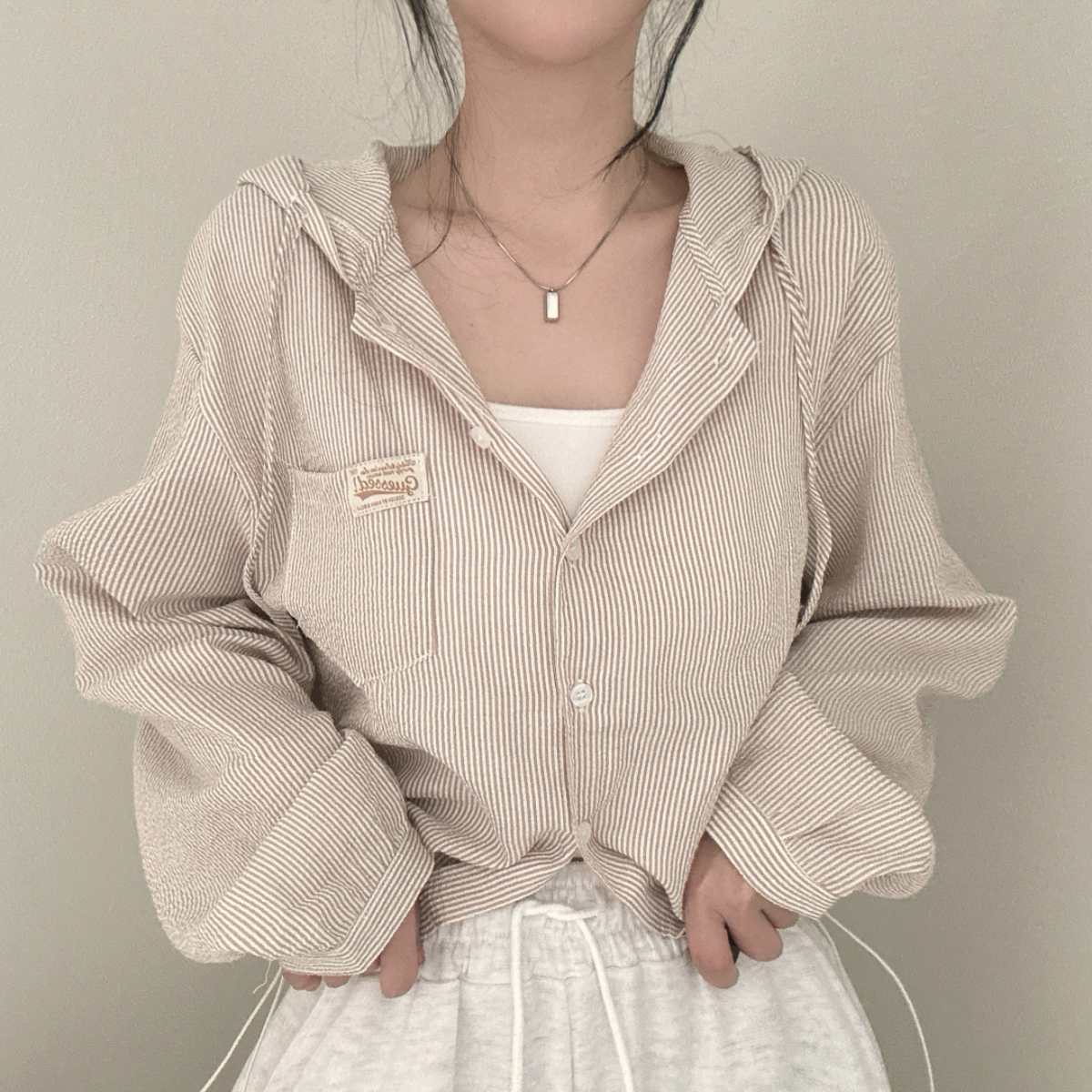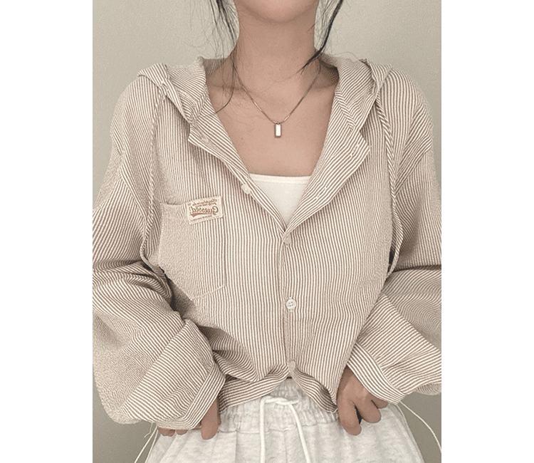 Korean Chic Spring New Vintage Style Letter Patch Pocket Long-Sleeve Striped Hooded Shirt Jacket for Women