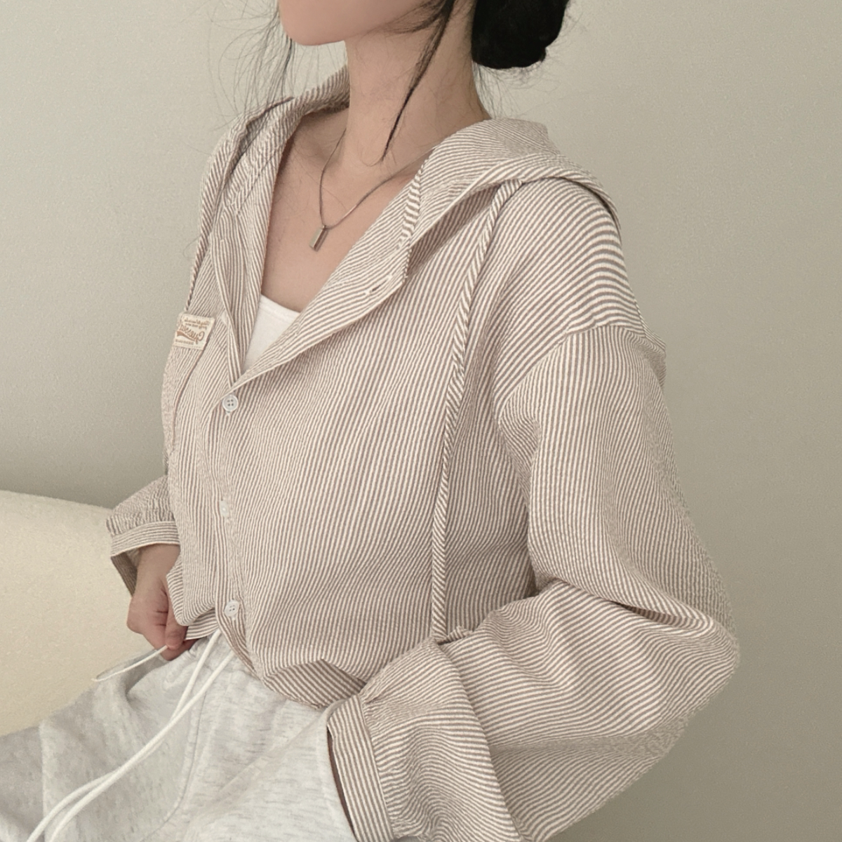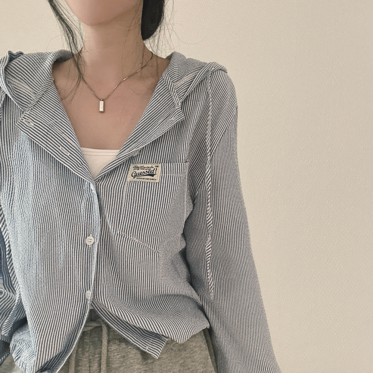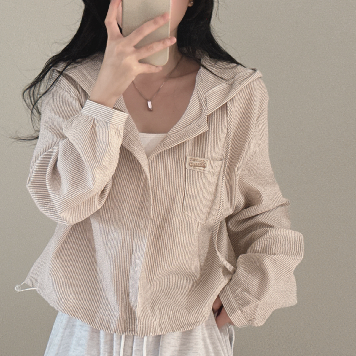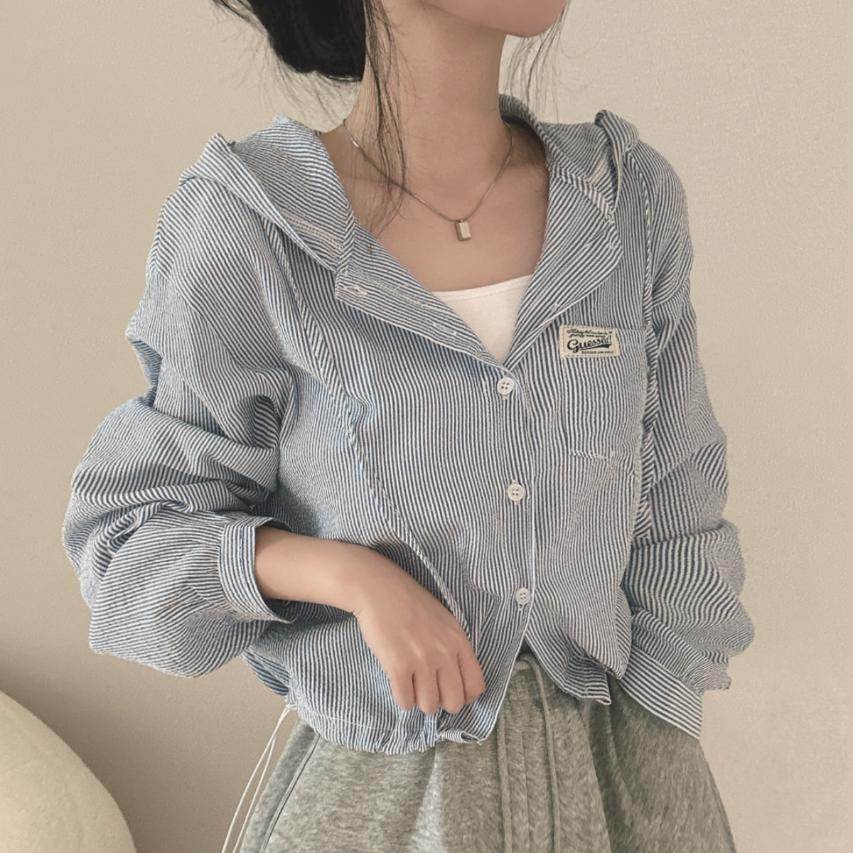 Korean Chic Spring New Vintage Style Letter Patch Pocket Long-Sleeve Striped Hooded Shirt Jacket for Women