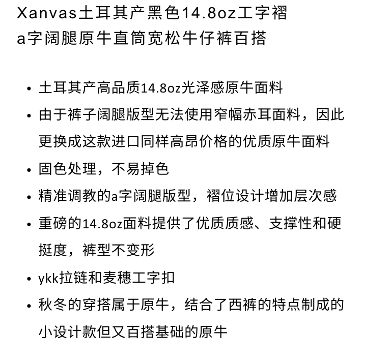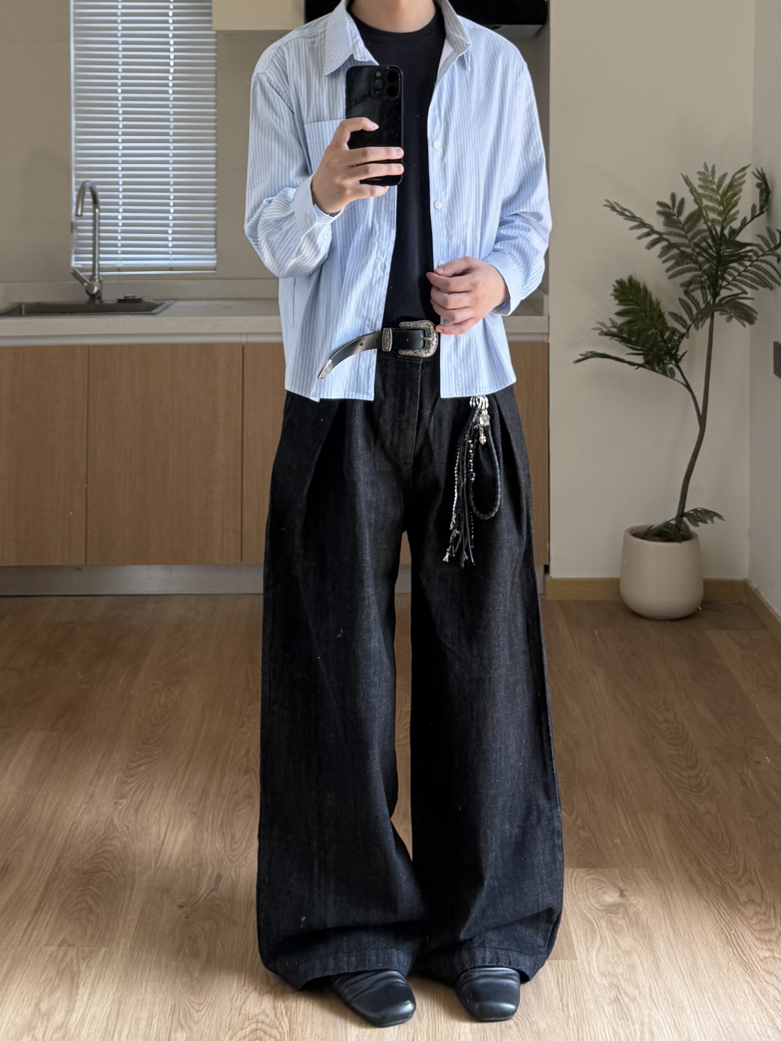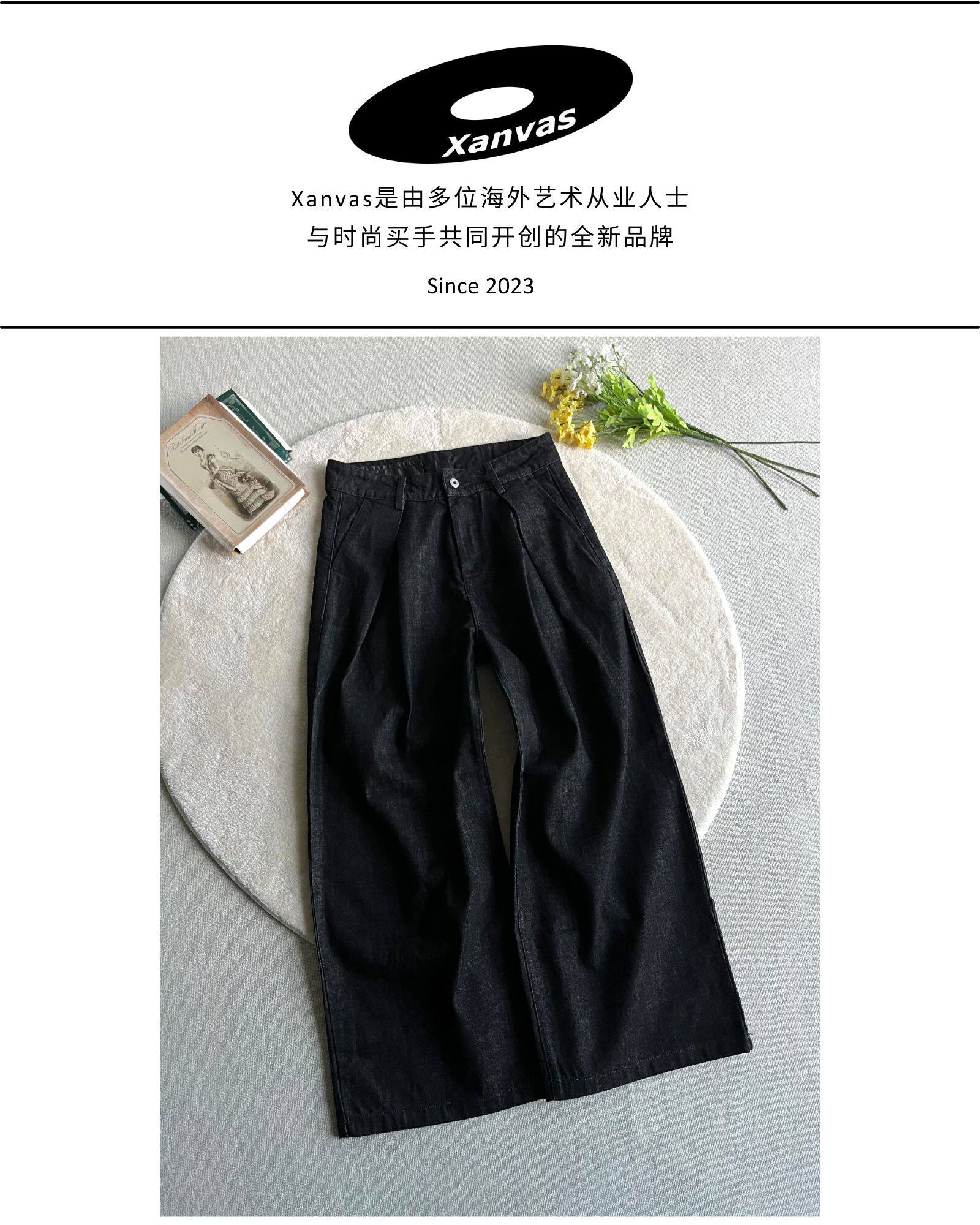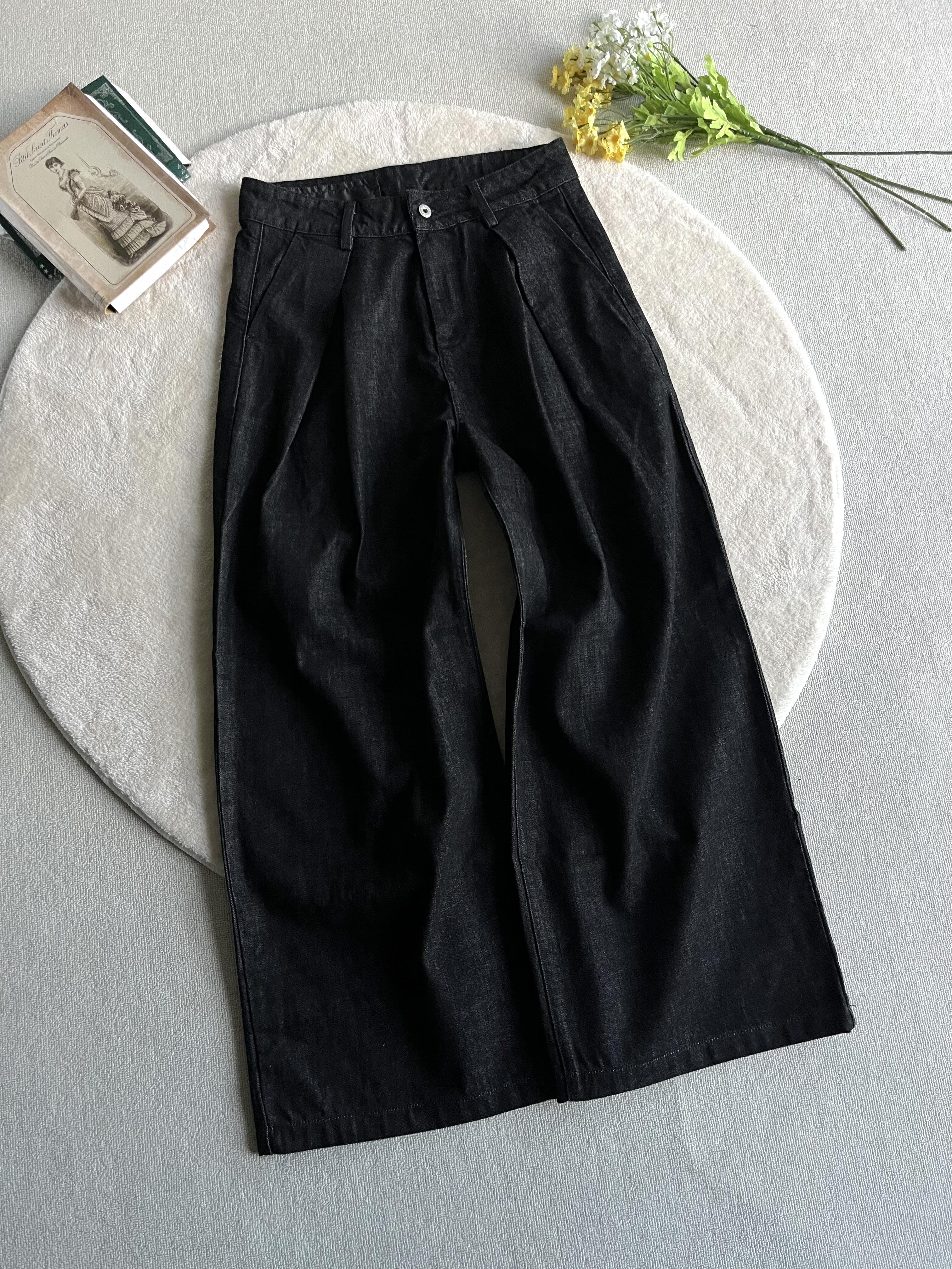 Xanvas Turkish-Made Black 14.8oz Pleated A-Line Wide-Leg Raw Denim Straight Loose Jeans Versatile