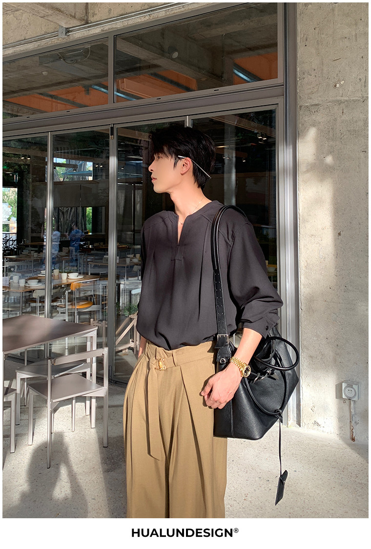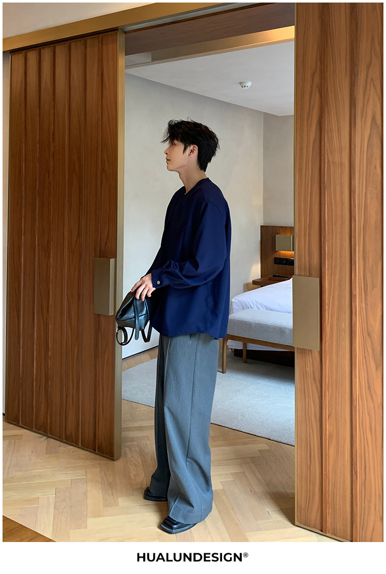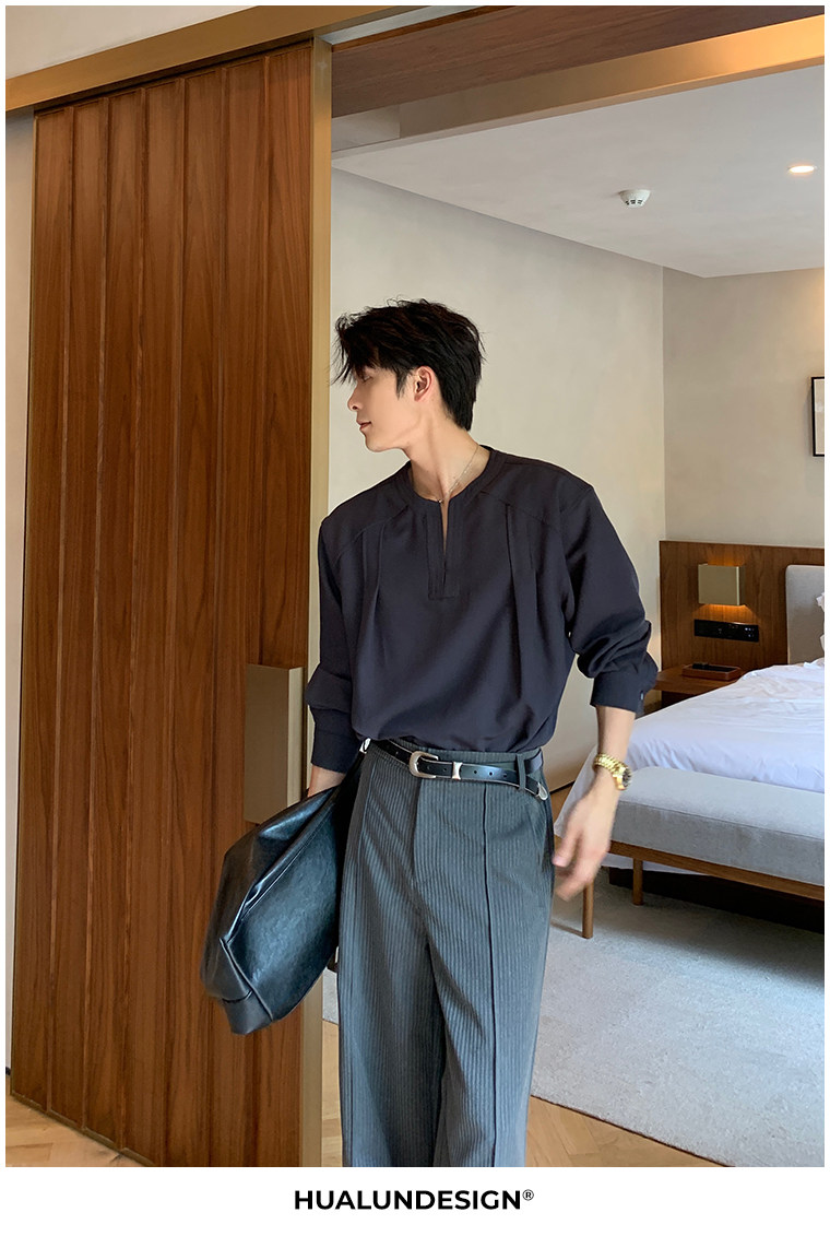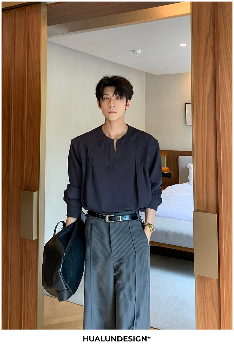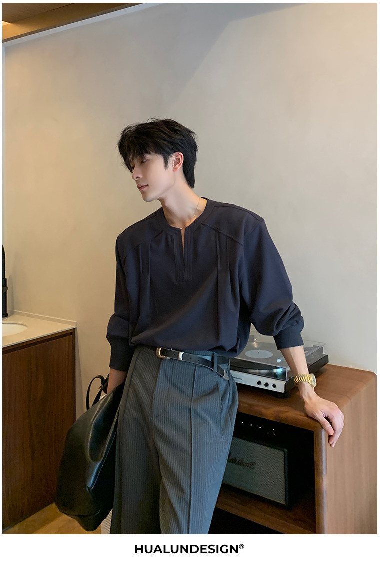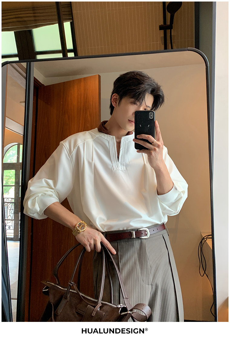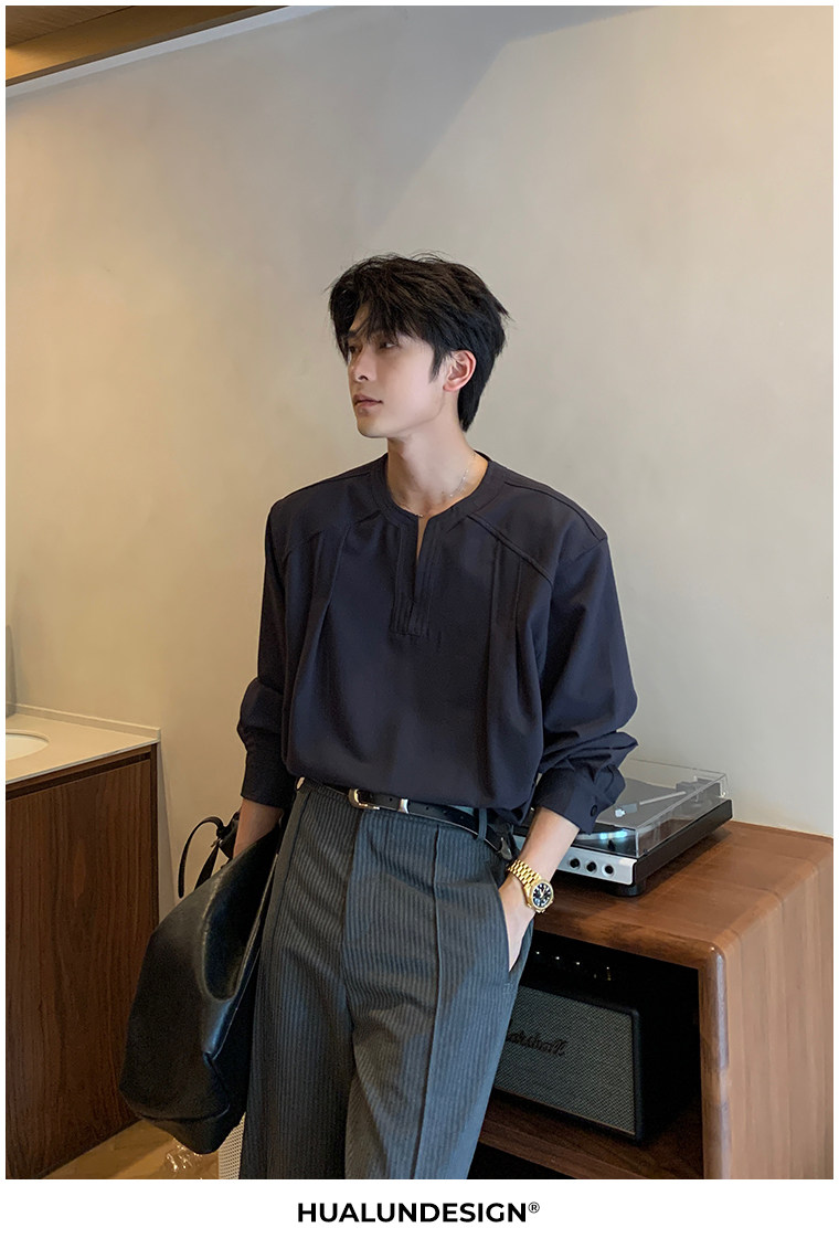 Hualun Autumn and Winter V Neck Loose Shirt for Men, Gray Inner Layering Shirt, Men's Cleanfit Long-Sleeved Shirt