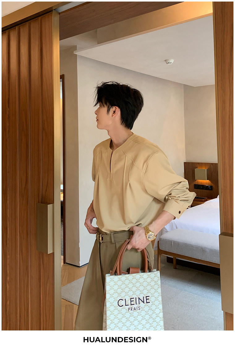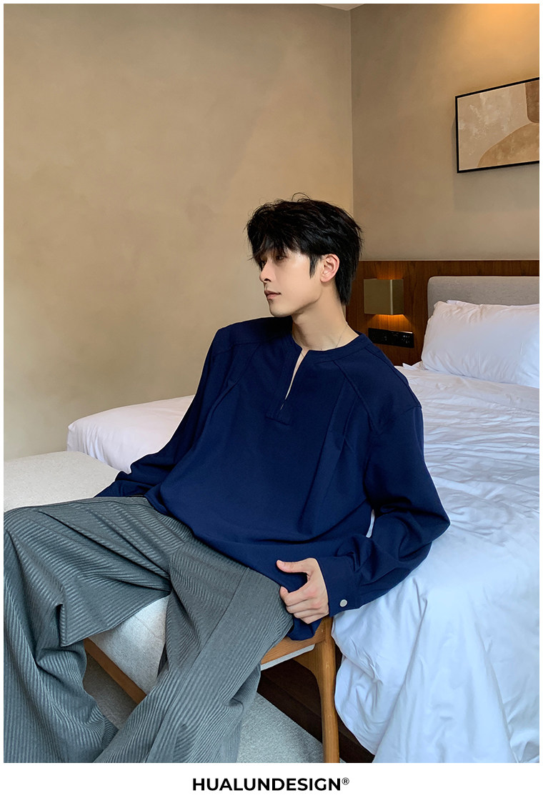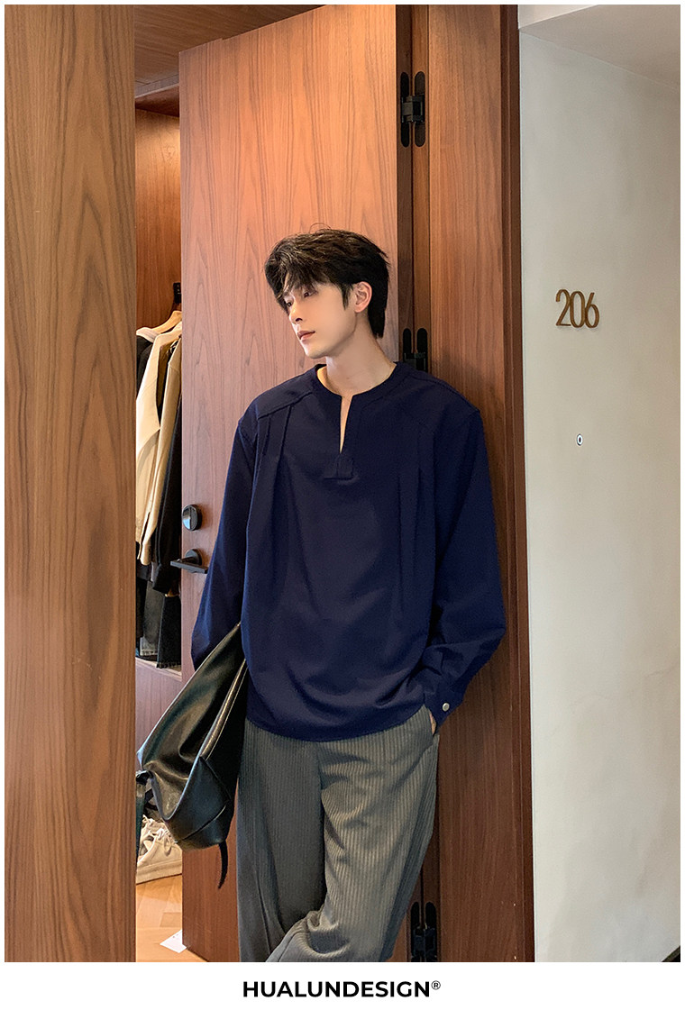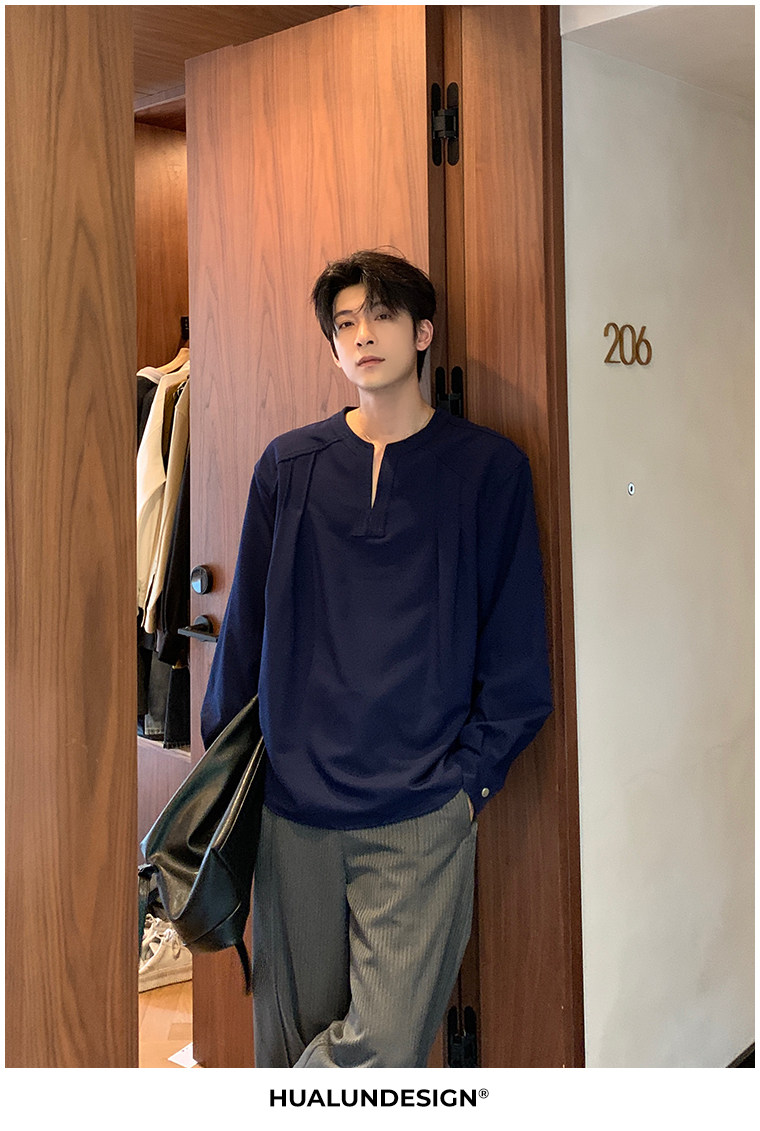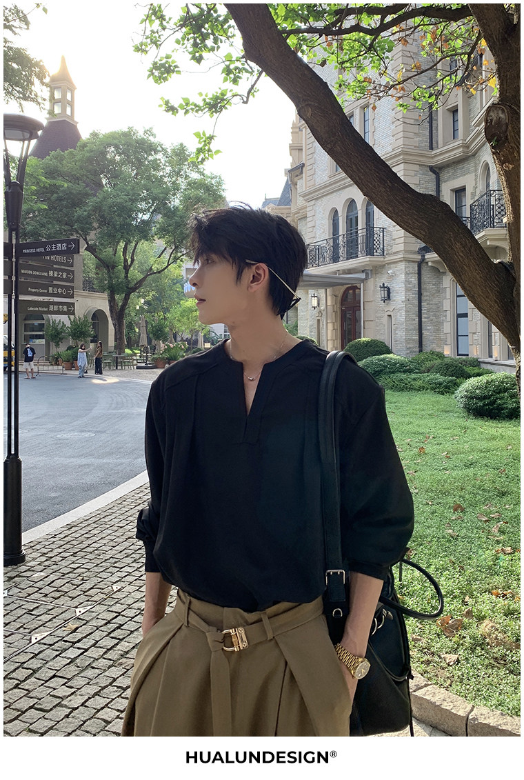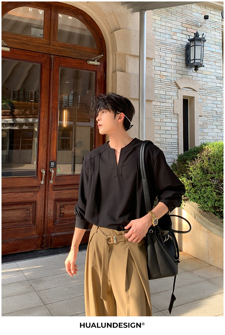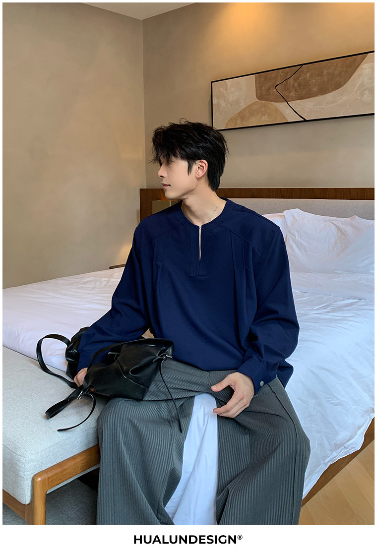 Hualun Autumn and Winter V Neck Loose Shirt for Men, Gray Inner Layering Shirt, Men's Cleanfit Long-Sleeved Shirt