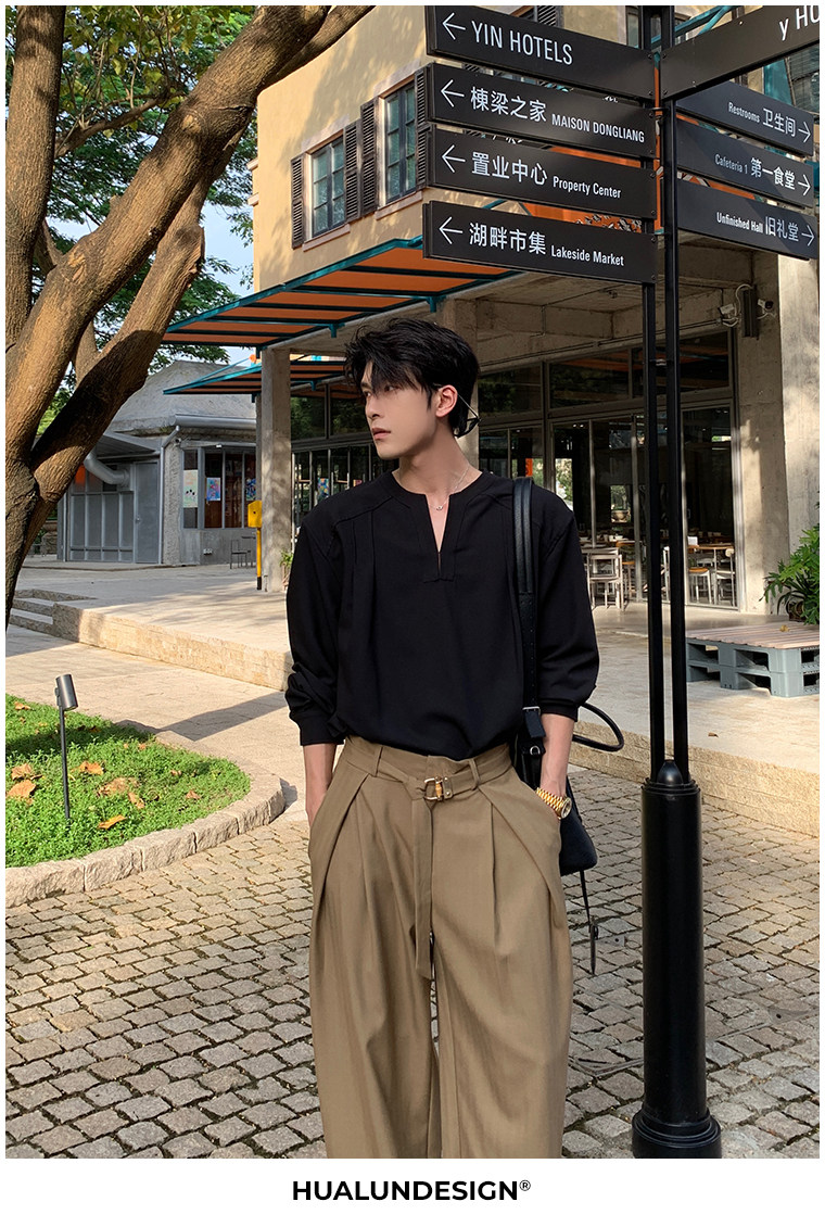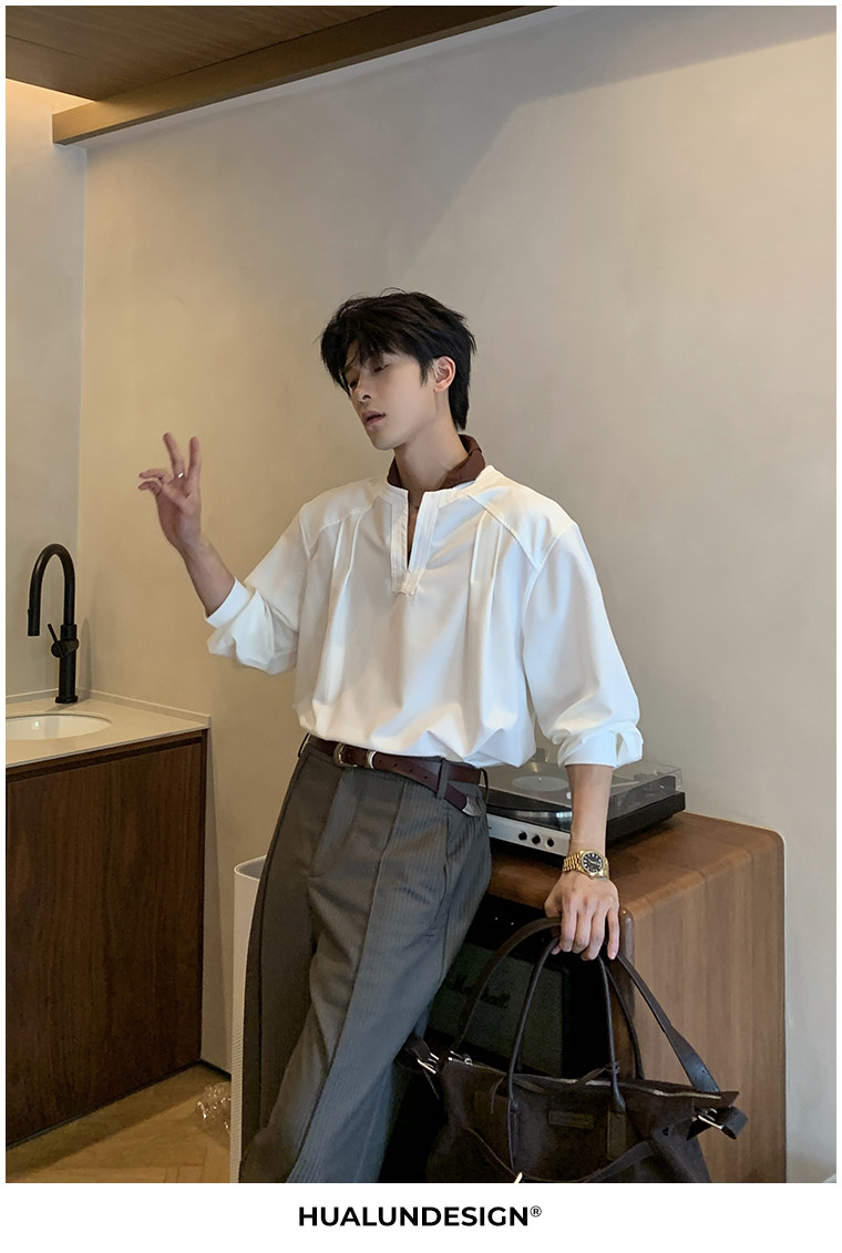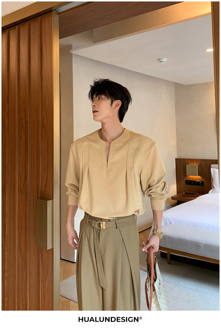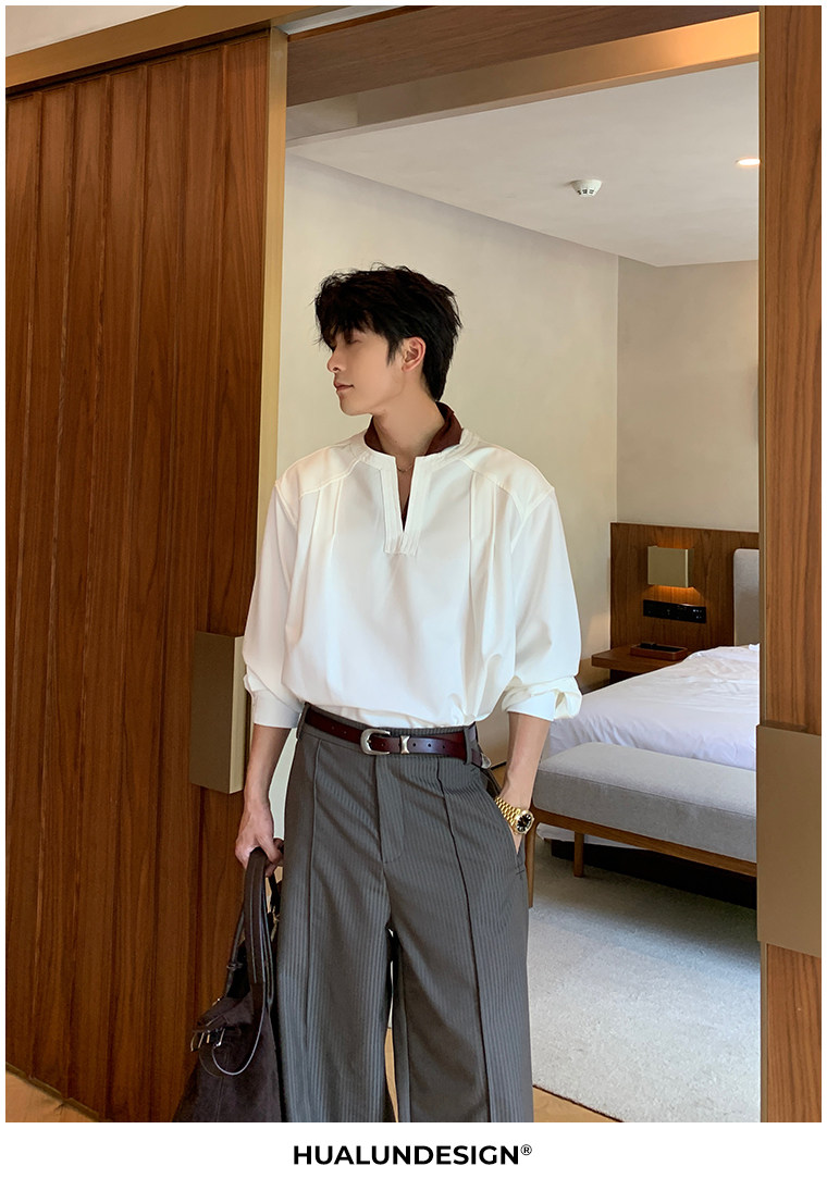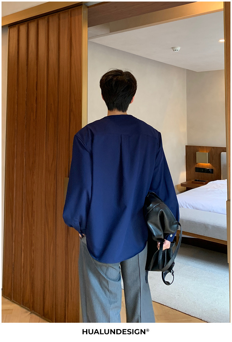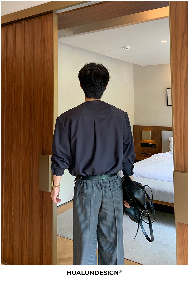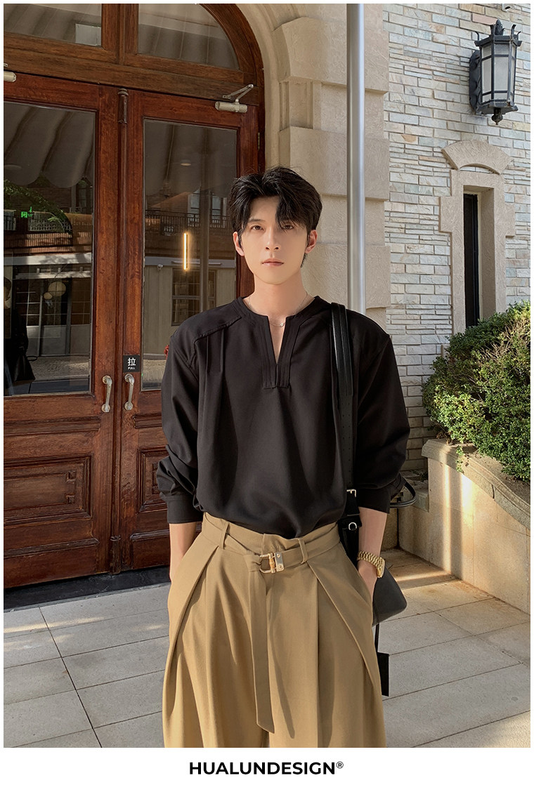 Hualun Autumn and Winter V Neck Loose Shirt for Men, Gray Inner Layering Shirt, Men's Cleanfit Long-Sleeved Shirt