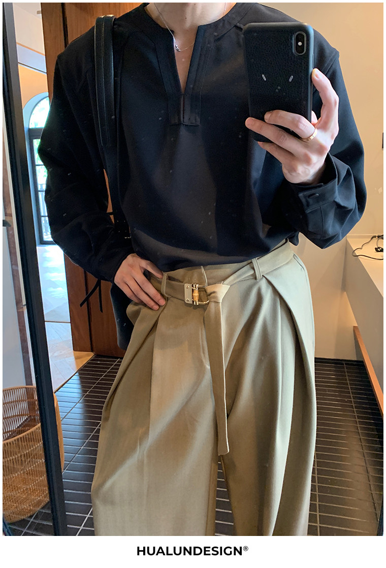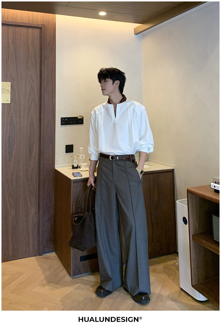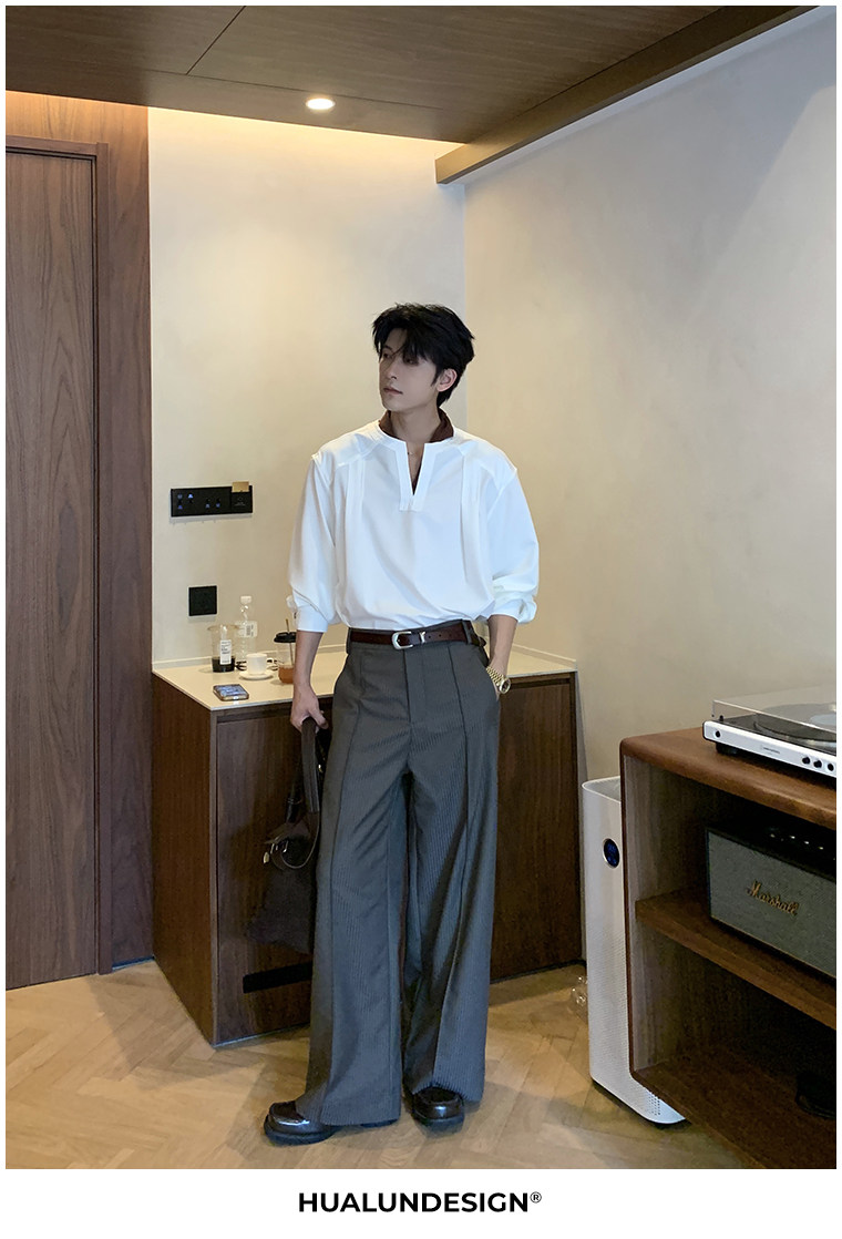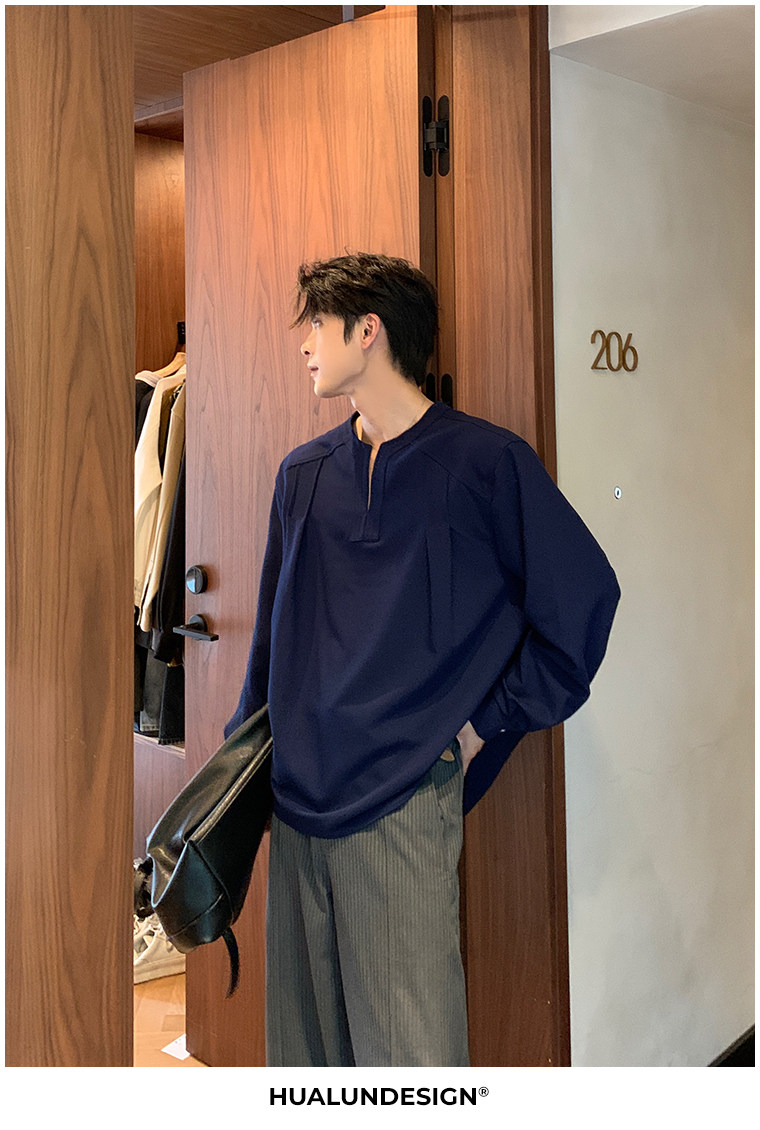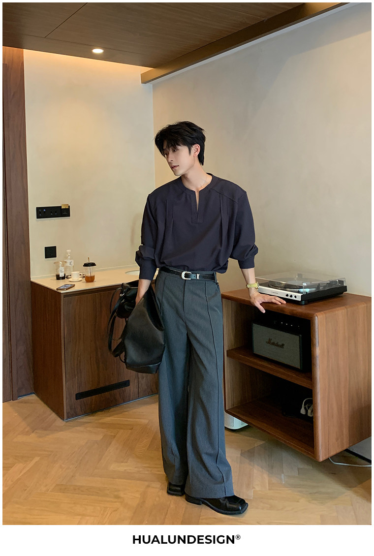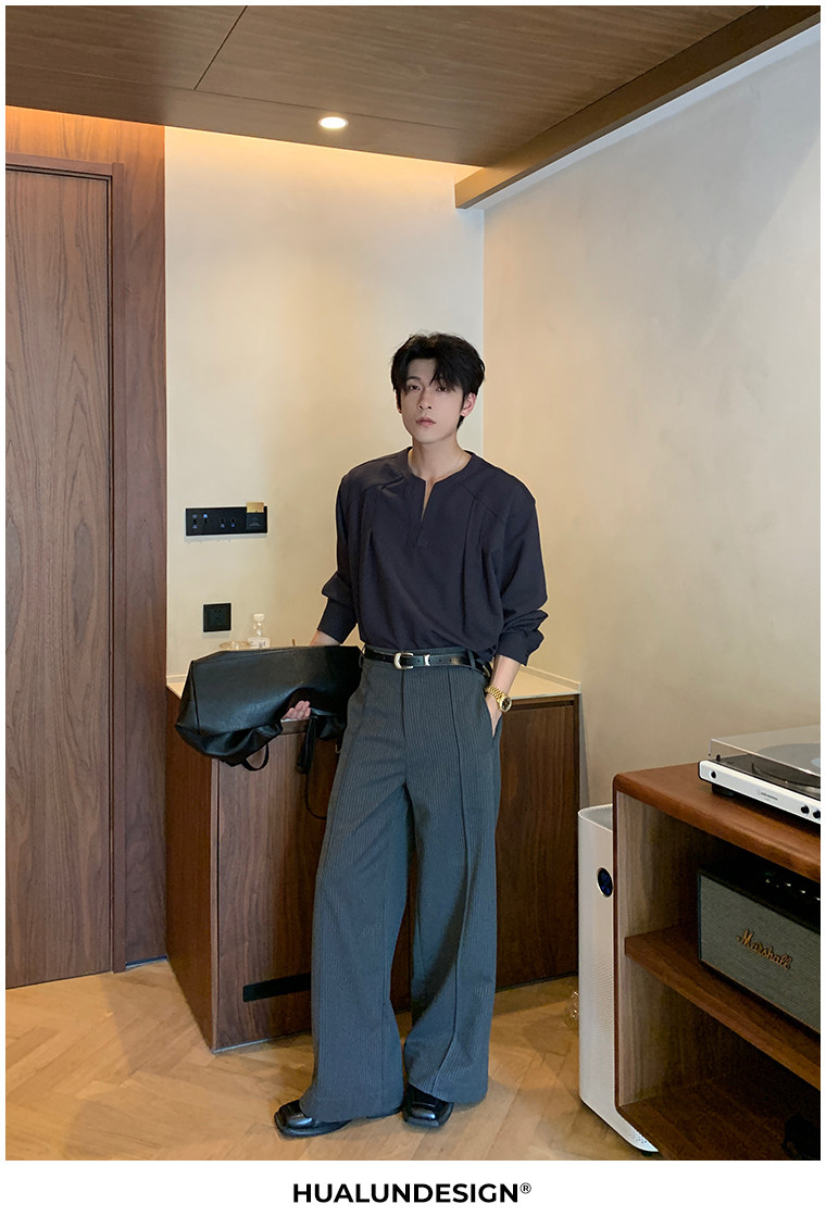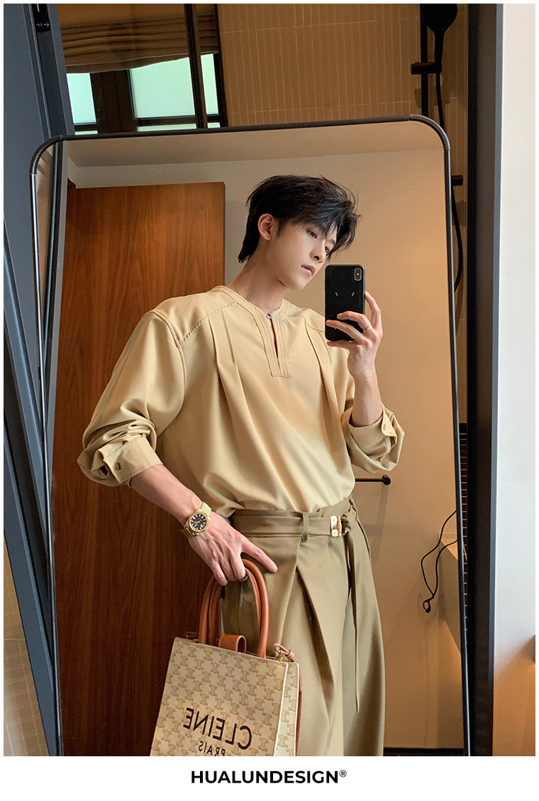 Hualun Autumn and Winter V Neck Loose Shirt for Men, Gray Inner Layering Shirt, Men's Cleanfit Long-Sleeved Shirt