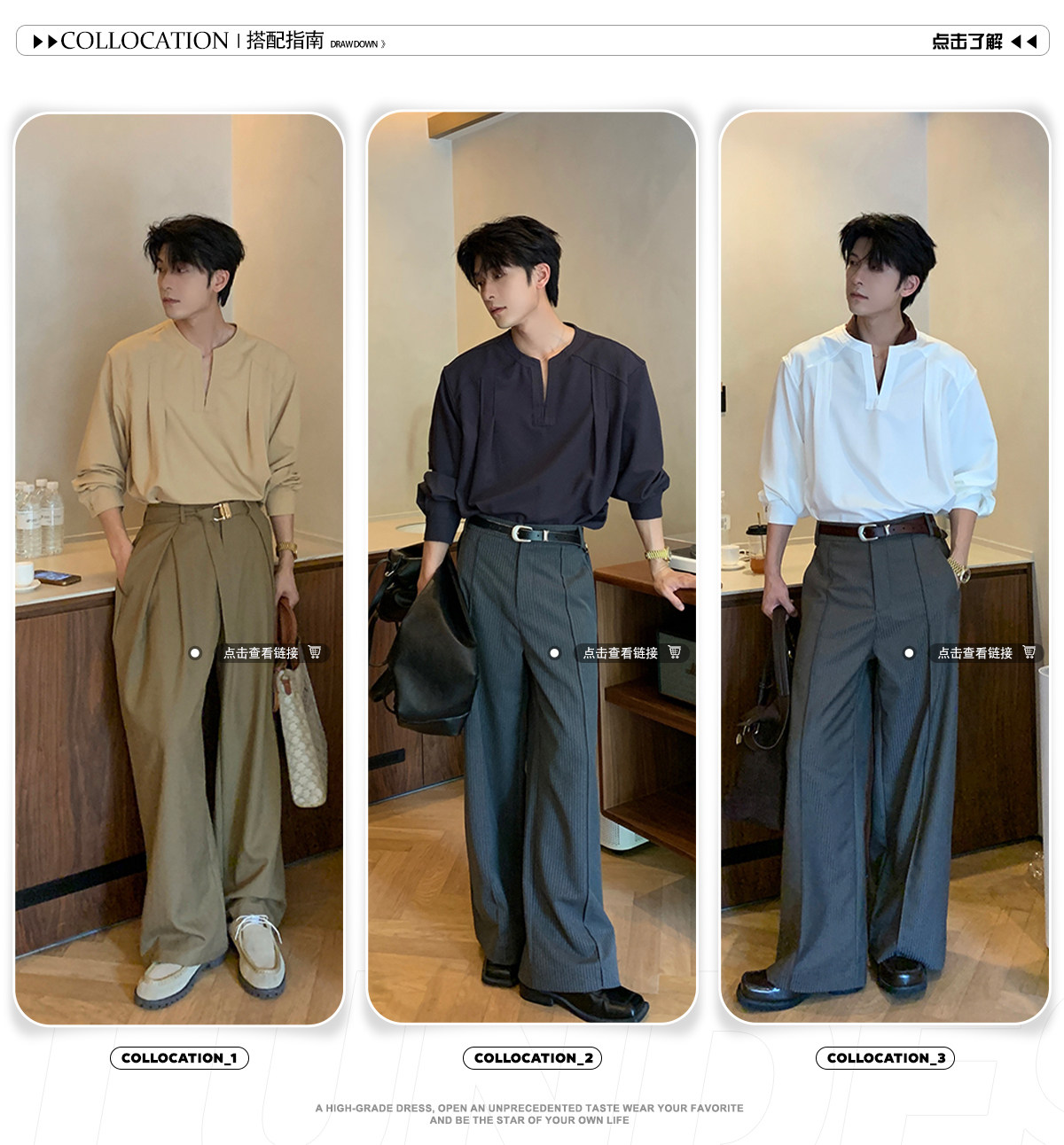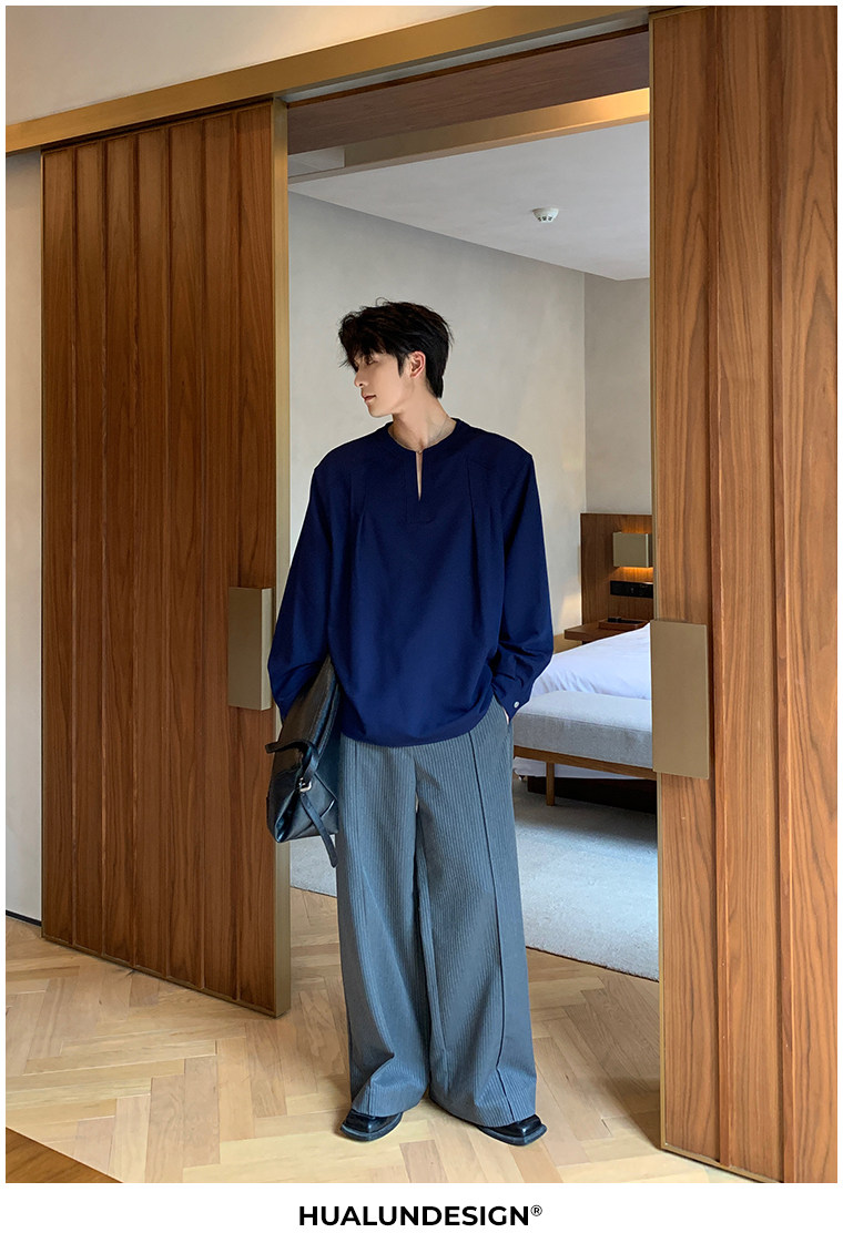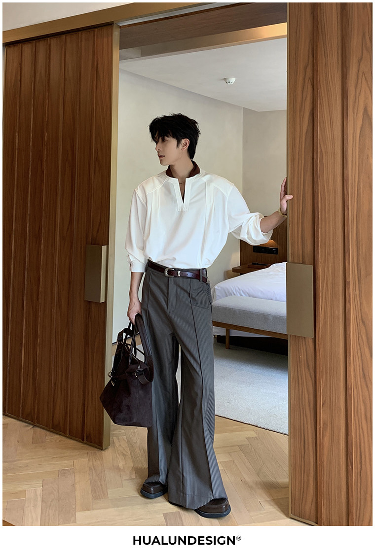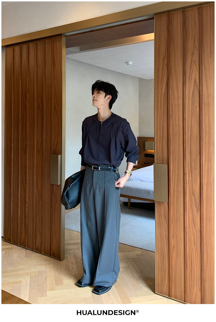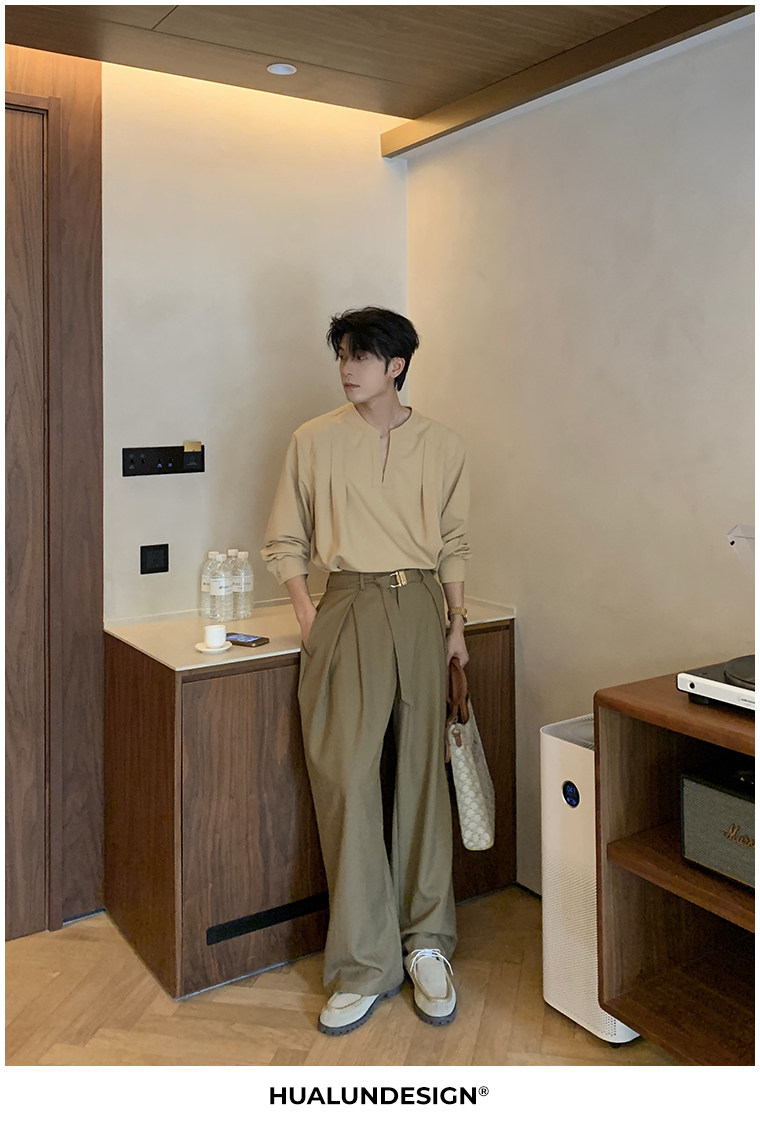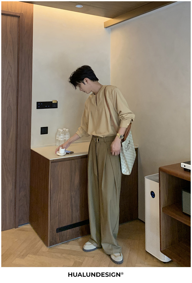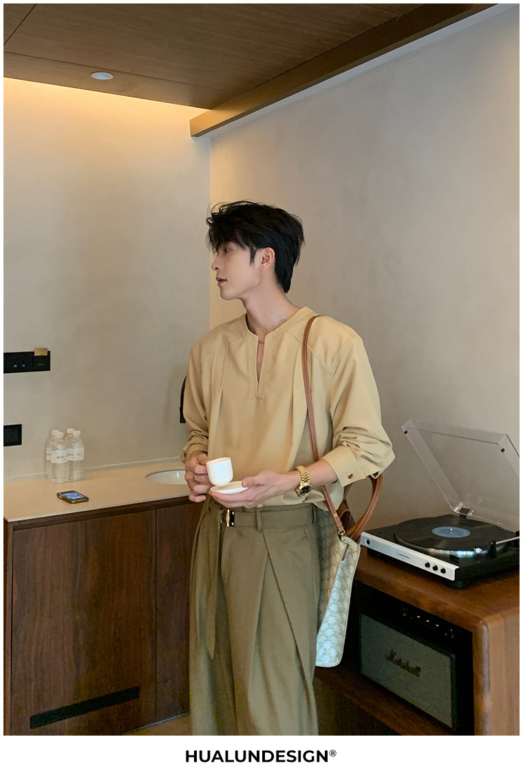 Hualun Autumn and Winter V Neck Loose Shirt for Men, Gray Inner Layering Shirt, Men's Cleanfit Long-Sleeved Shirt