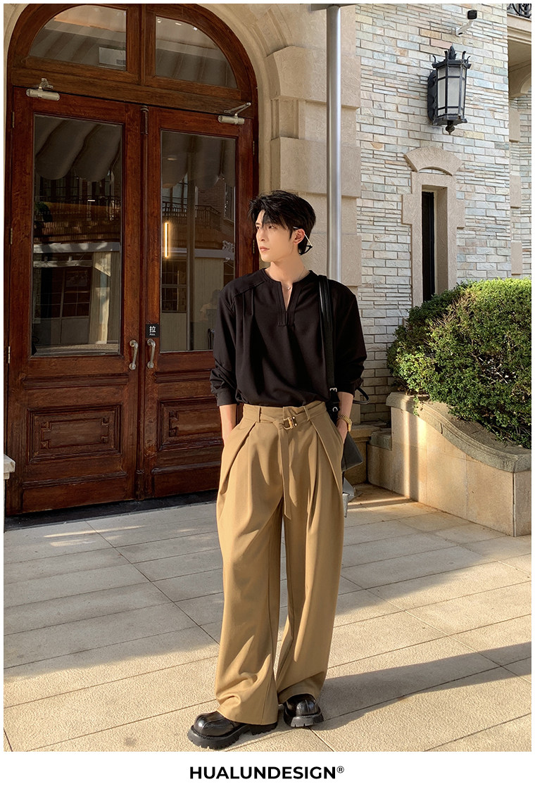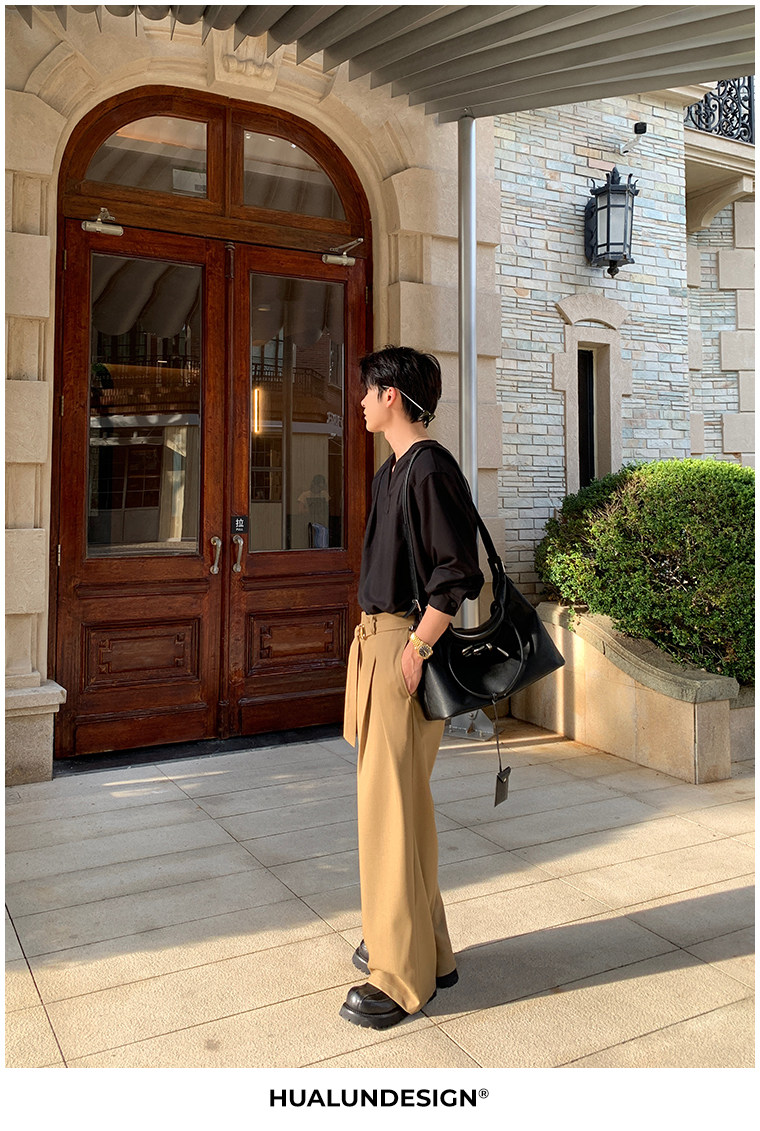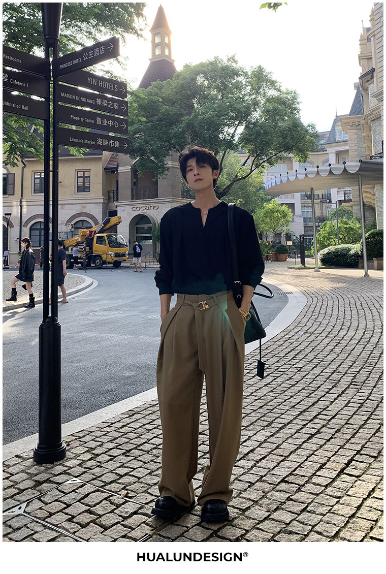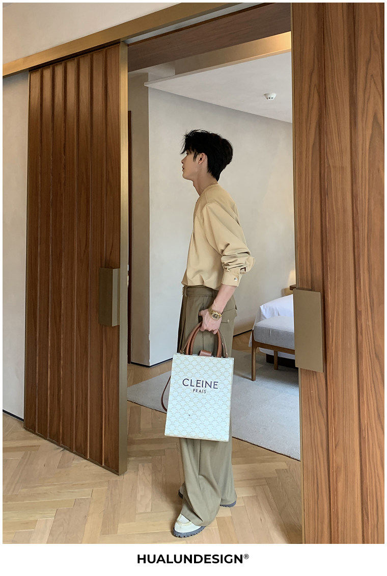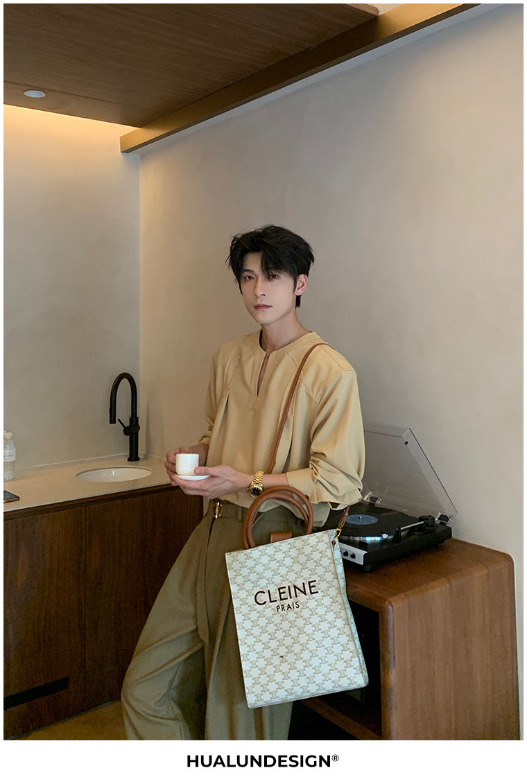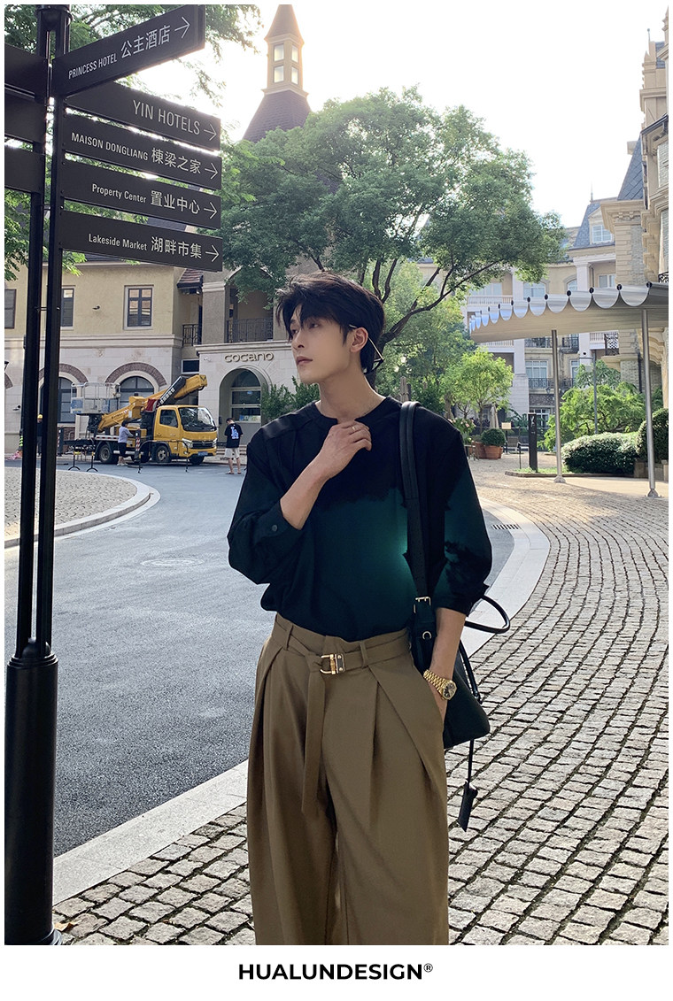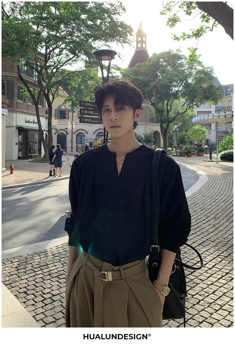 Hualun Autumn and Winter V Neck Loose Shirt for Men, Gray Inner Layering Shirt, Men's Cleanfit Long-Sleeved Shirt