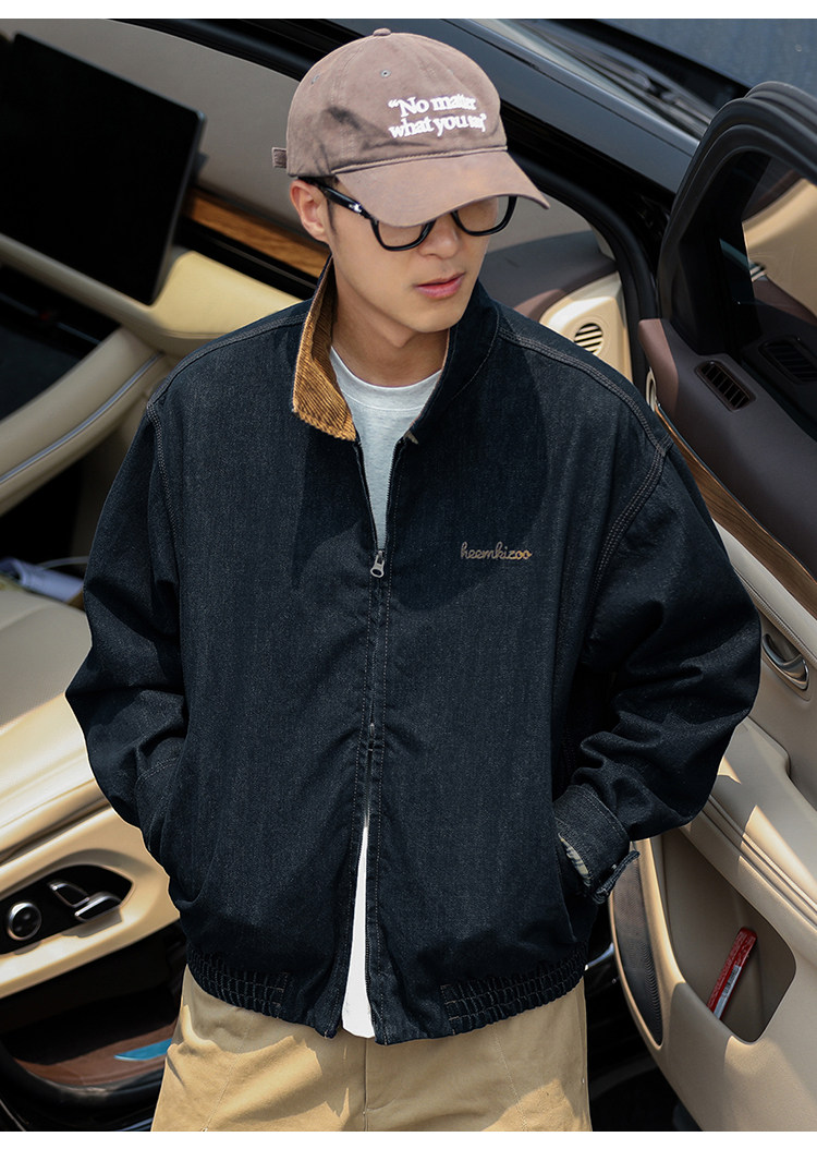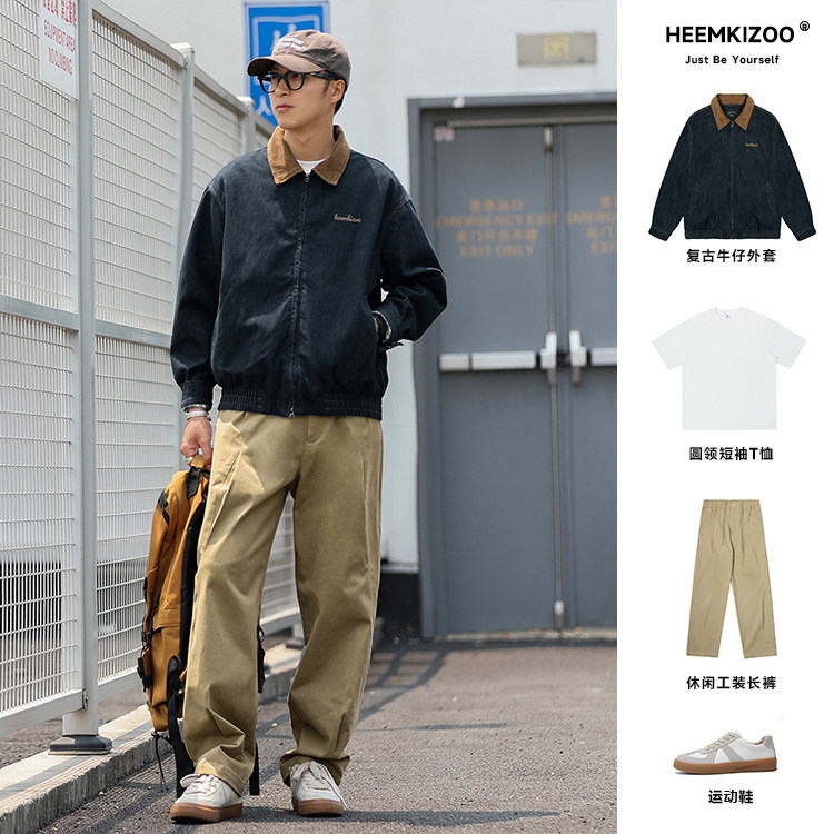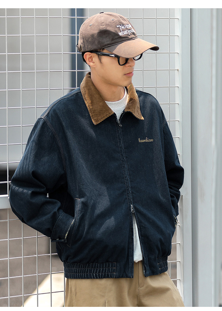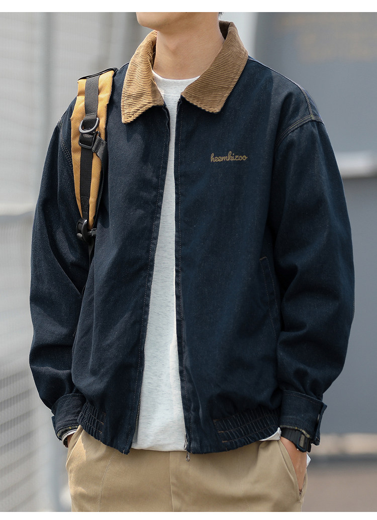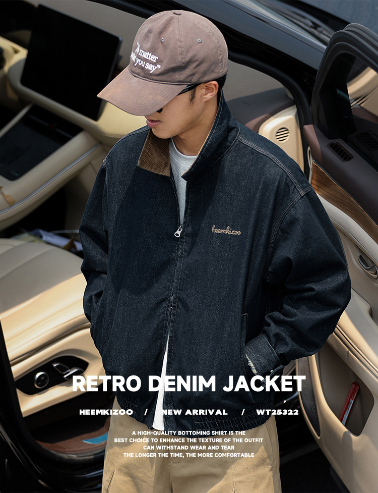 Heyma Qizuo American Retro Autumn Men's Denim Loose Casual Jacket Embroidered Lapel Workwear Jacket Trendy Brand