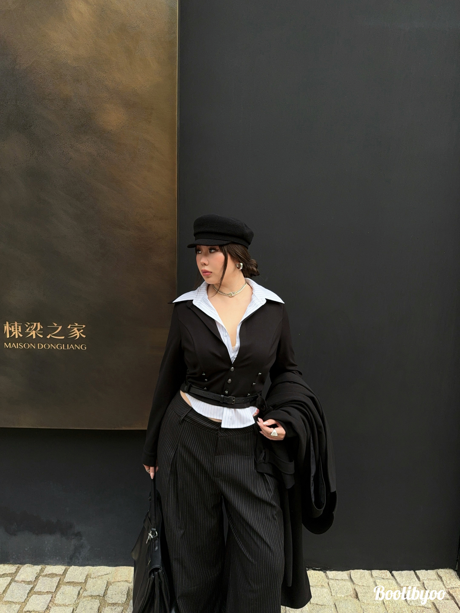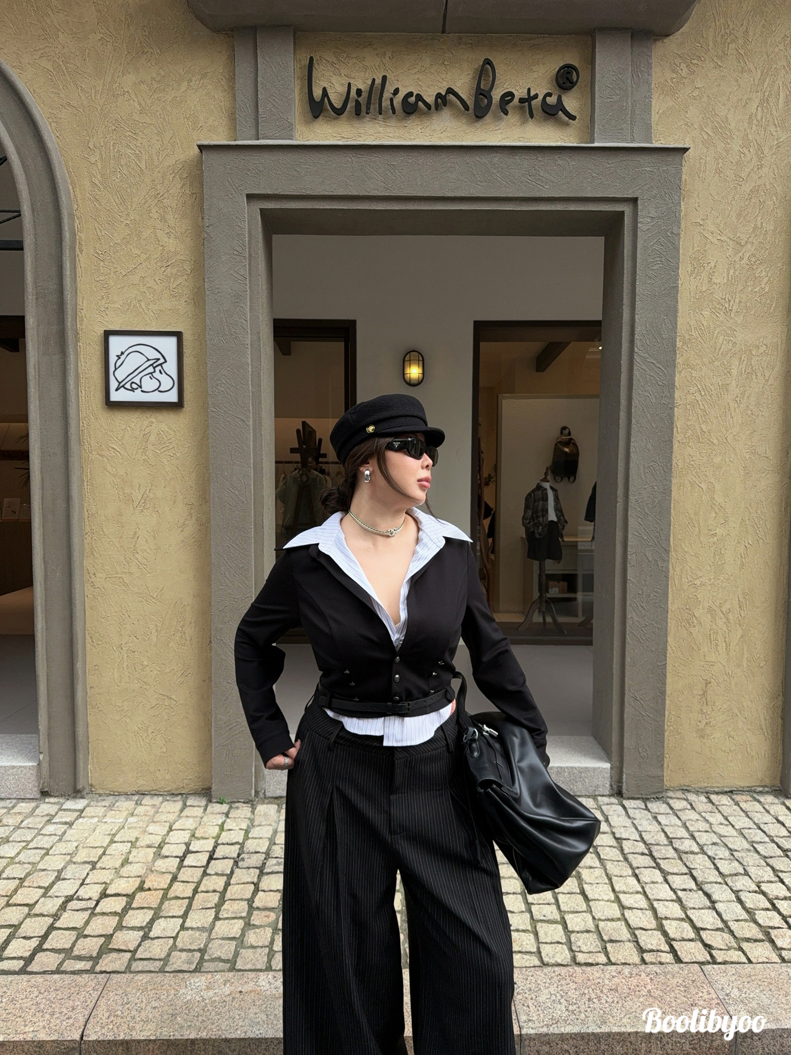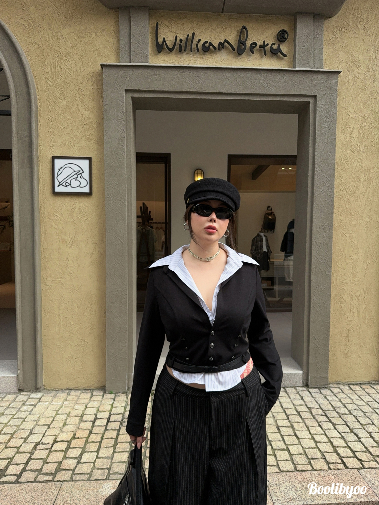 Boolibyoo High-End Office Aesthetics Plus-Size Hot Girl Siren Style Fake Two-Piece Deep V Waist-Cinching Long-Sleeve Shirt