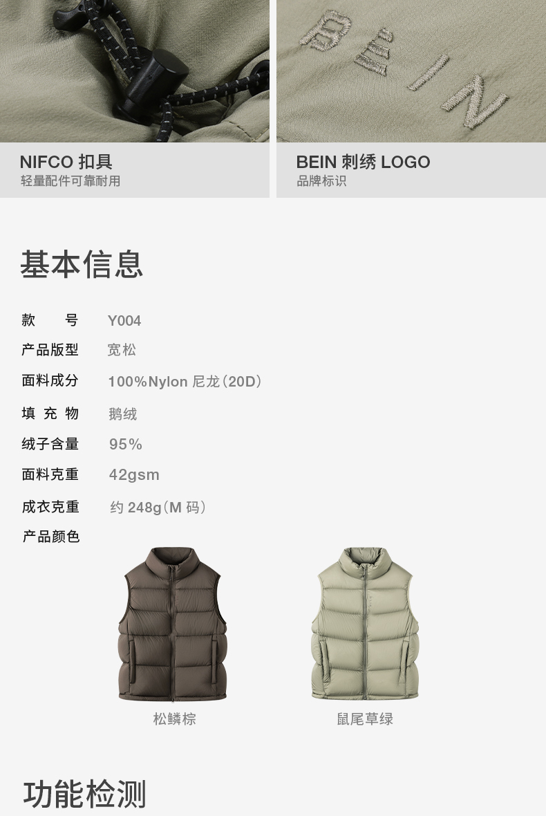 Bein Space New Autumn and Winter Product 95 White Goose down 800Fp Lightweight Windproof and Wear-Resistant down Vest Y004