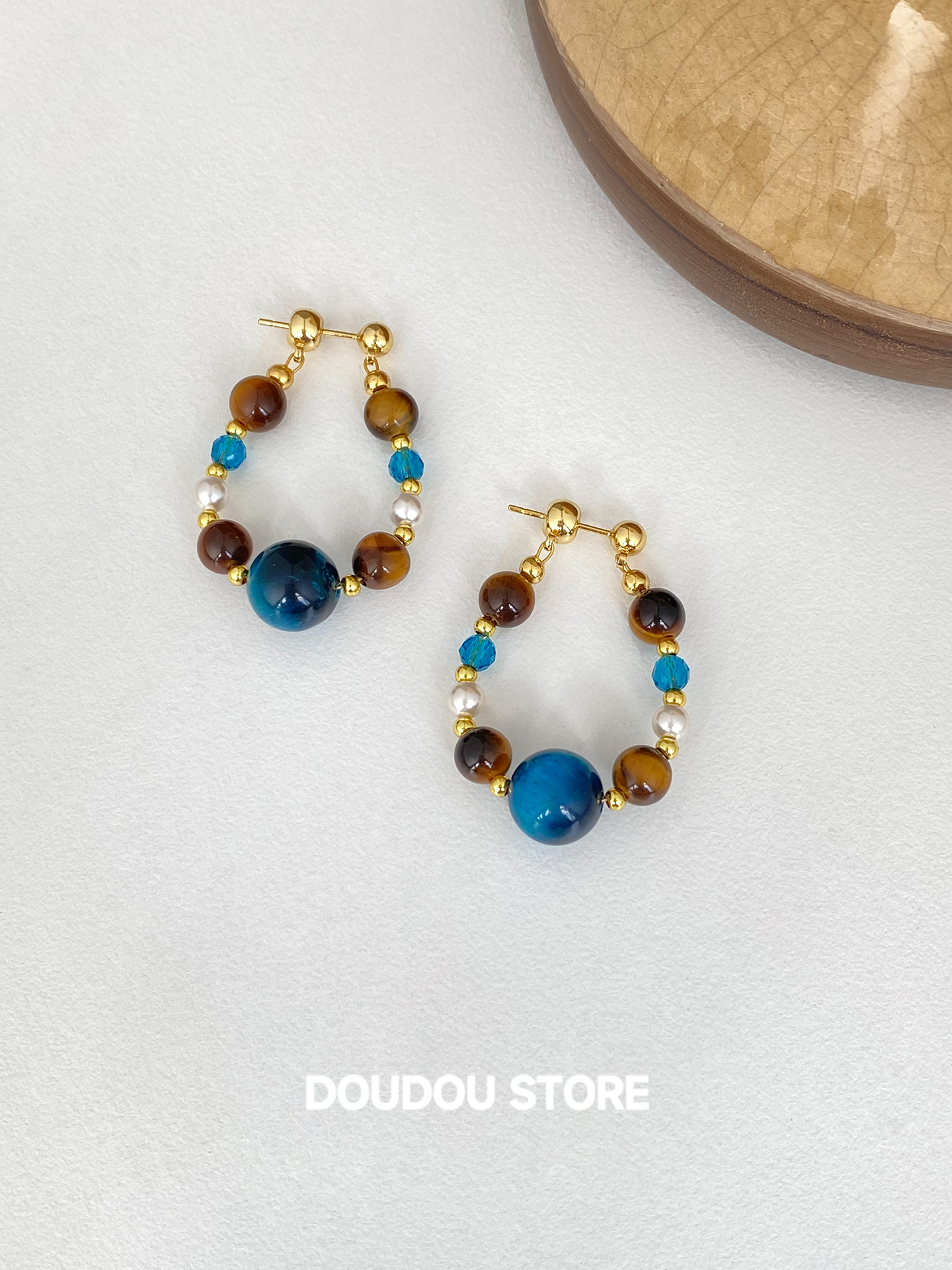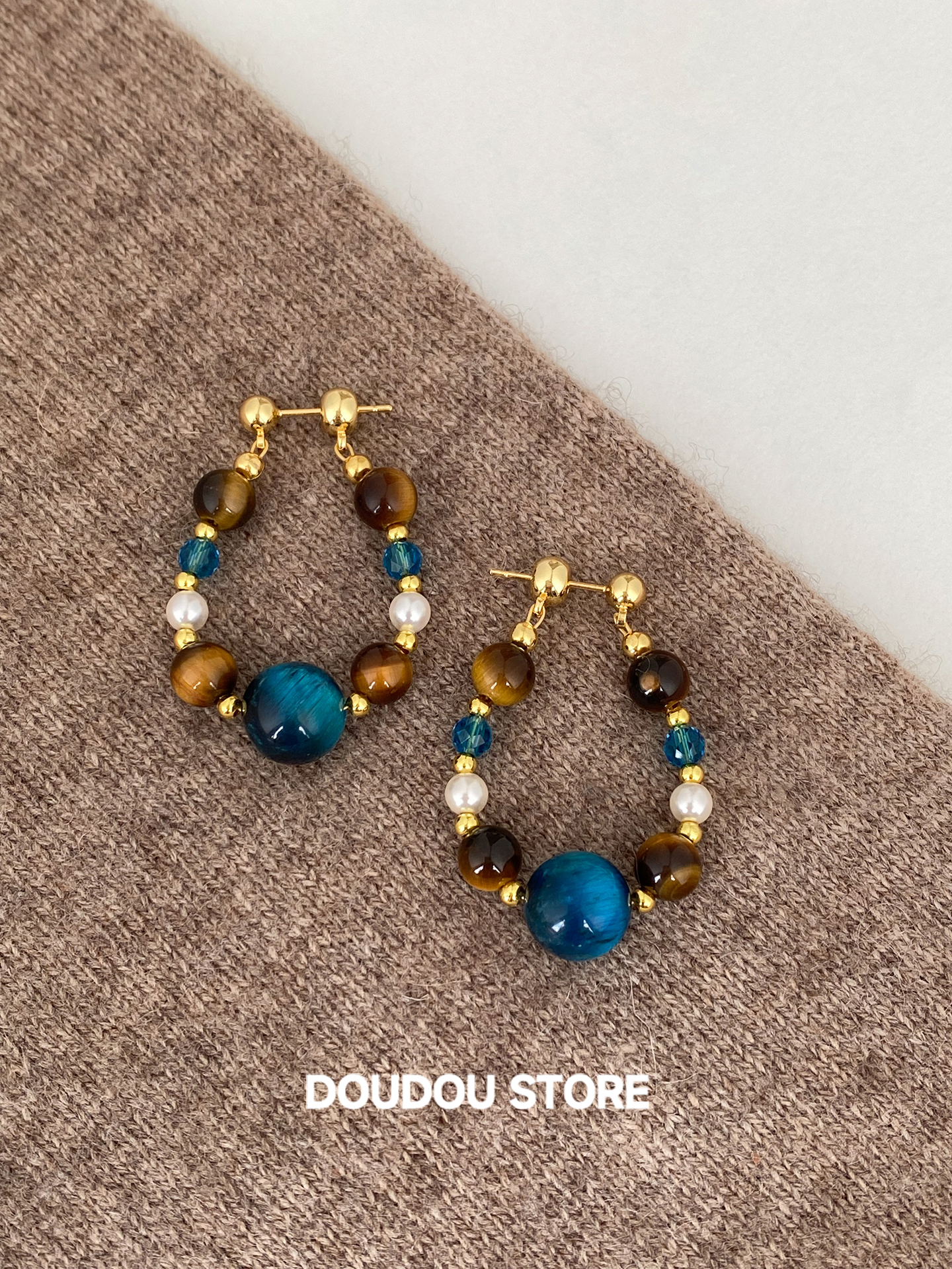 Doudoustore 925 Silver Needle Natural Tiger Eye Stone Contrasting Color Natural Stone Beaded Earrings for Women New Chinese Style Retro