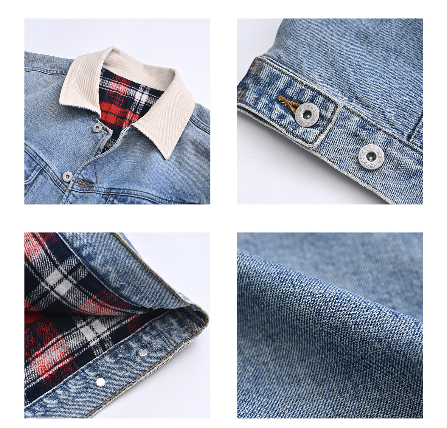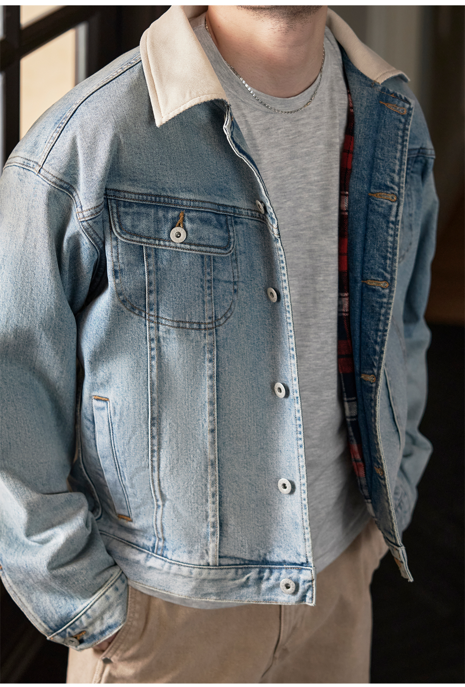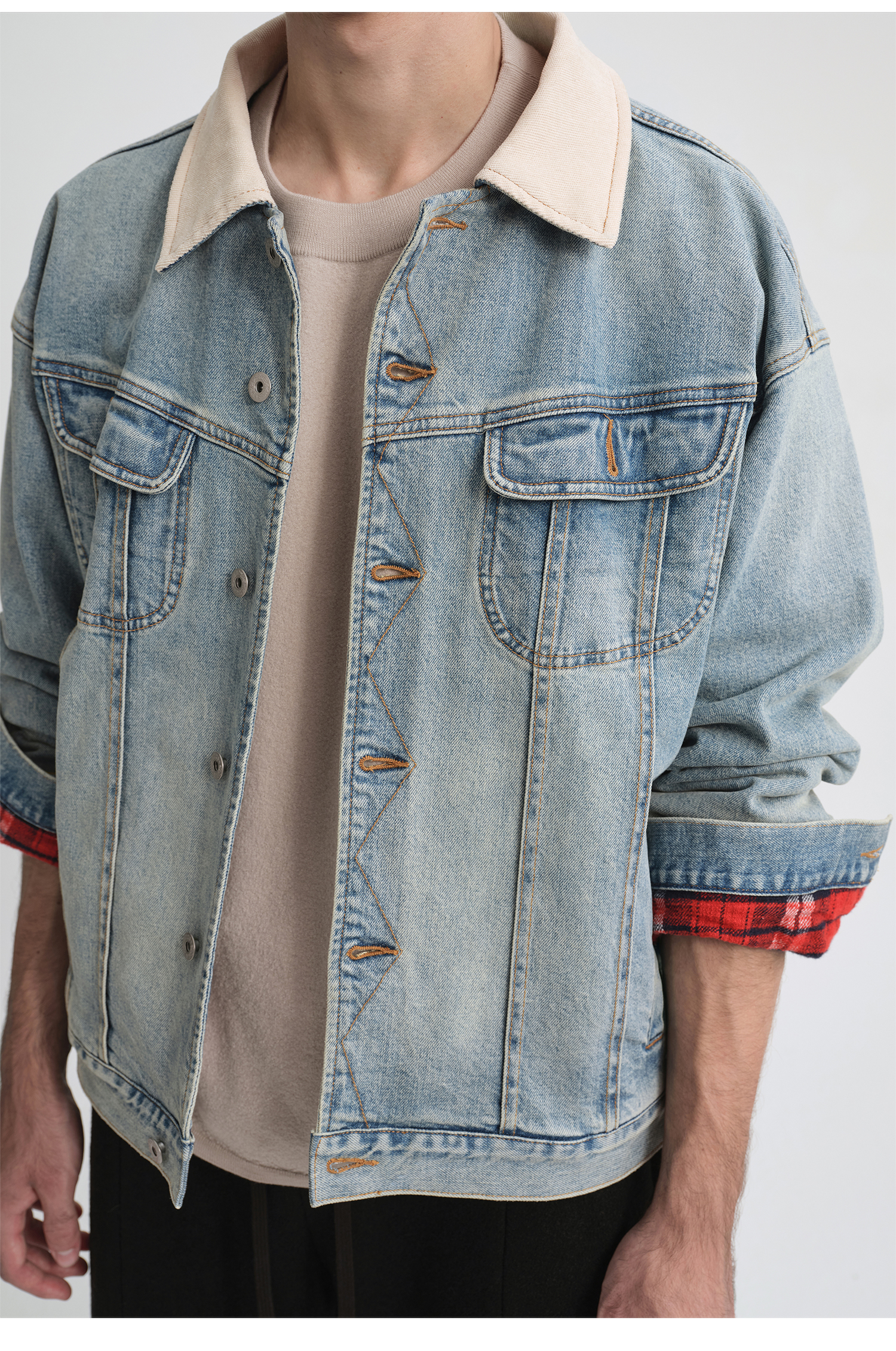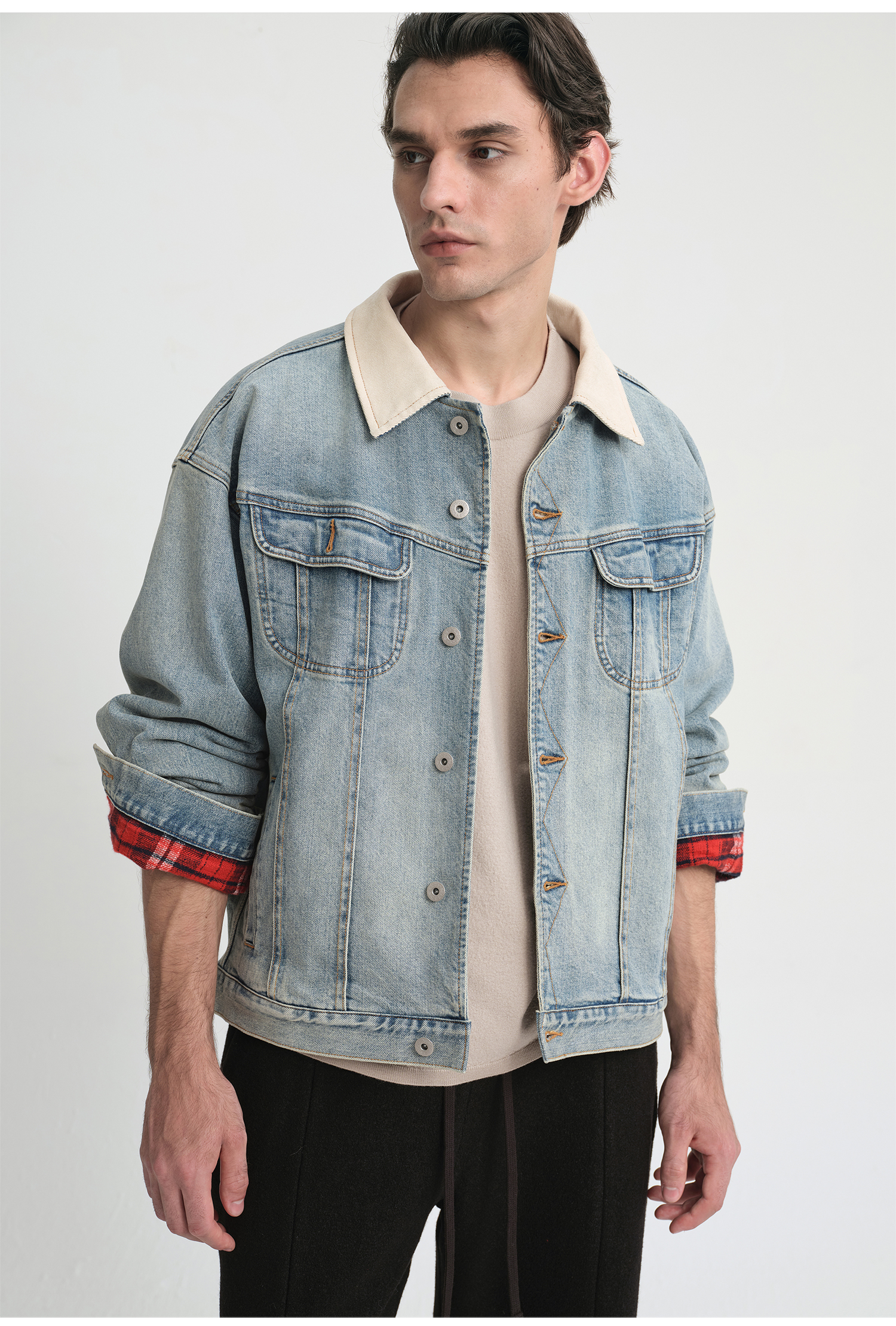 Roolrren Japan Okayama Kaihara Retro Corduroy Collar Plaid Color-Blocking Row Style Thickened Denim Jacket