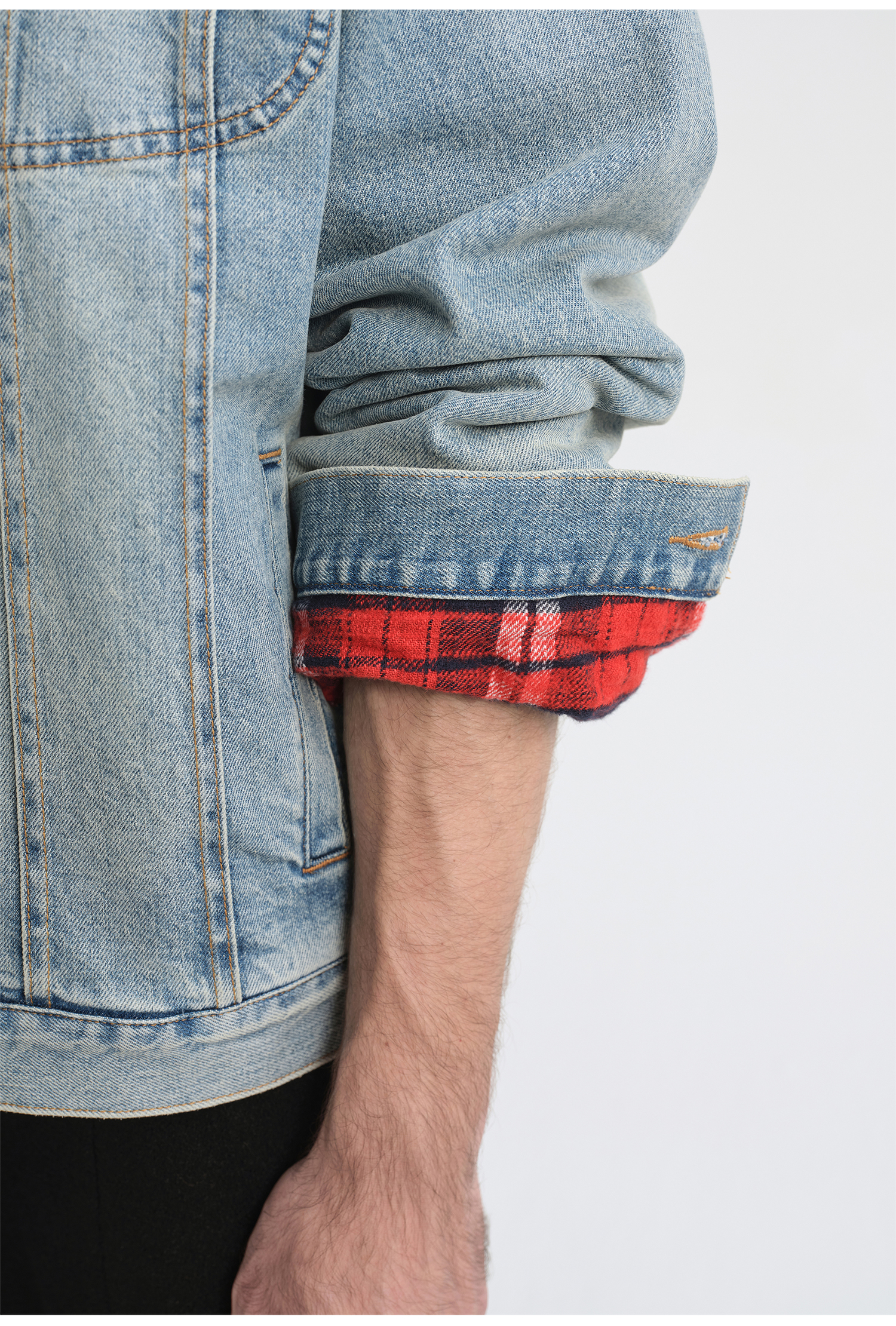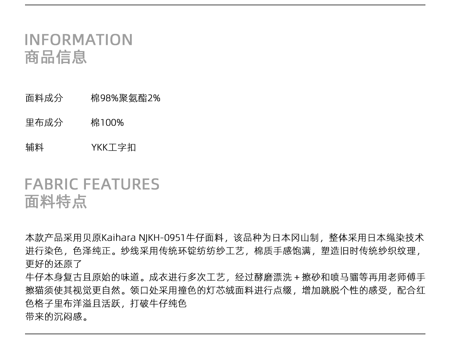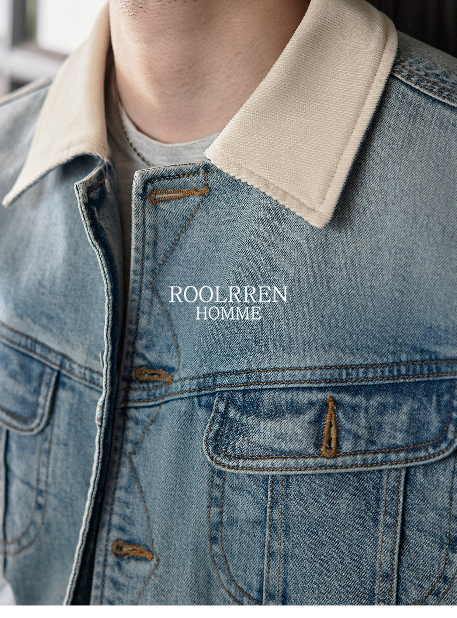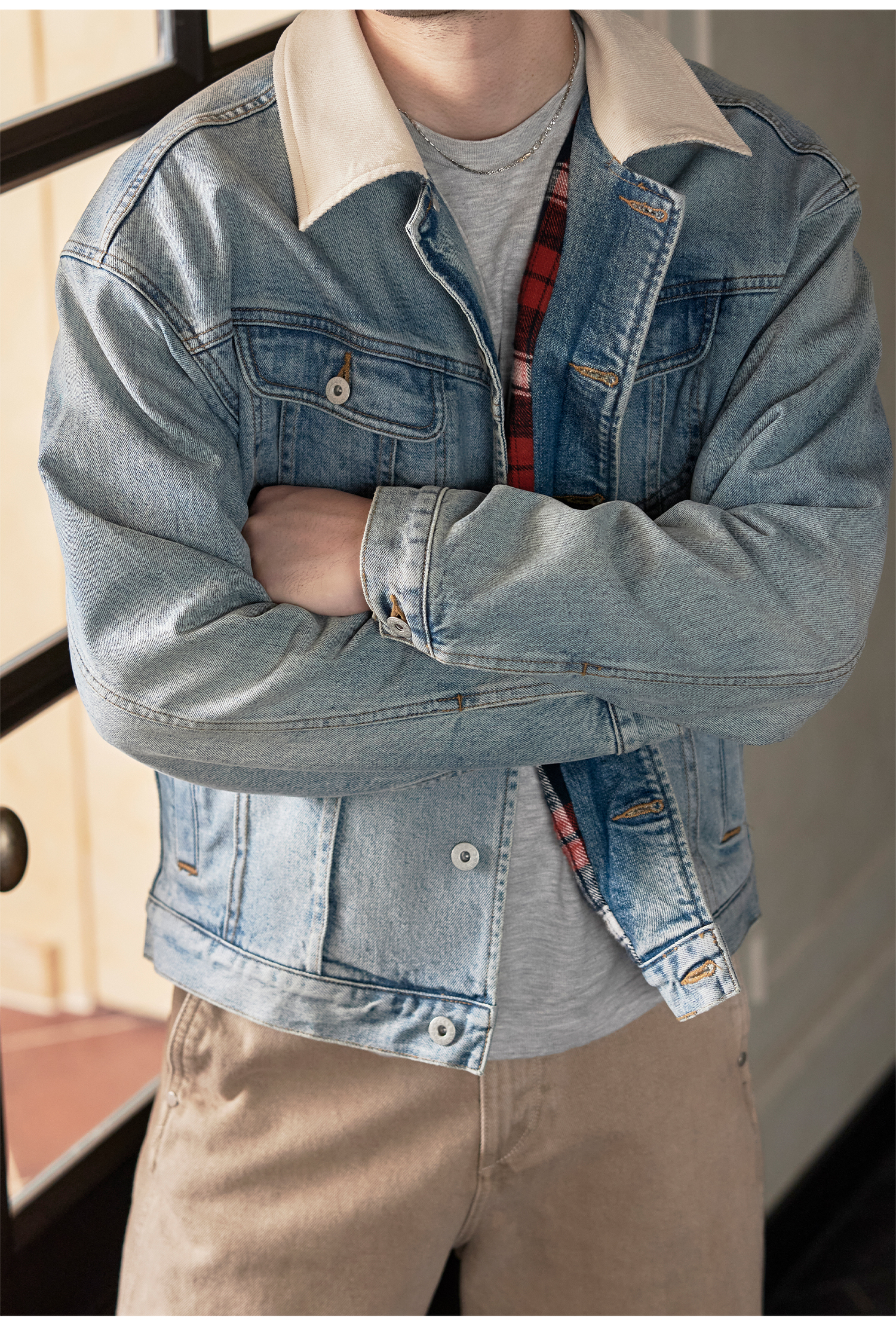 Roolrren Japan Okayama Kaihara Retro Corduroy Collar Plaid Color-Blocking Row Style Thickened Denim Jacket