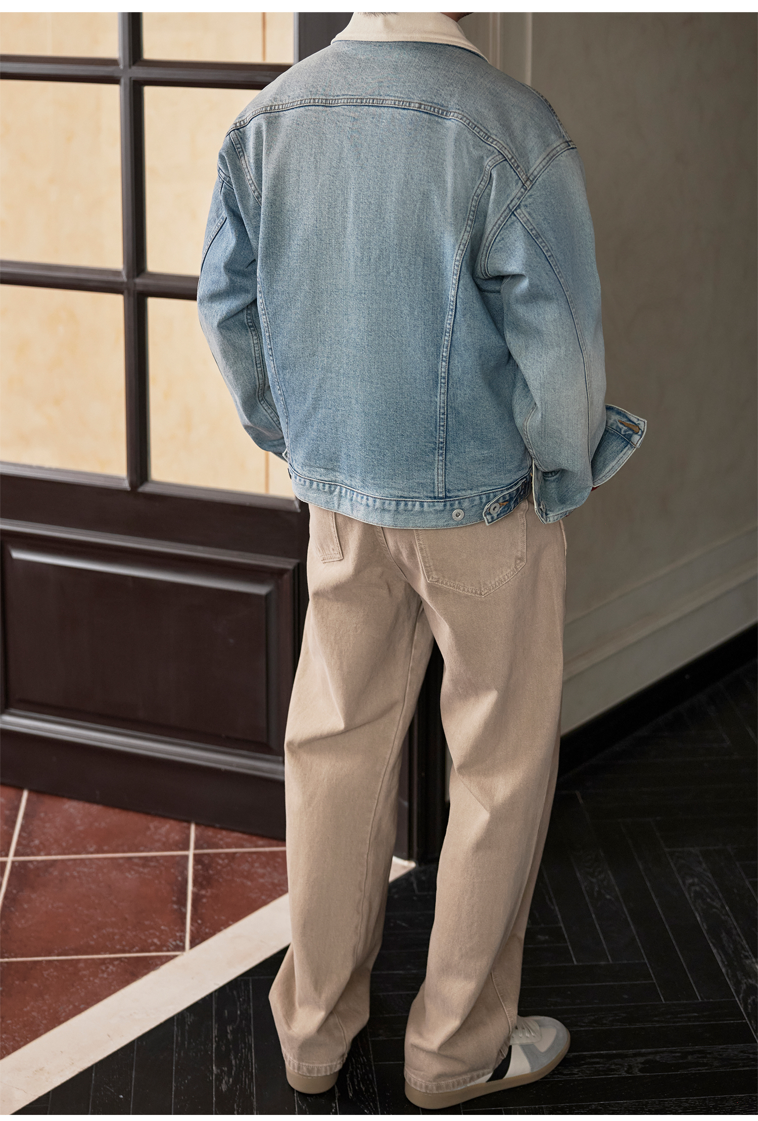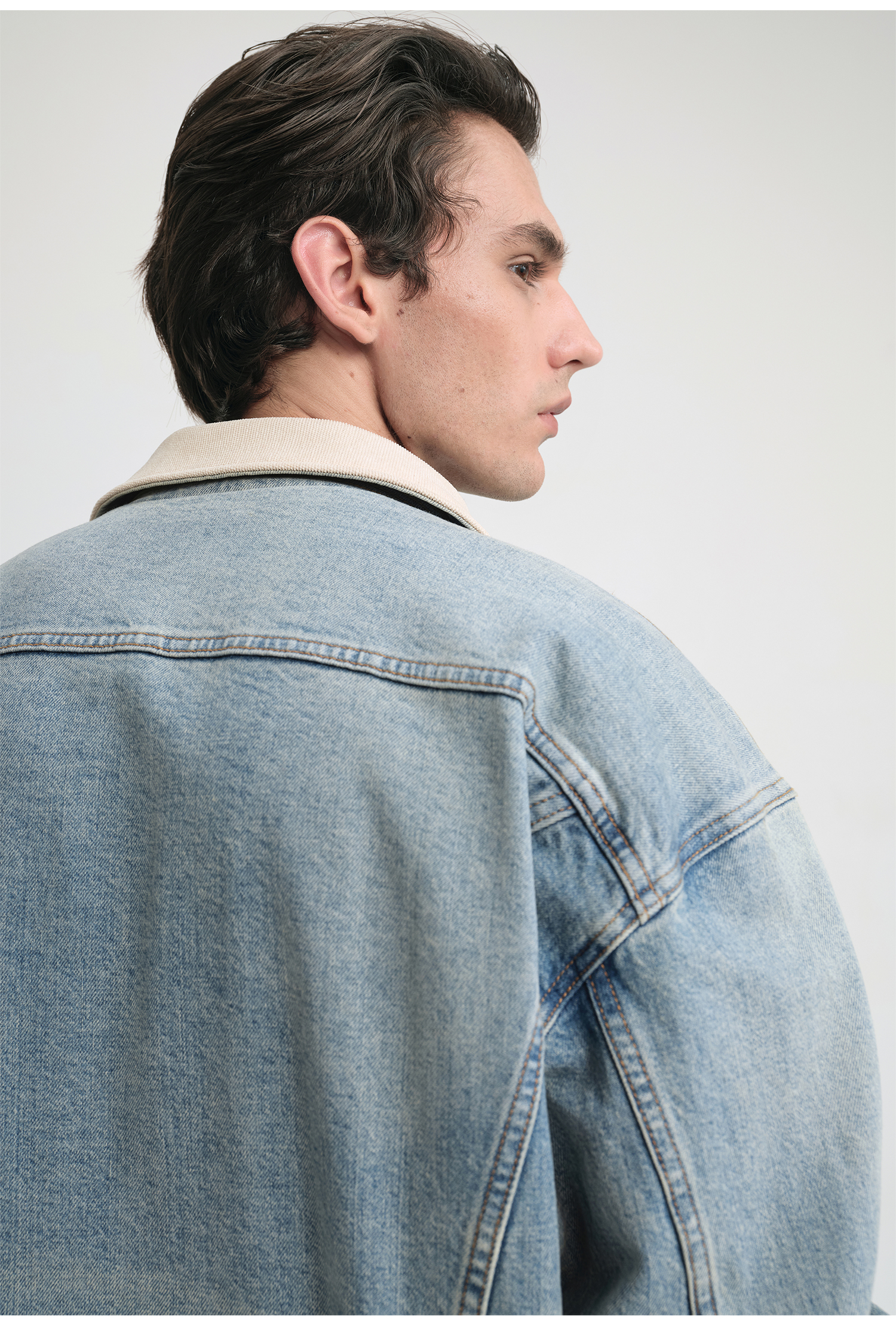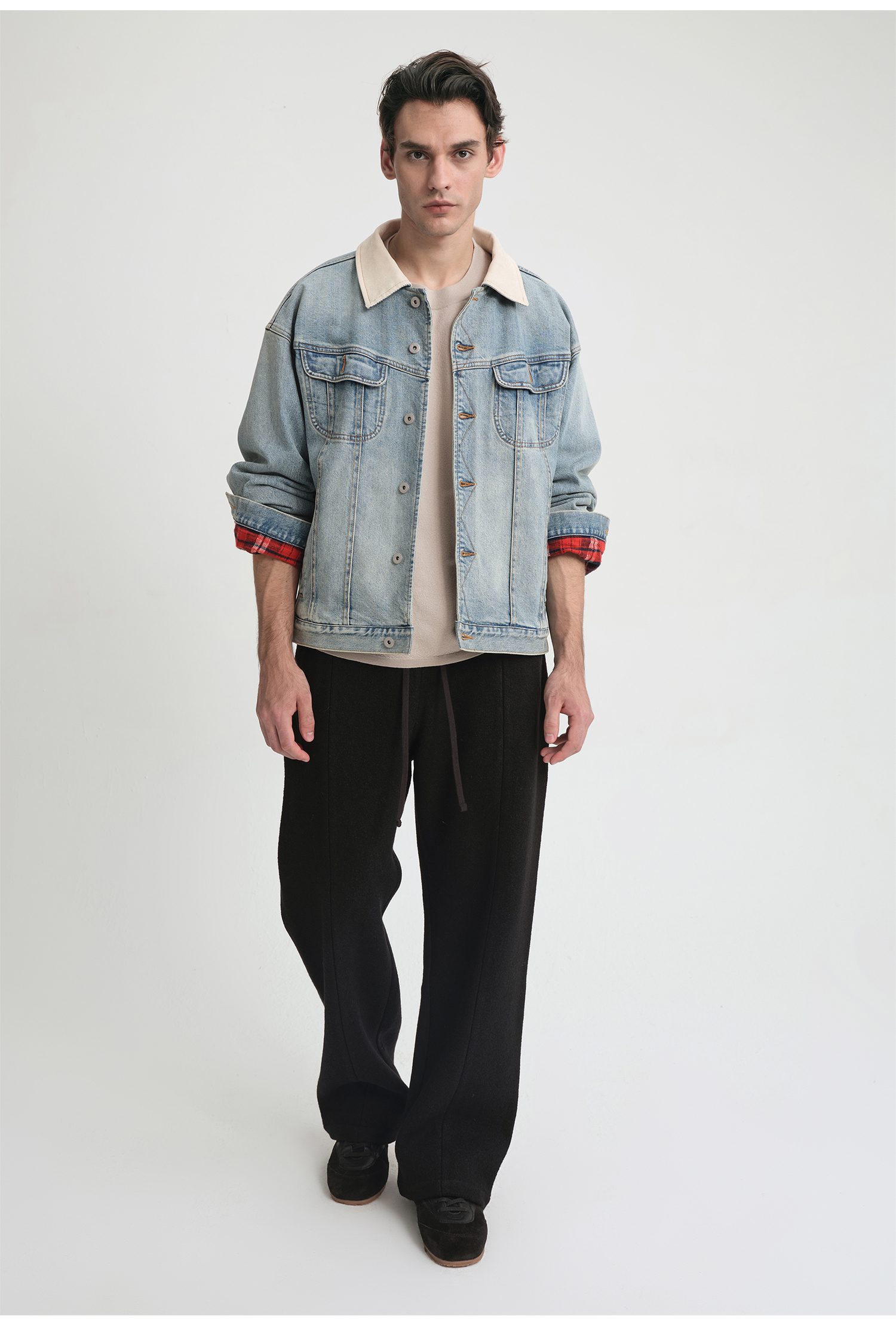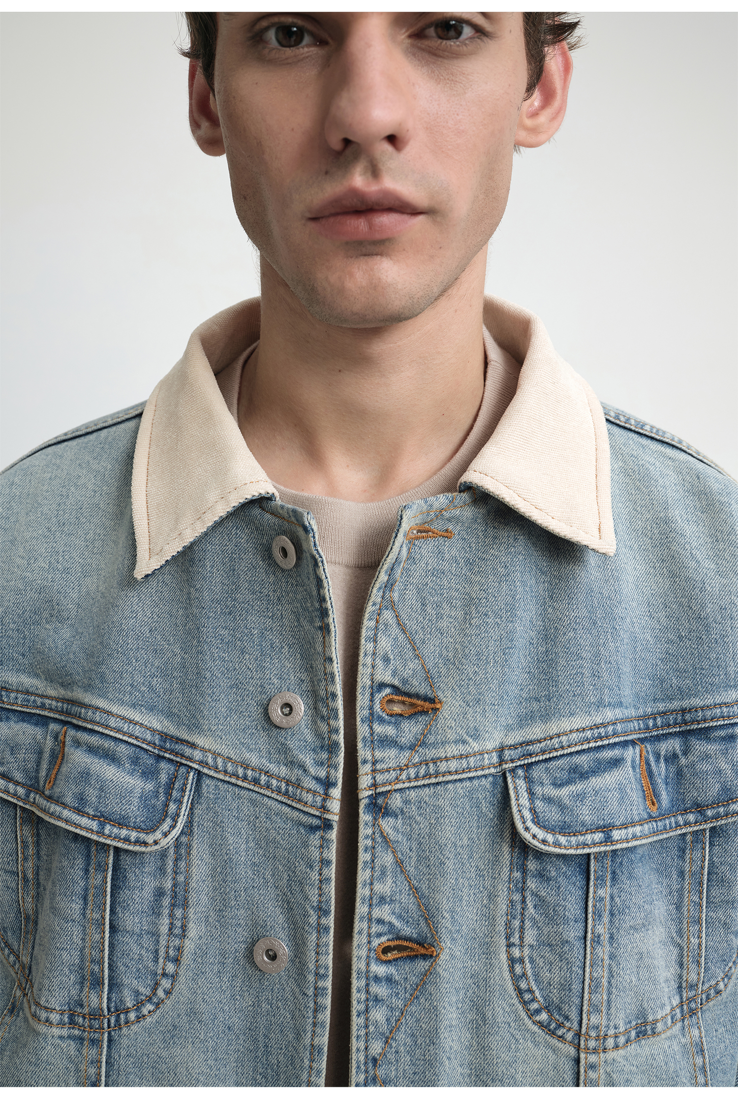 Roolrren Japan Okayama Kaihara Retro Corduroy Collar Plaid Color-Blocking Row Style Thickened Denim Jacket