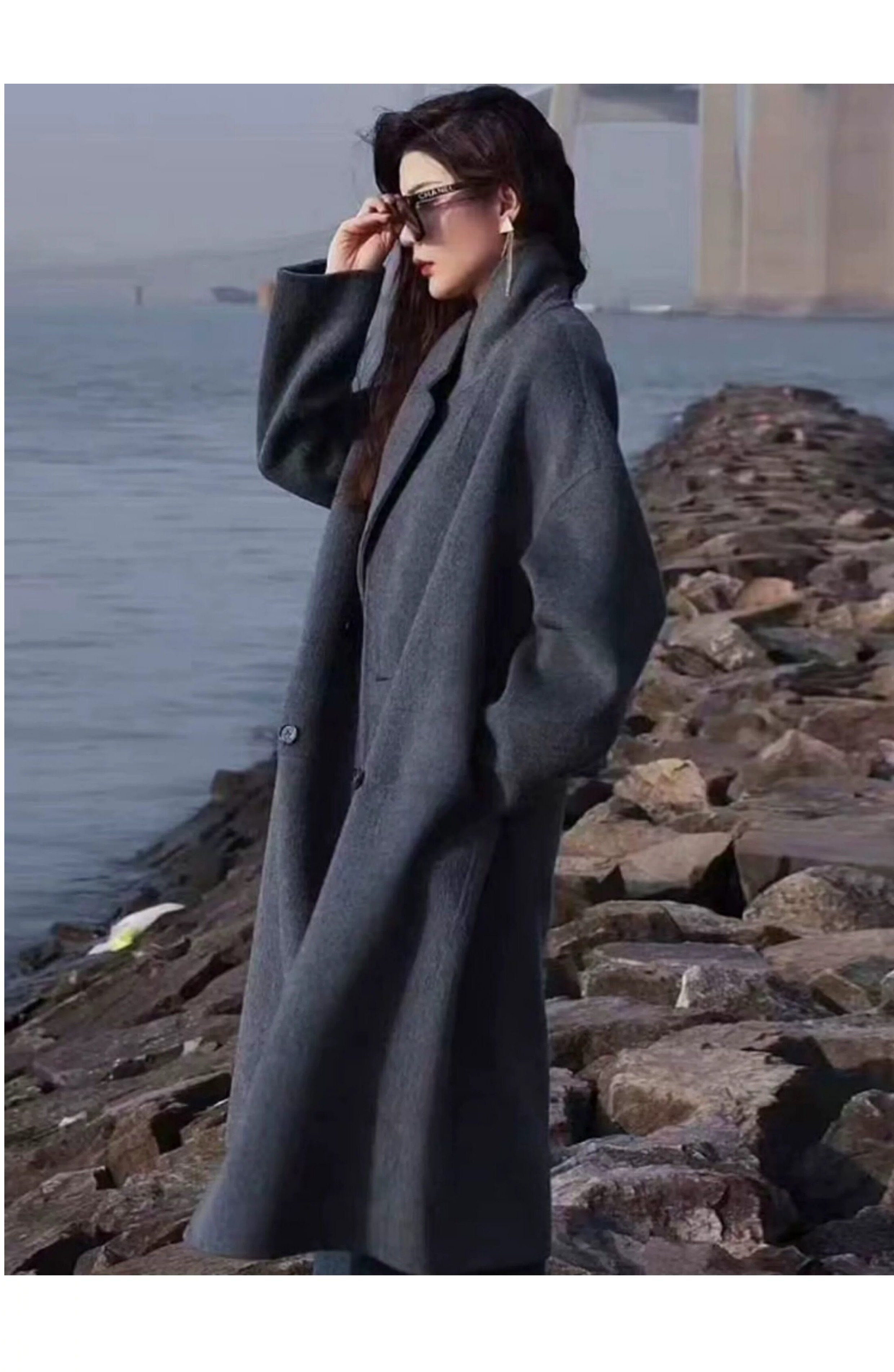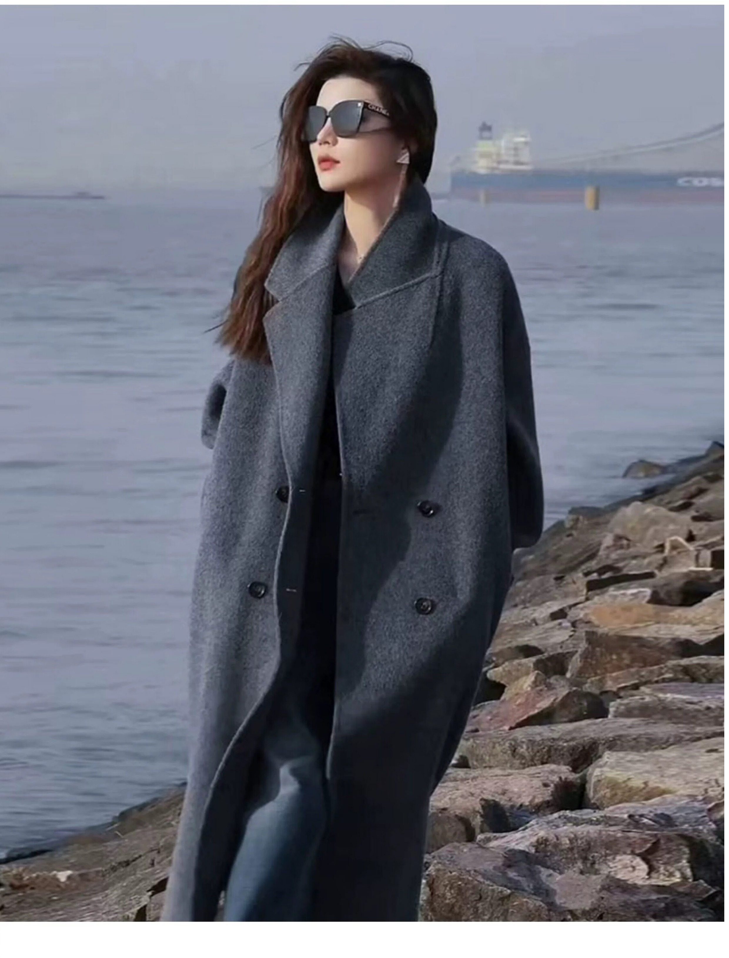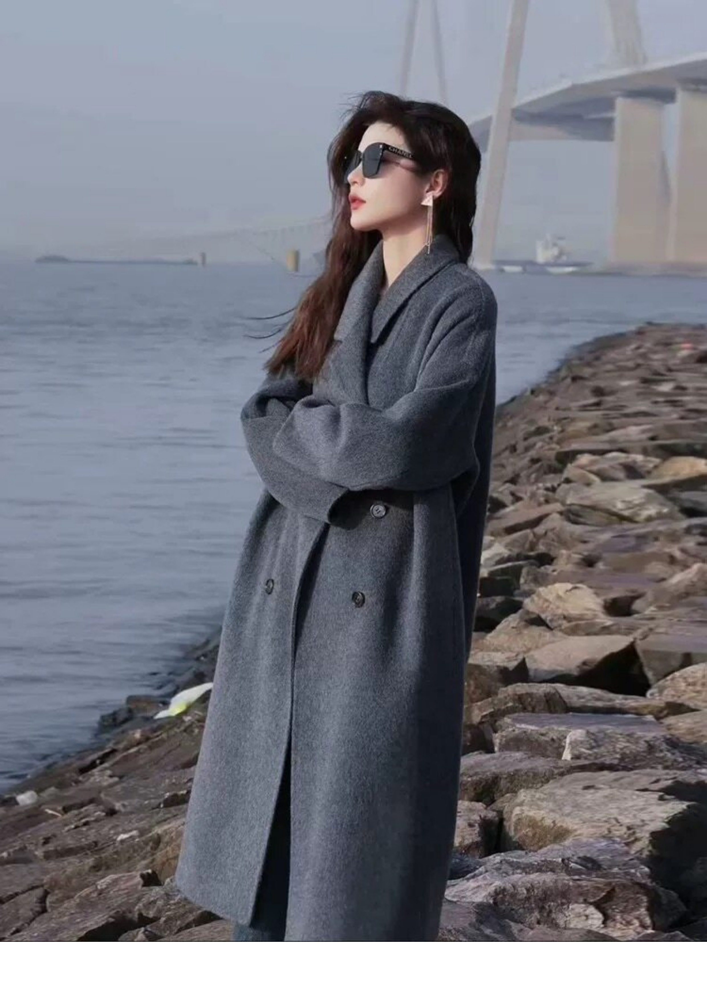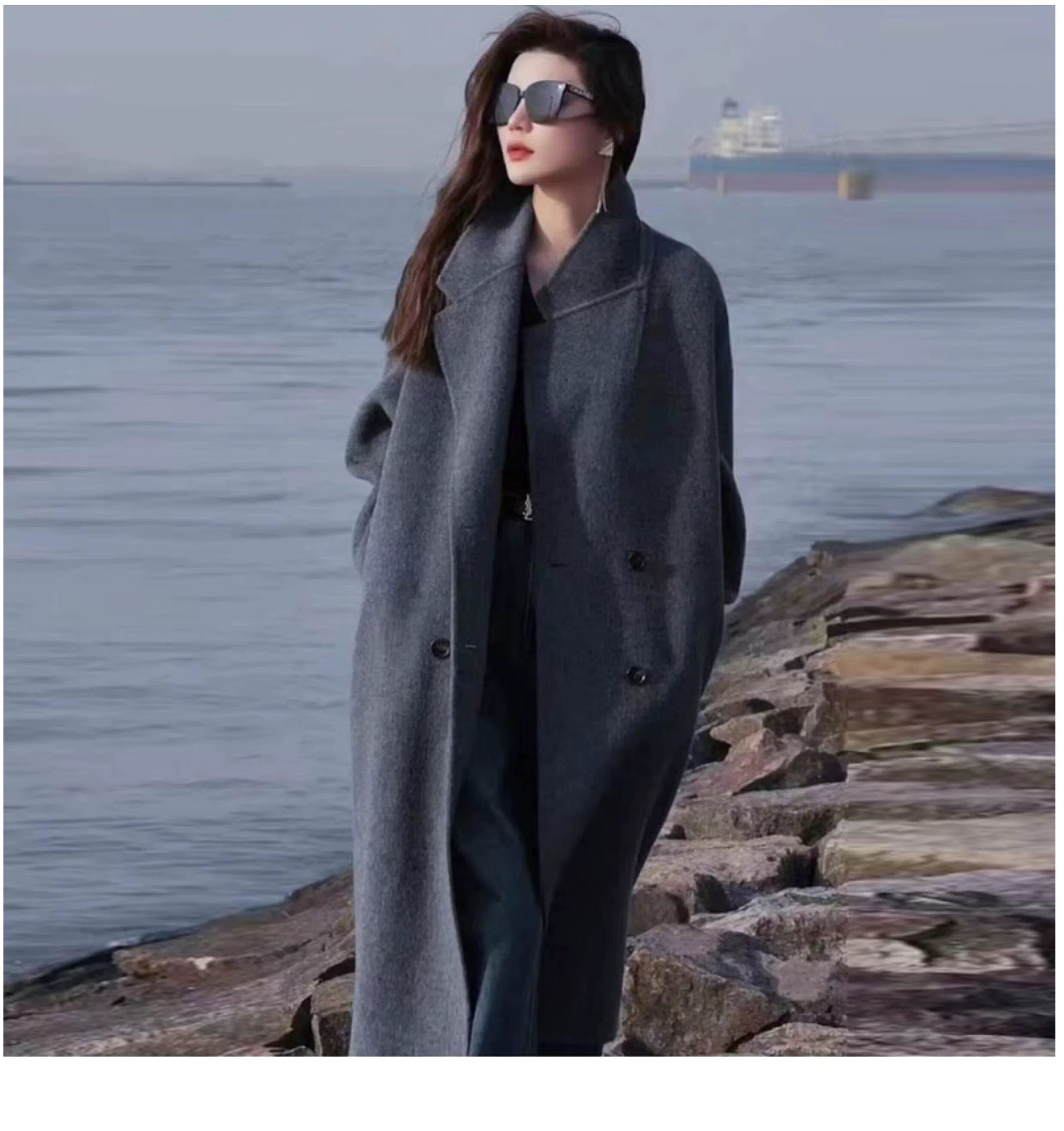 2025 Winter New Style Gray Double-Sided Cashmere Coat for Women, Loose Korean Style High-End Silhouette Woolen Coat