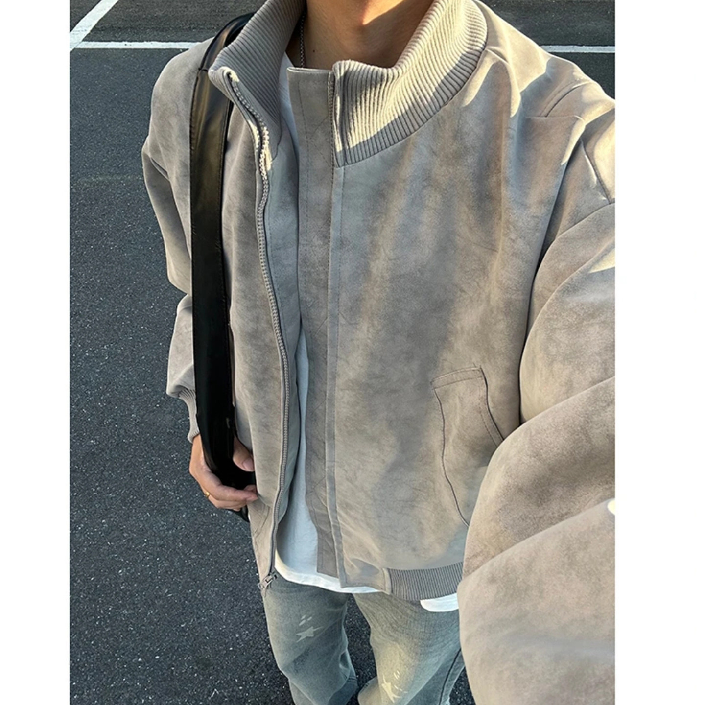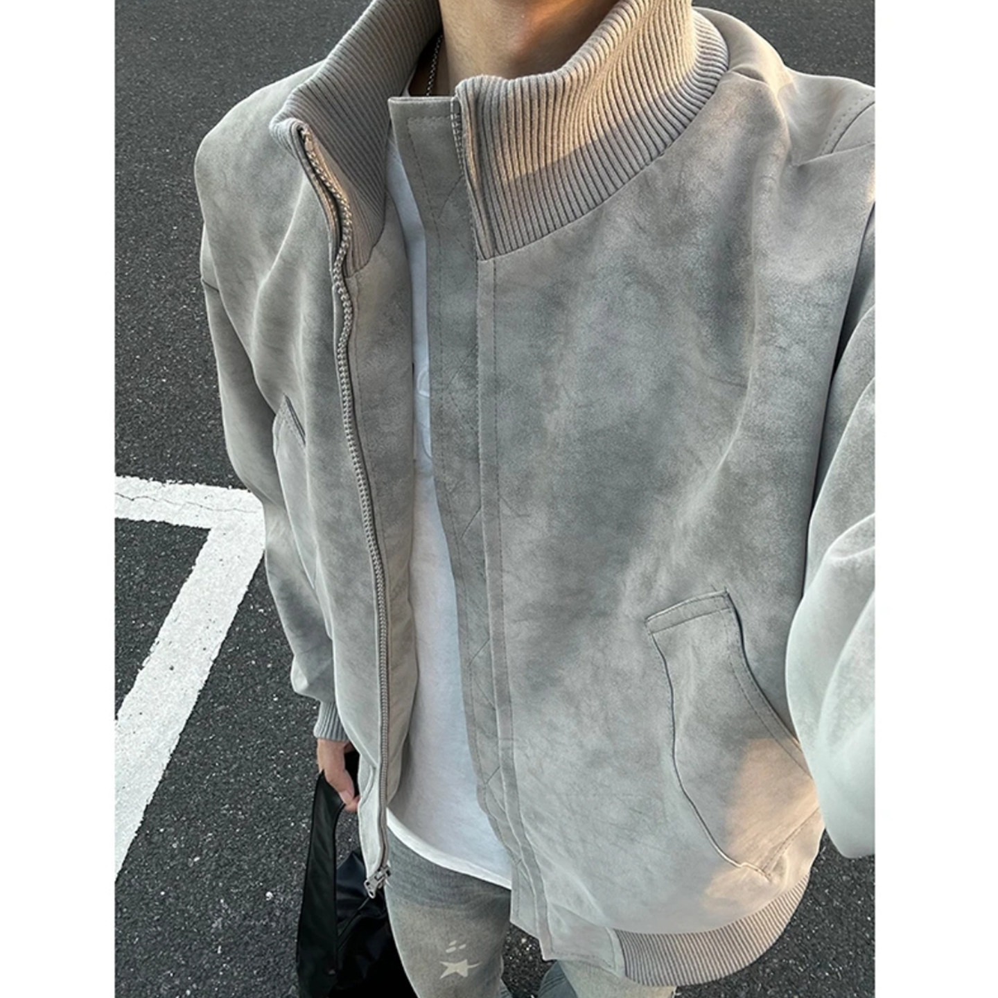 Gray Tie-Dye Stand Collar Pu Leather Jacket for Men, Autumn Short Baseball Jacket, Cleanfit American Pilot Jacket