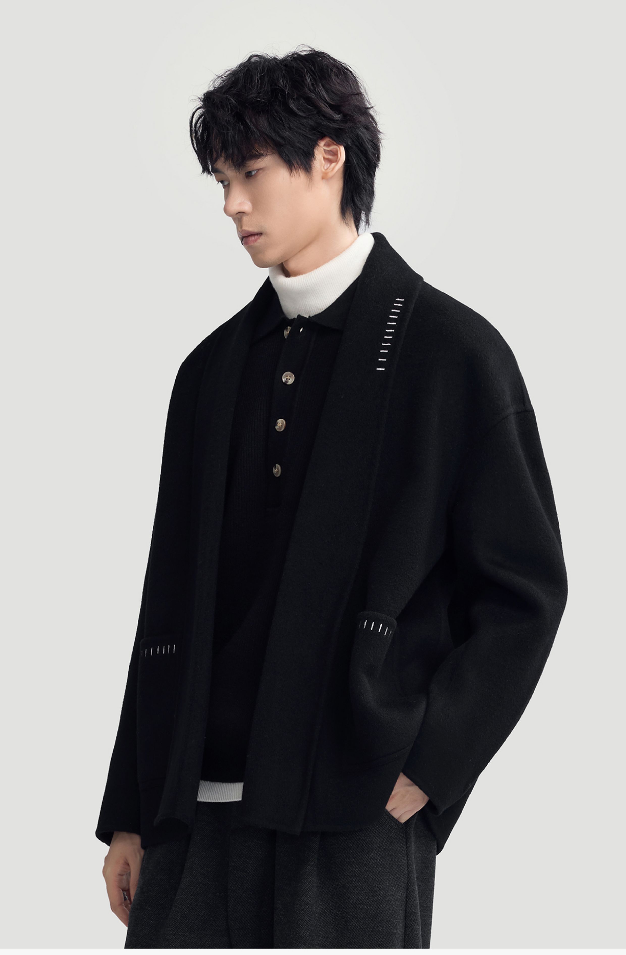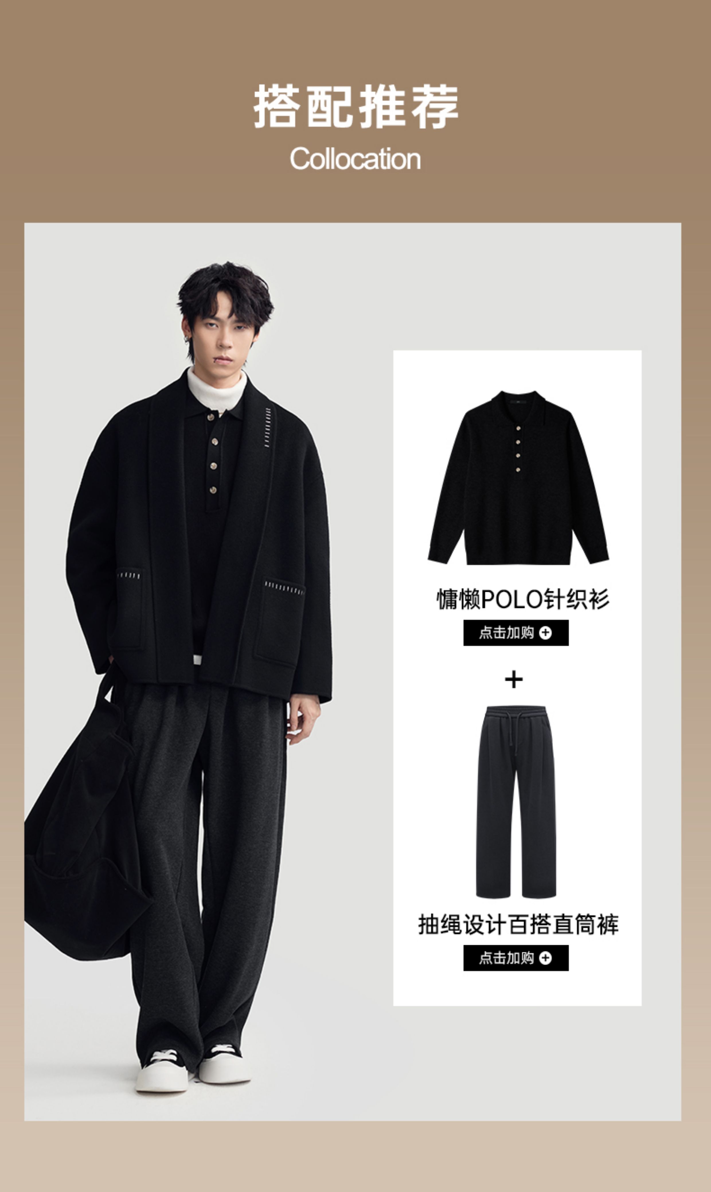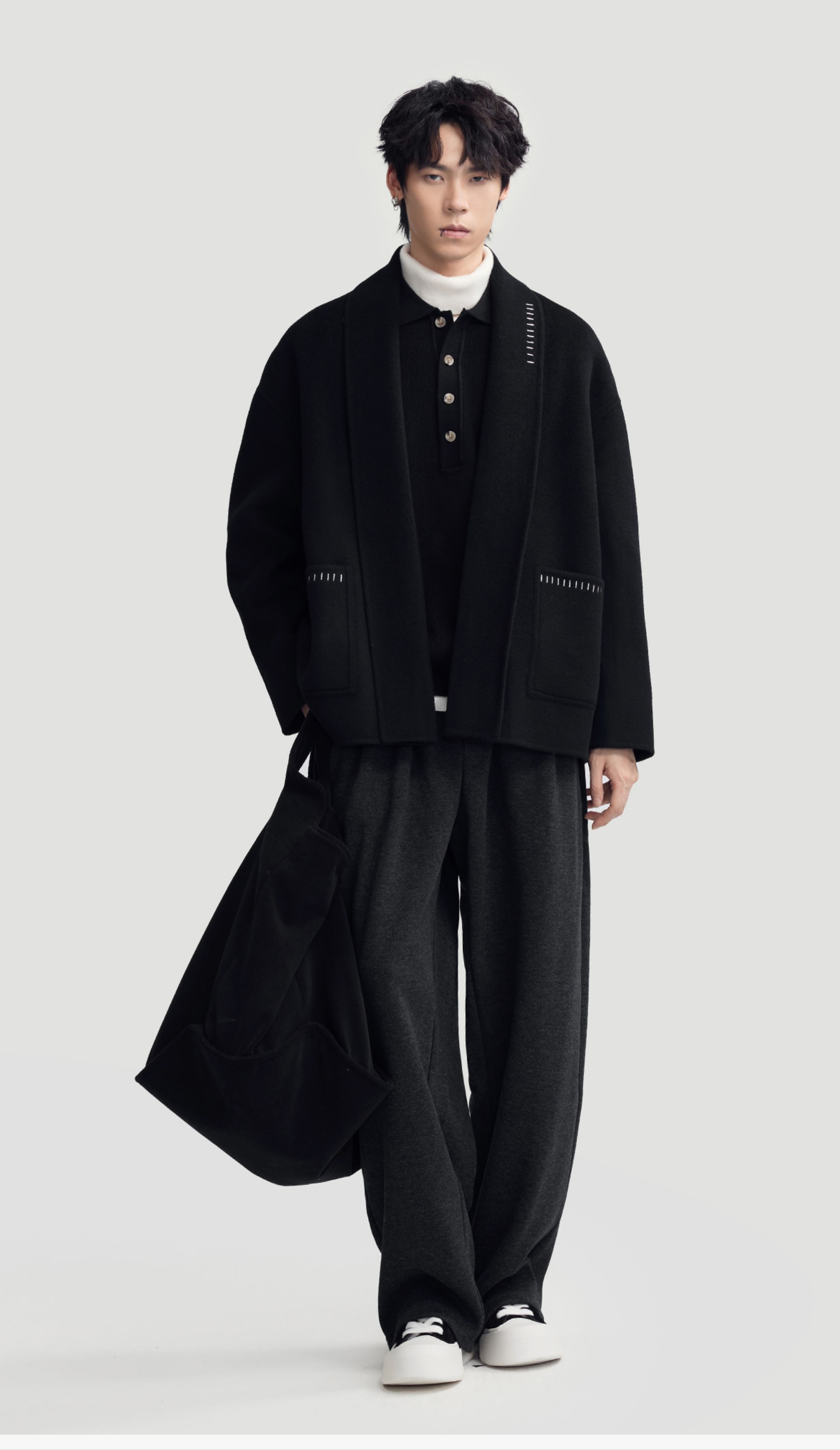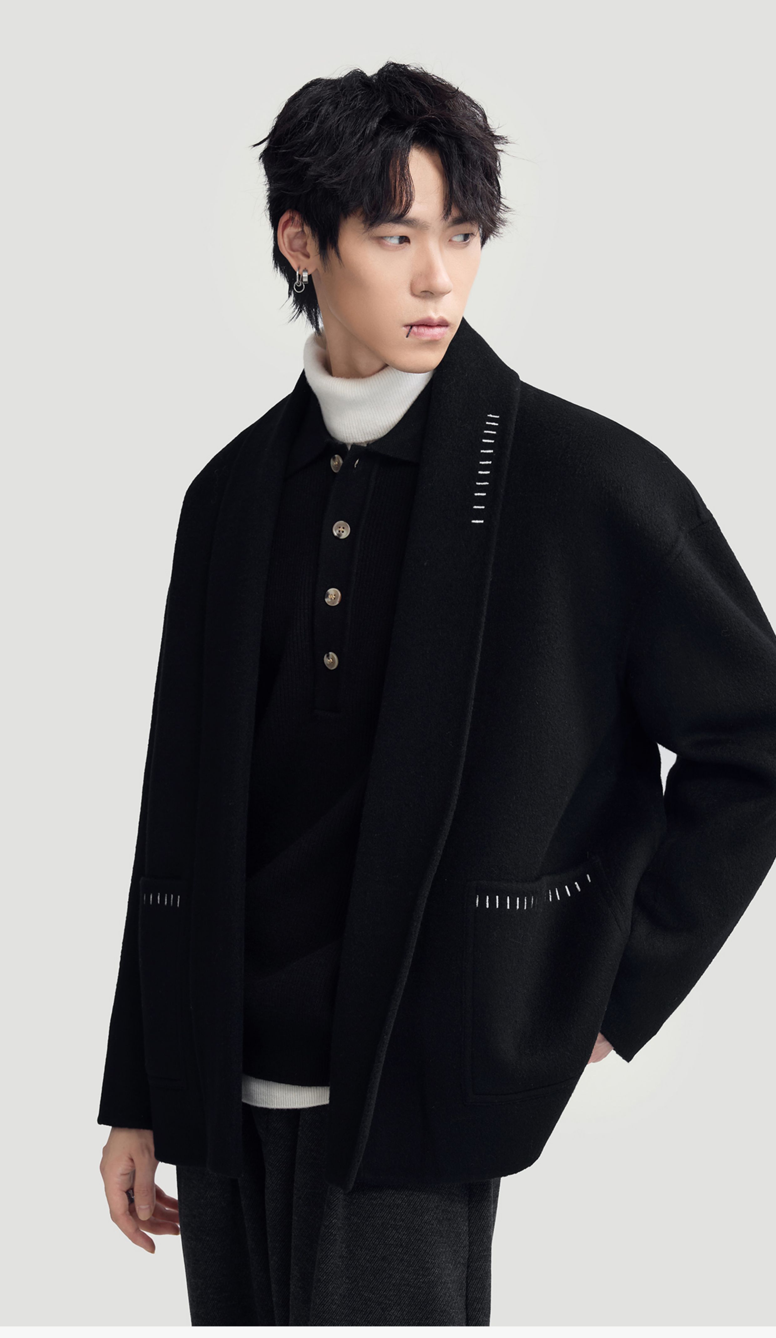 Herbel/Black and White Woolen Coat for Men, 2025 Winter New Style, High-End Scarf Collar Versatile Jacket