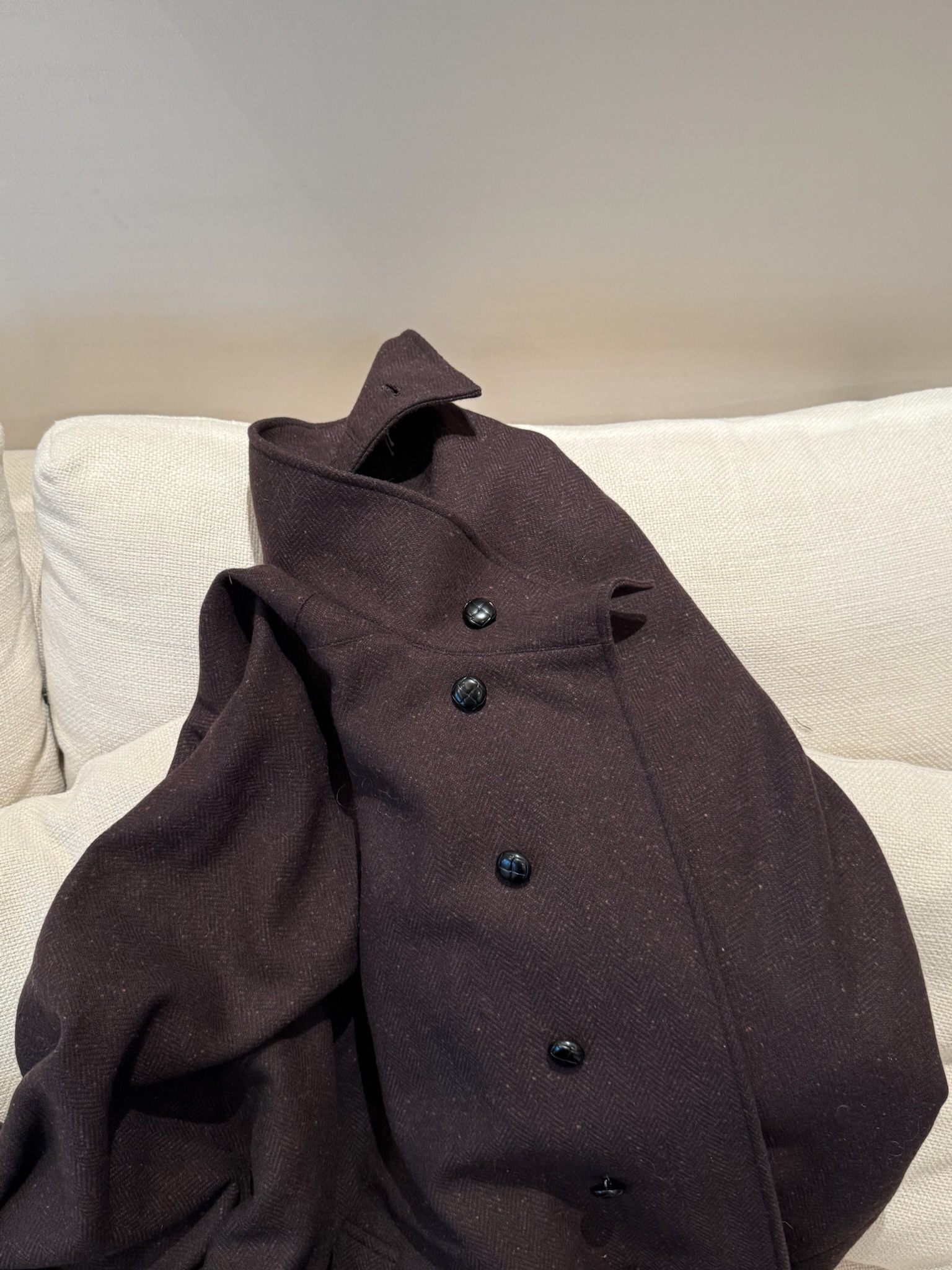 乌木色面料用的是羊毛人棉混纺的霜花呢面料 混了异色纱进去才能做出的颜色效果