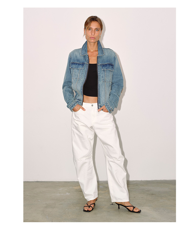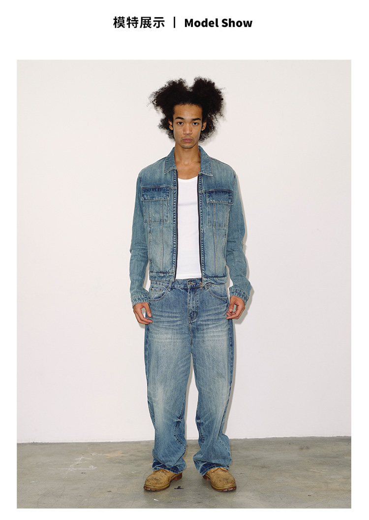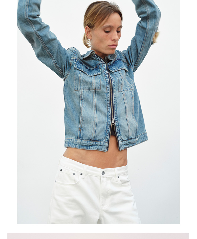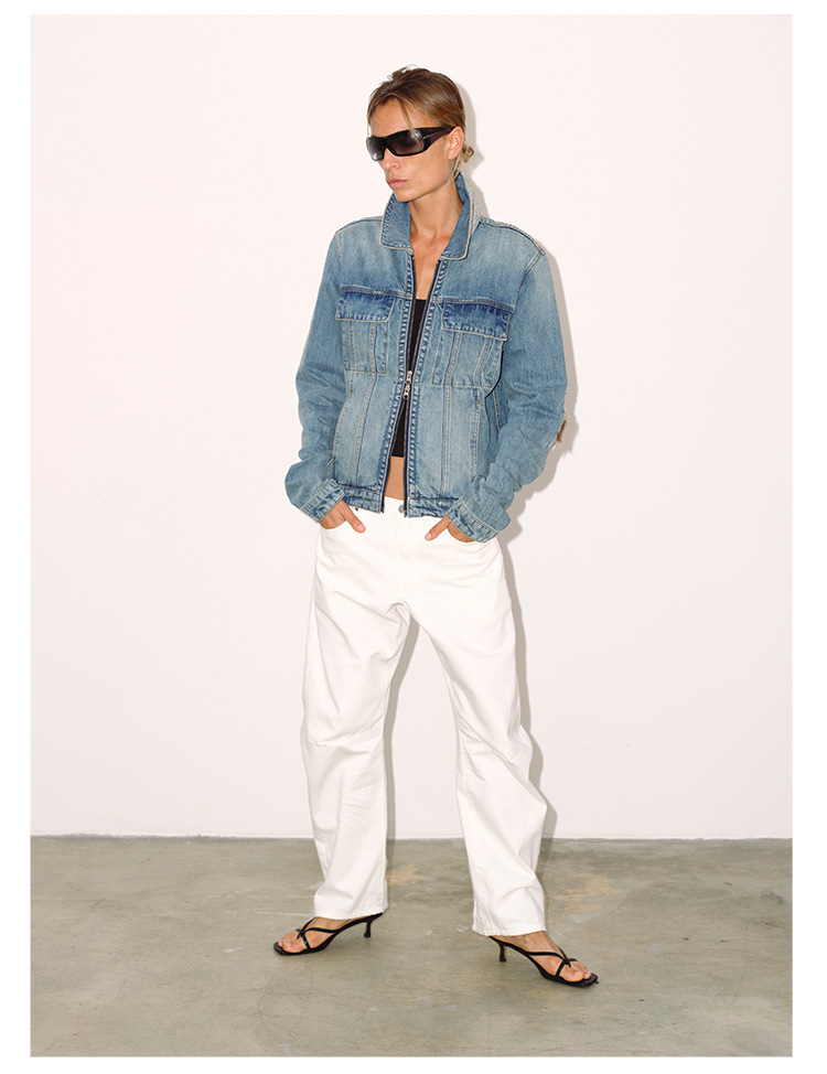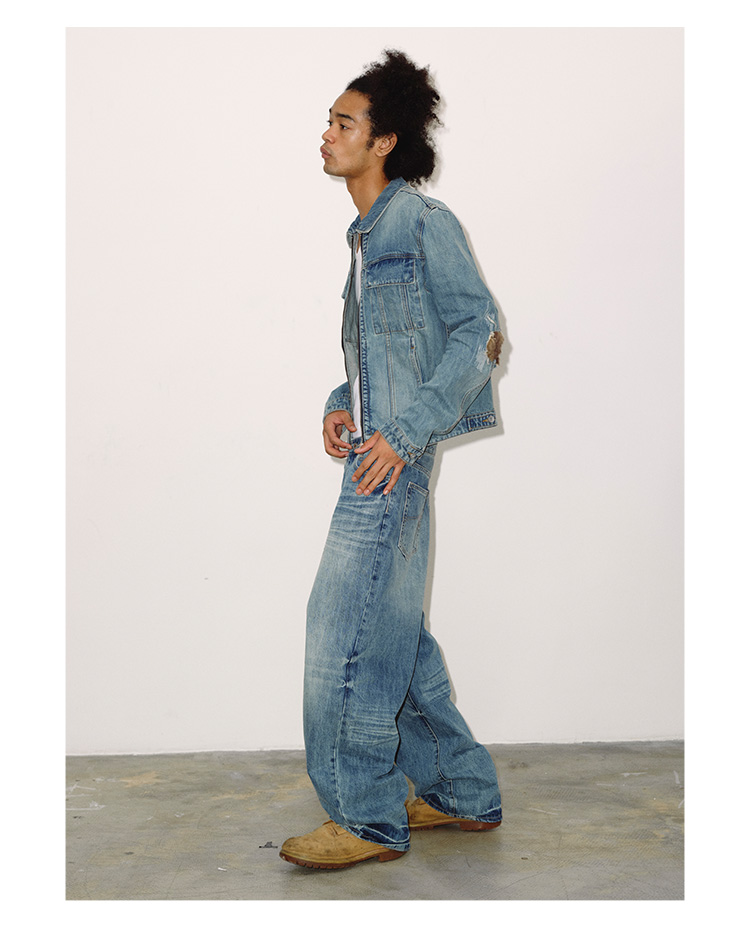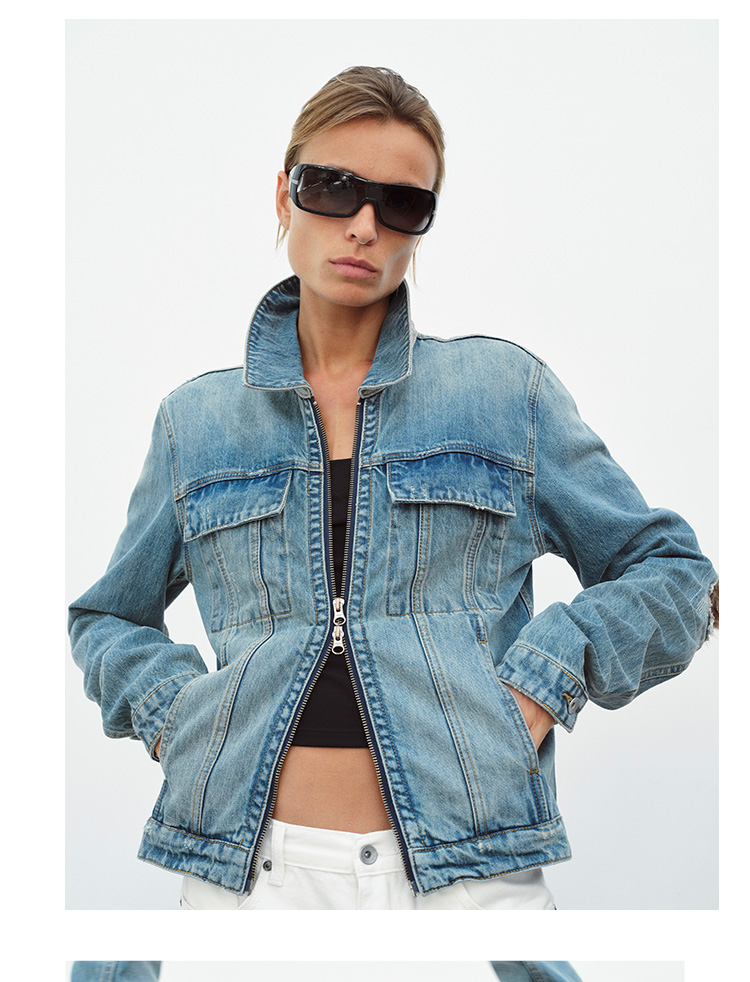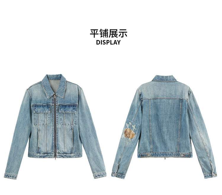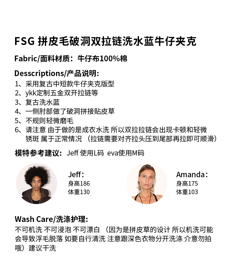 Fsg Patchwork Leather Distressed Double-Zip Washed Blue Denim Jacket