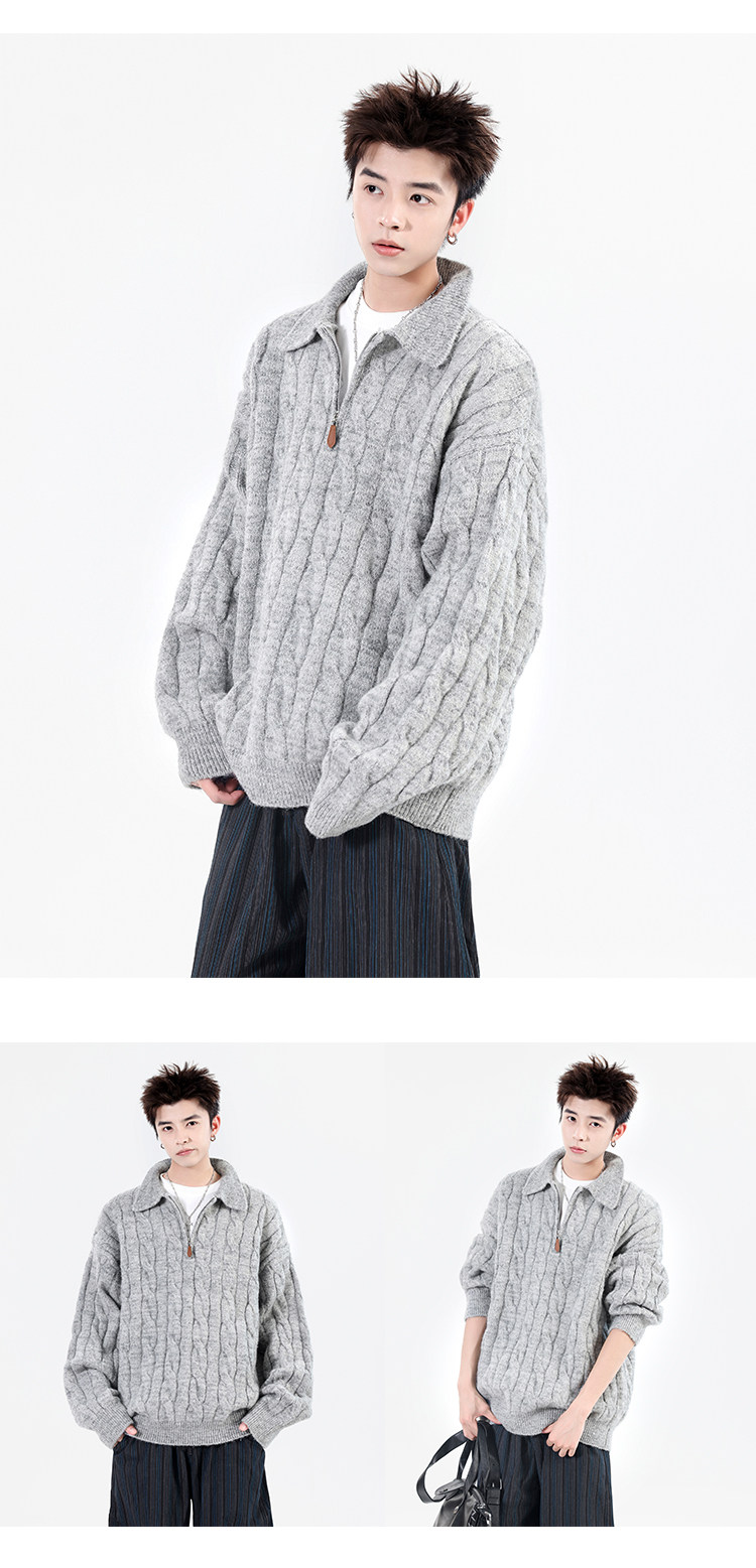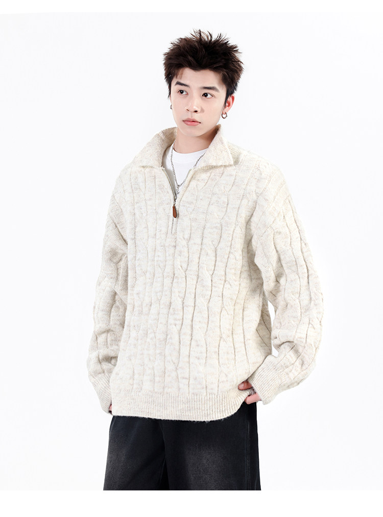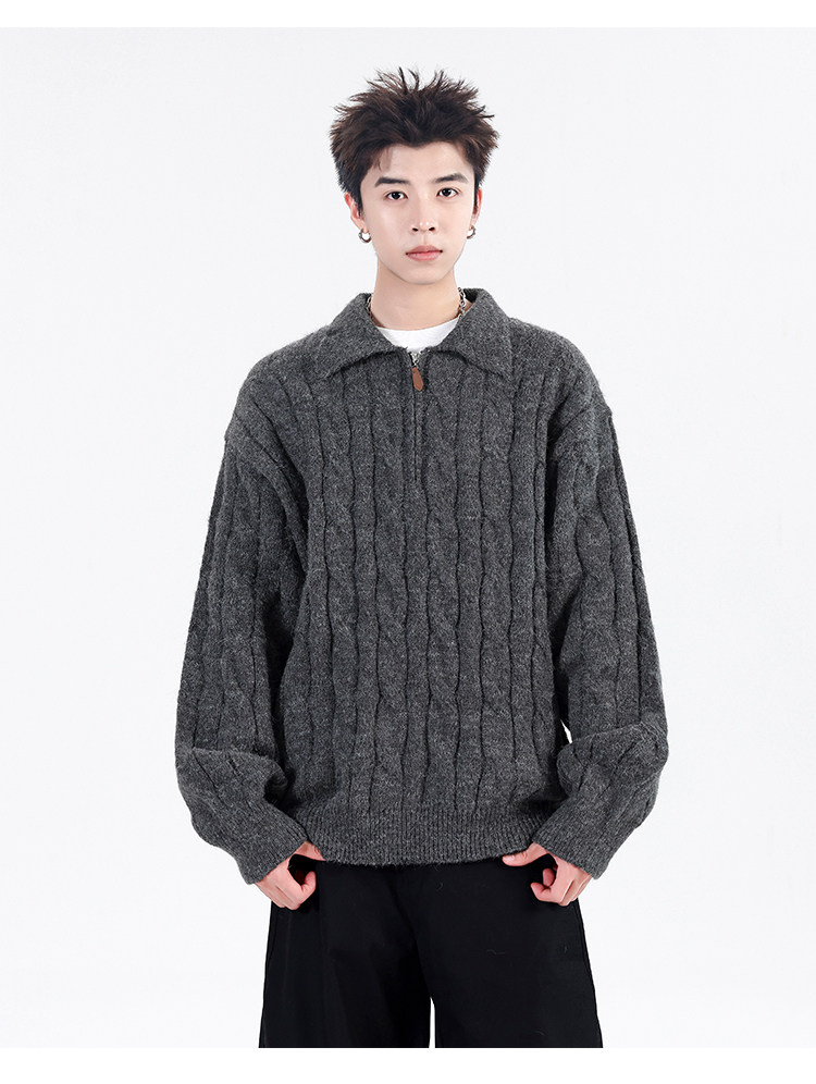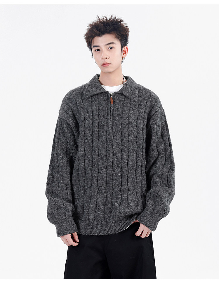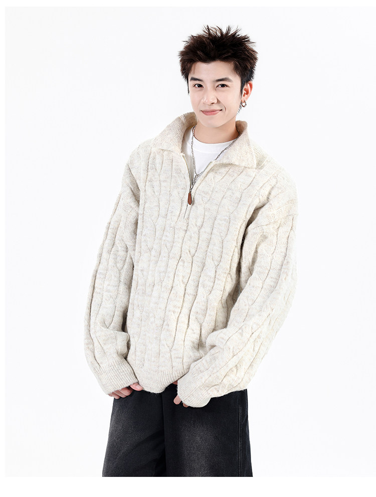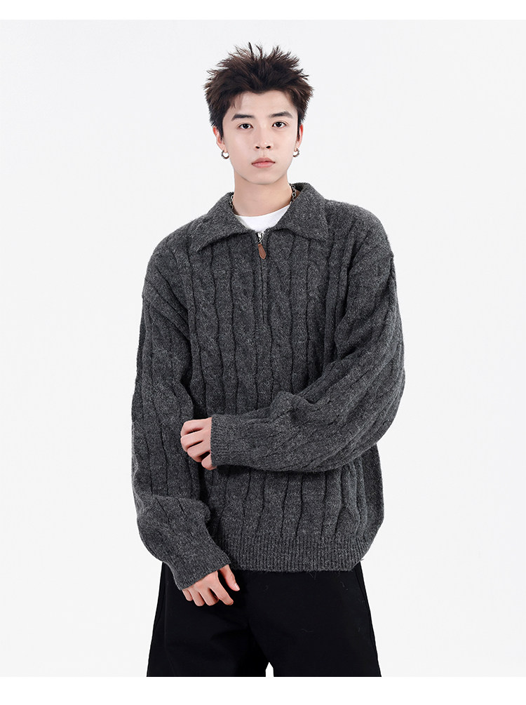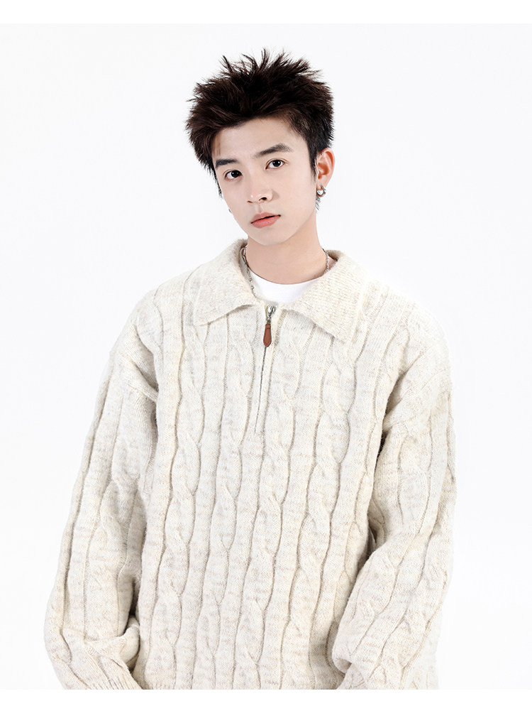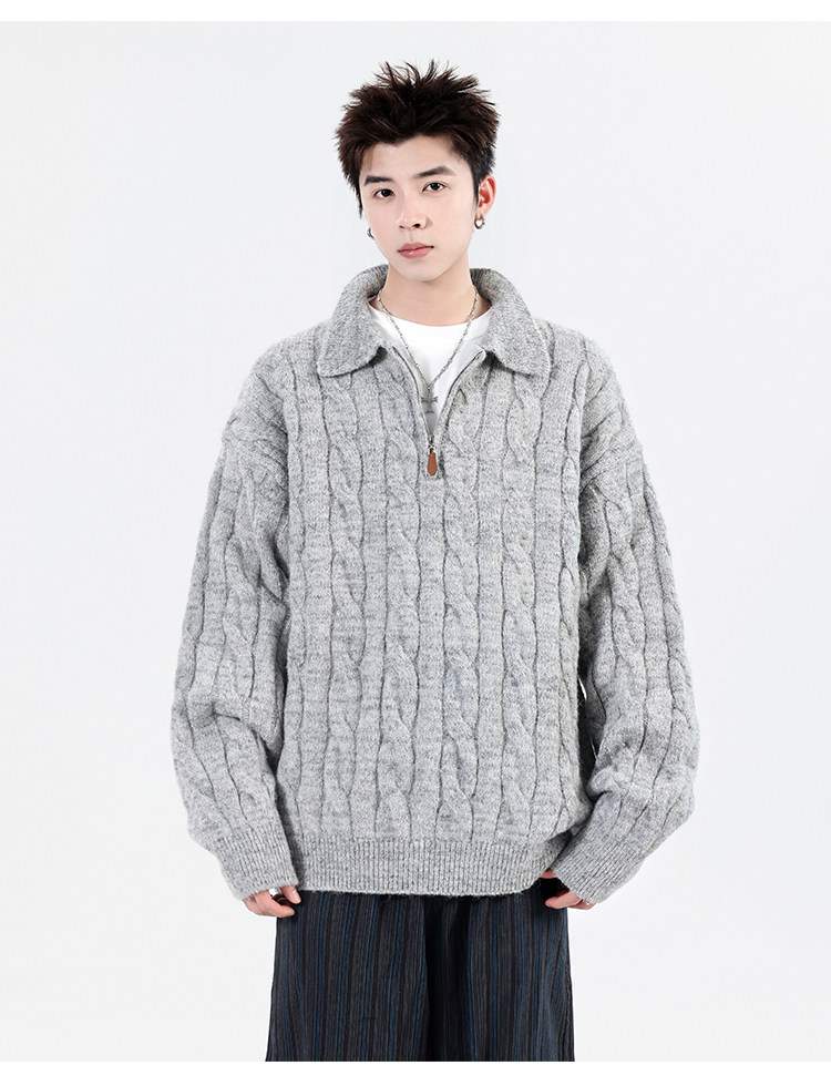 Wassup Shark Retro Style Lapel Half-Zip Cable Knit Sweater Men's Loose Lazy Style Pullover Sweater