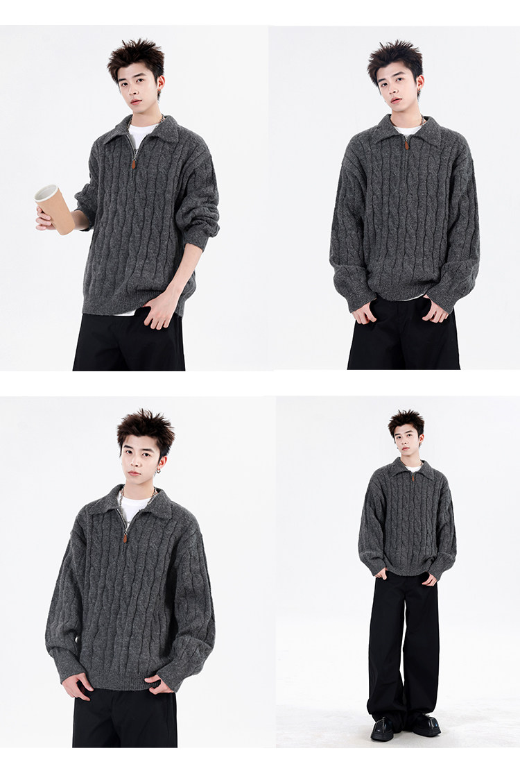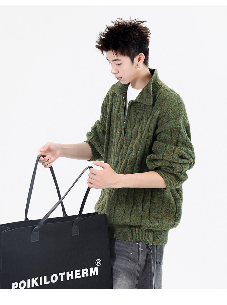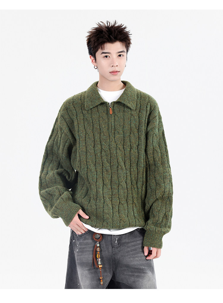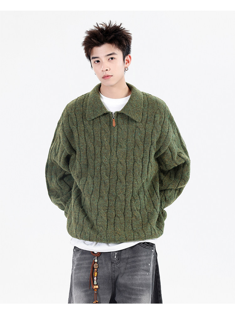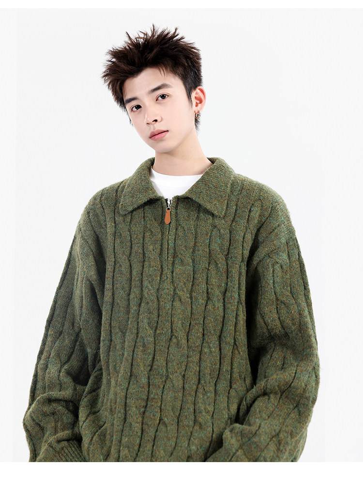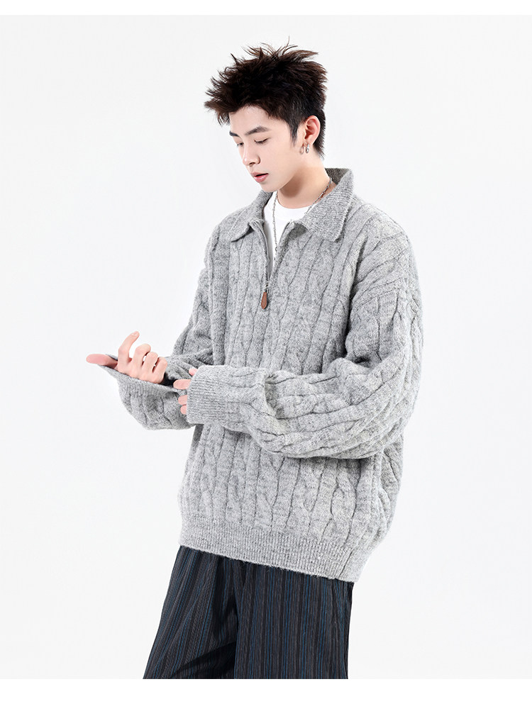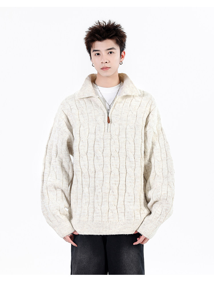 Wassup Shark Retro Style Lapel Half-Zip Cable Knit Sweater Men's Loose Lazy Style Pullover Sweater