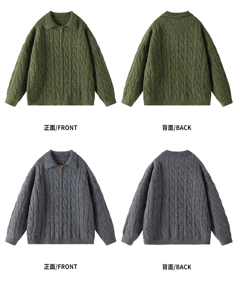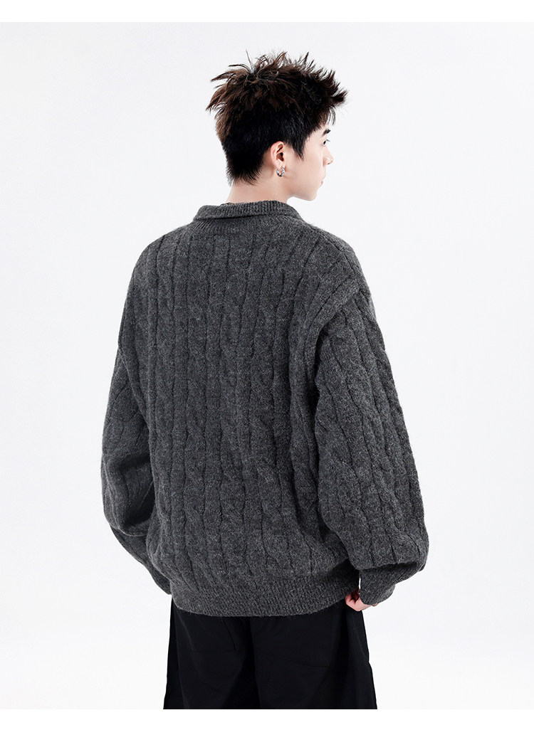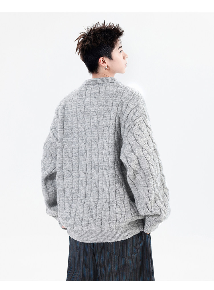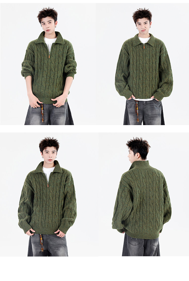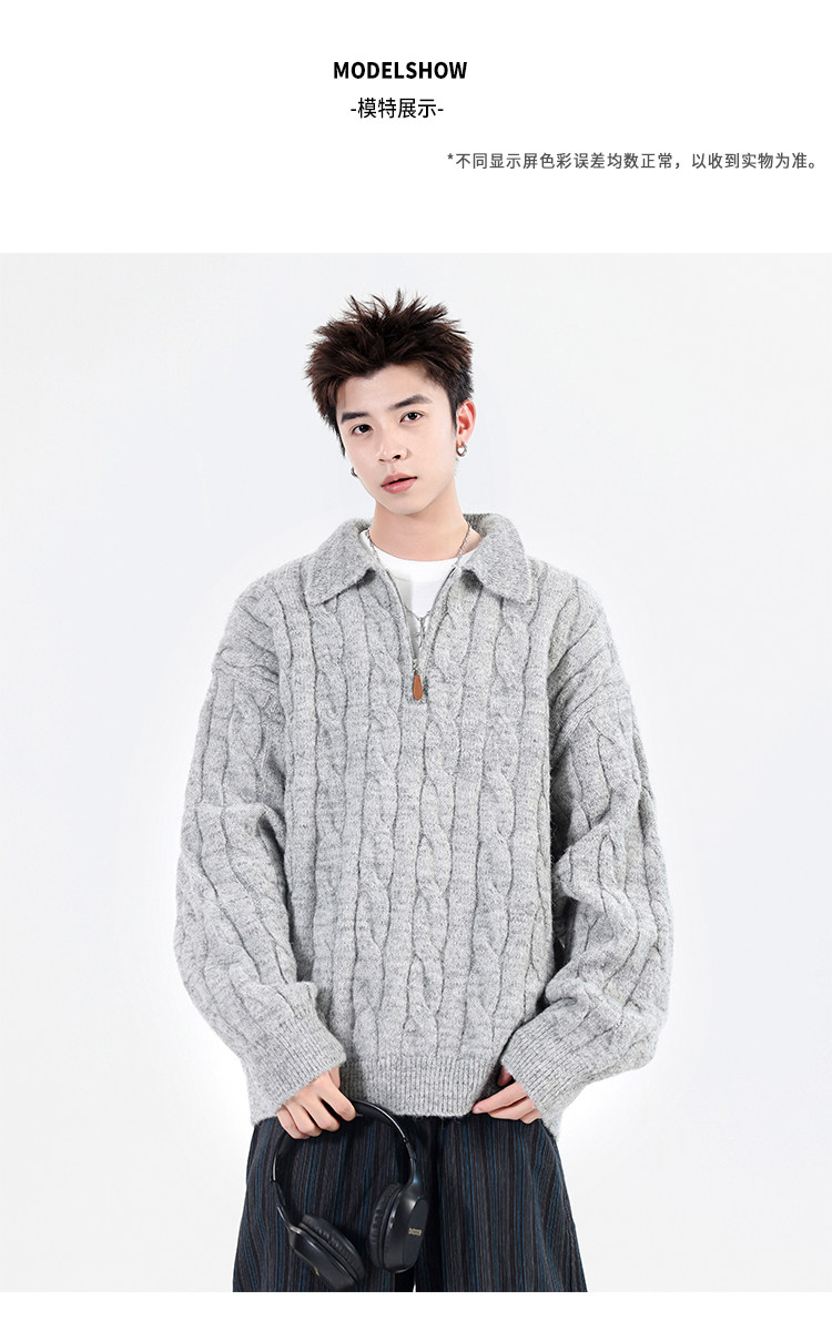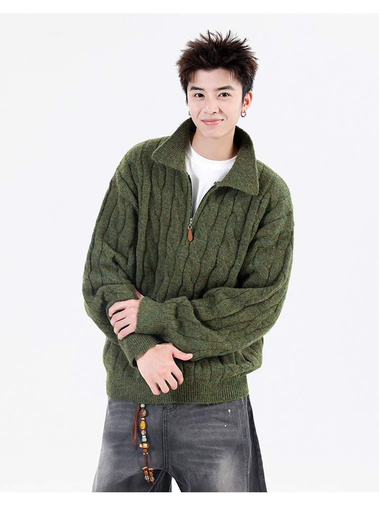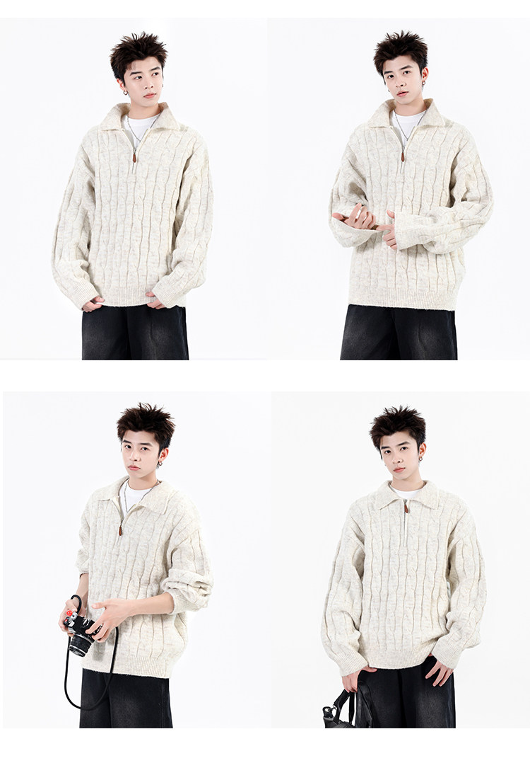 Wassup Shark Retro Style Lapel Half-Zip Cable Knit Sweater Men's Loose Lazy Style Pullover Sweater