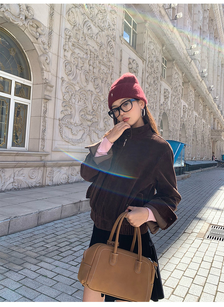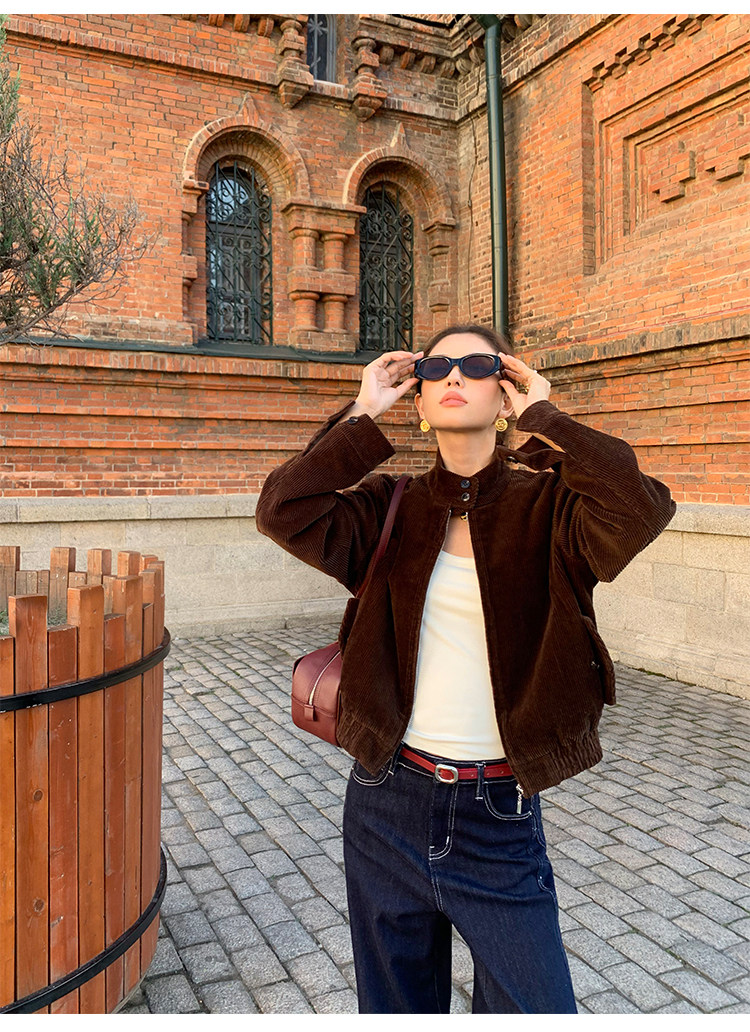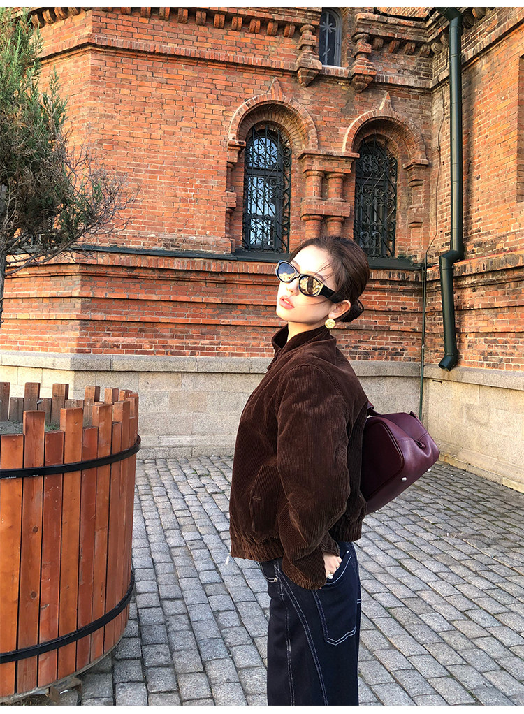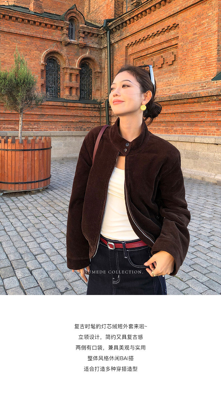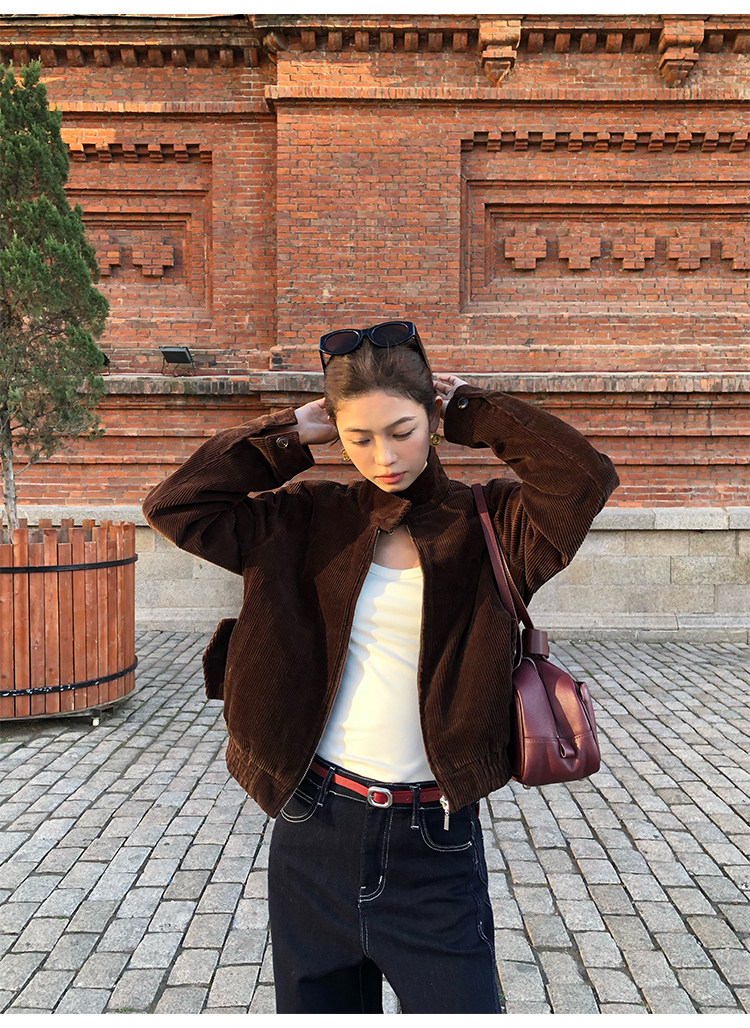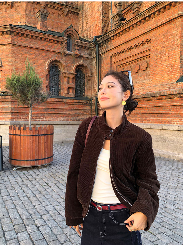 Pusumede Timeless Style Retro Corduroy Stand Collar Cotton Jacket Women's Loose Casual Jacket Top