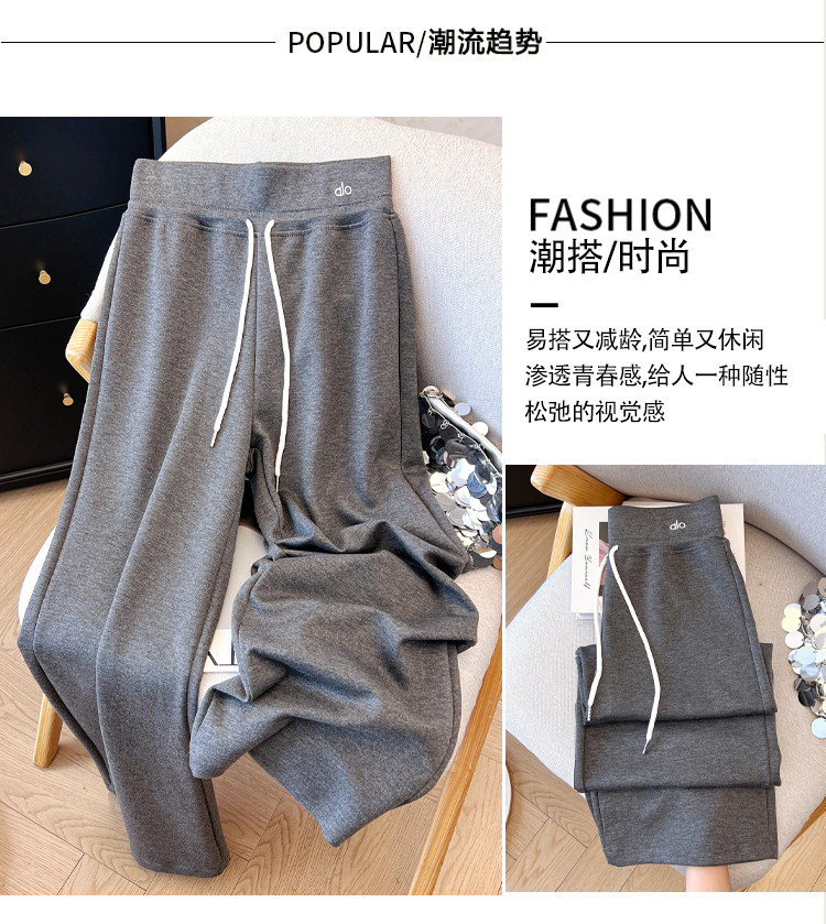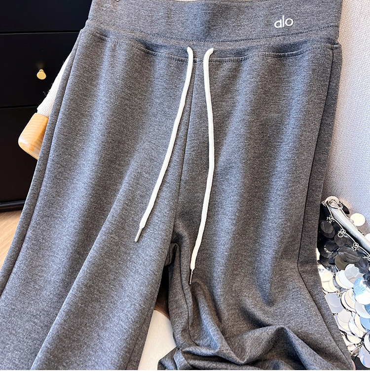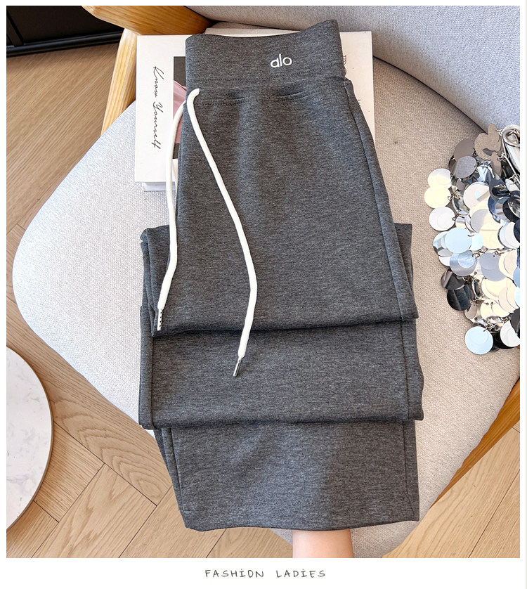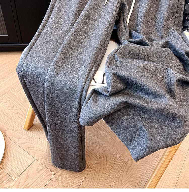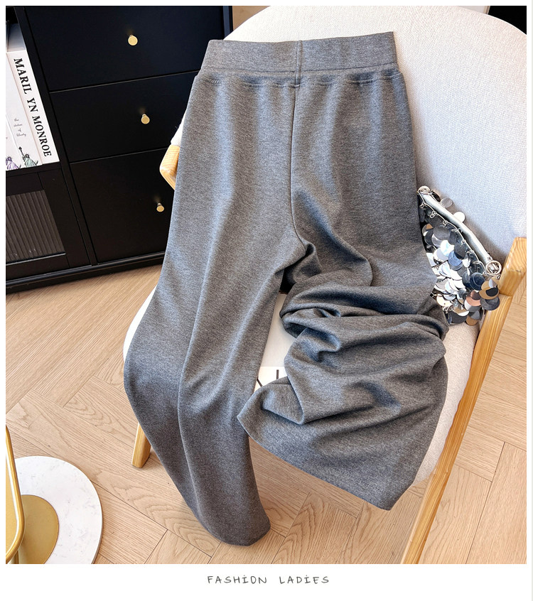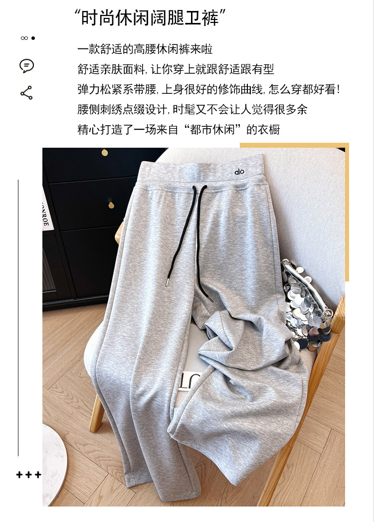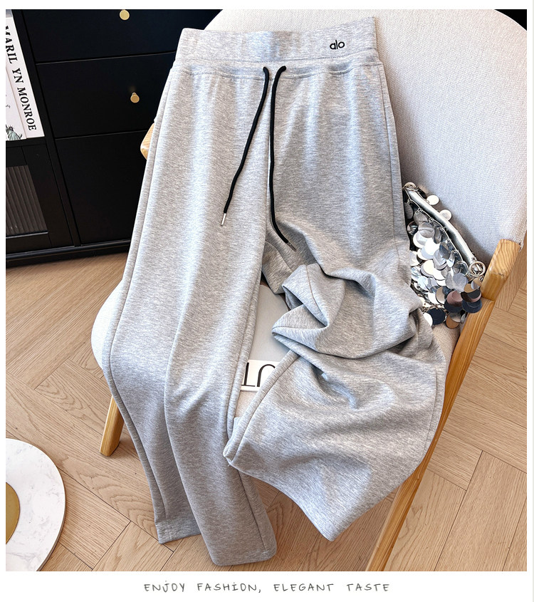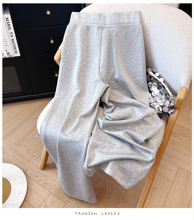 150cm Petite Gray American-Style Sweatpants for Women, Spring and Autumn, High-Waisted, Drawstring, Drapey, Embroidered, Straight-Leg Wide-Leg Pants, Size XS