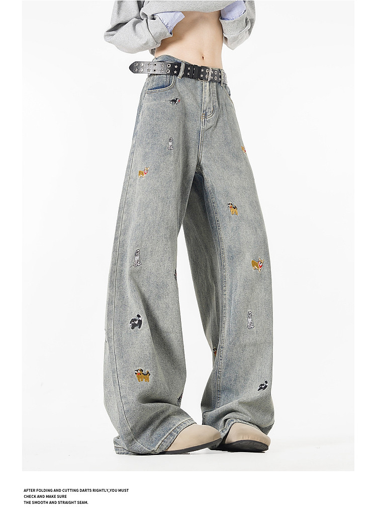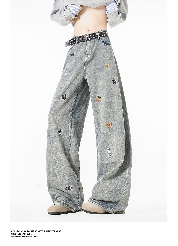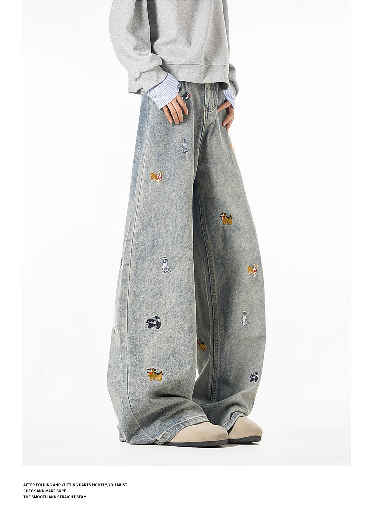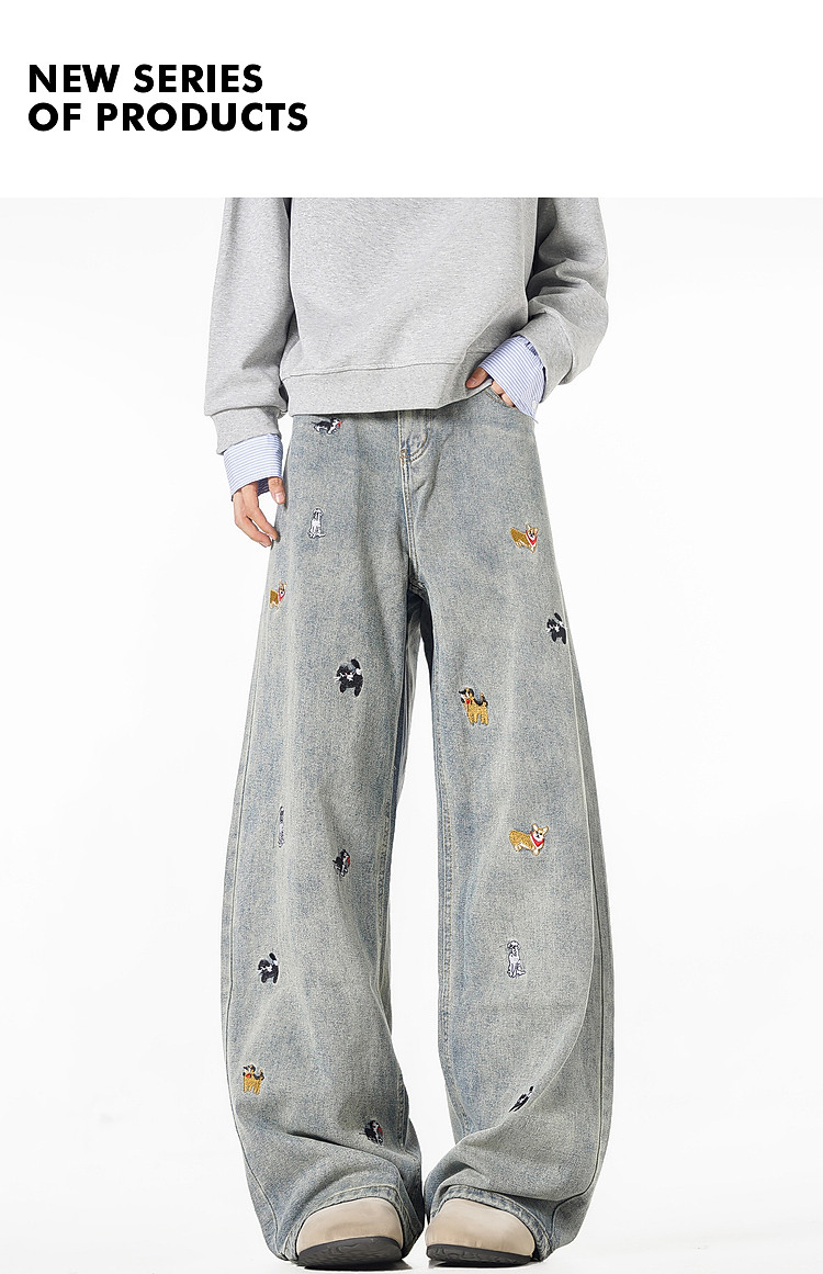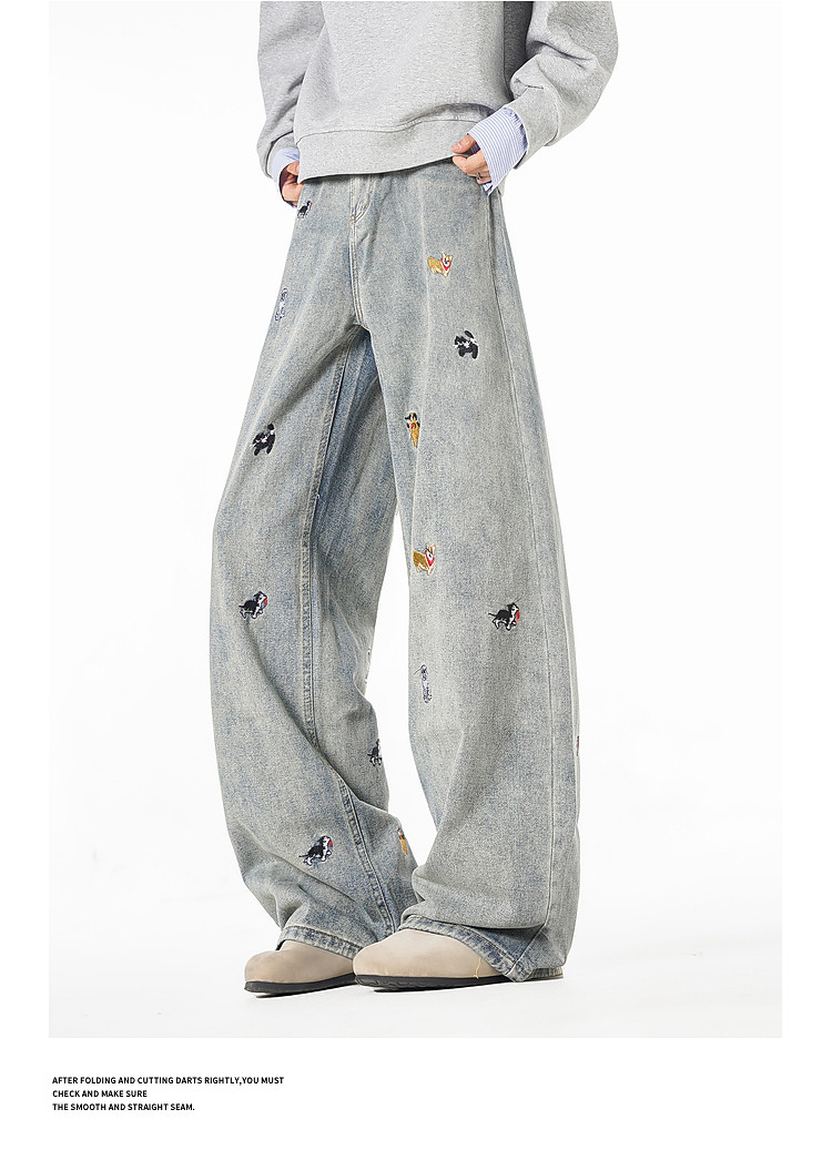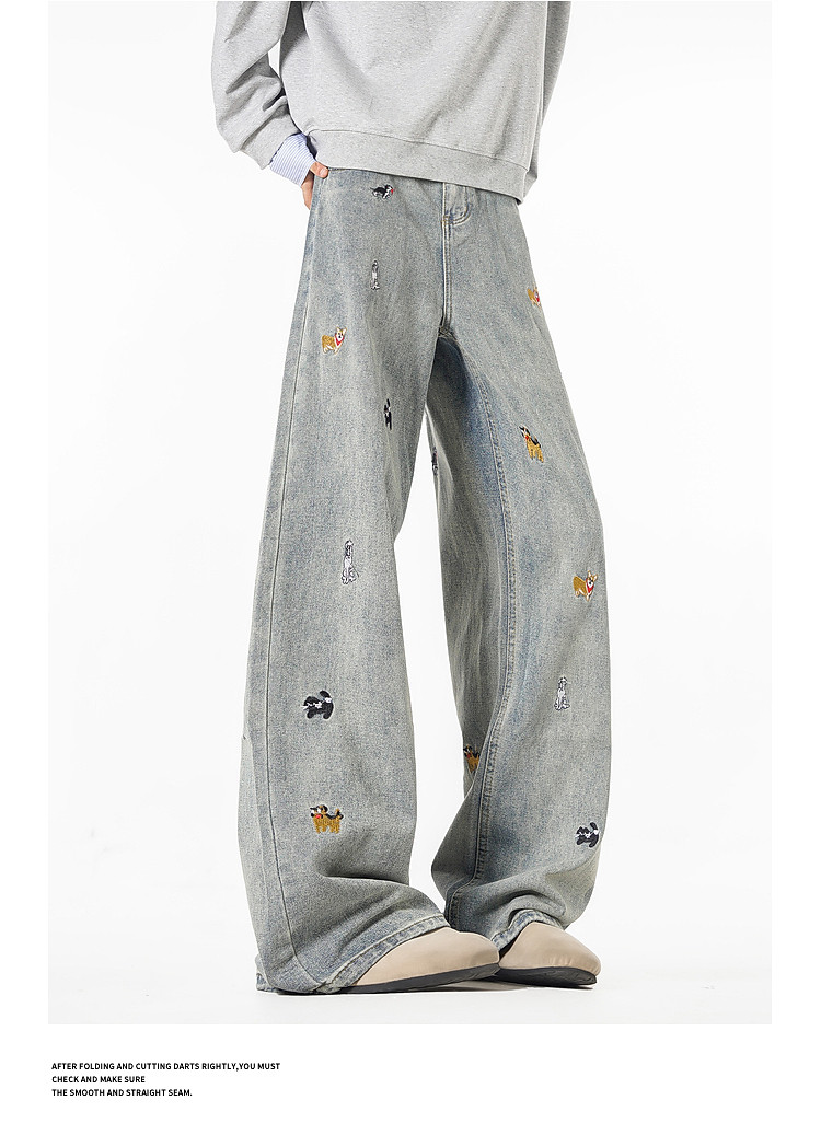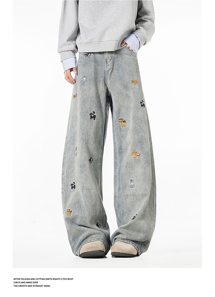 Wukong Has in Stock Trendy American-Style Dog Embroidery Scimitar Jeans for Men, Vintage Loose Washed Versatile Wide-Leg Pants