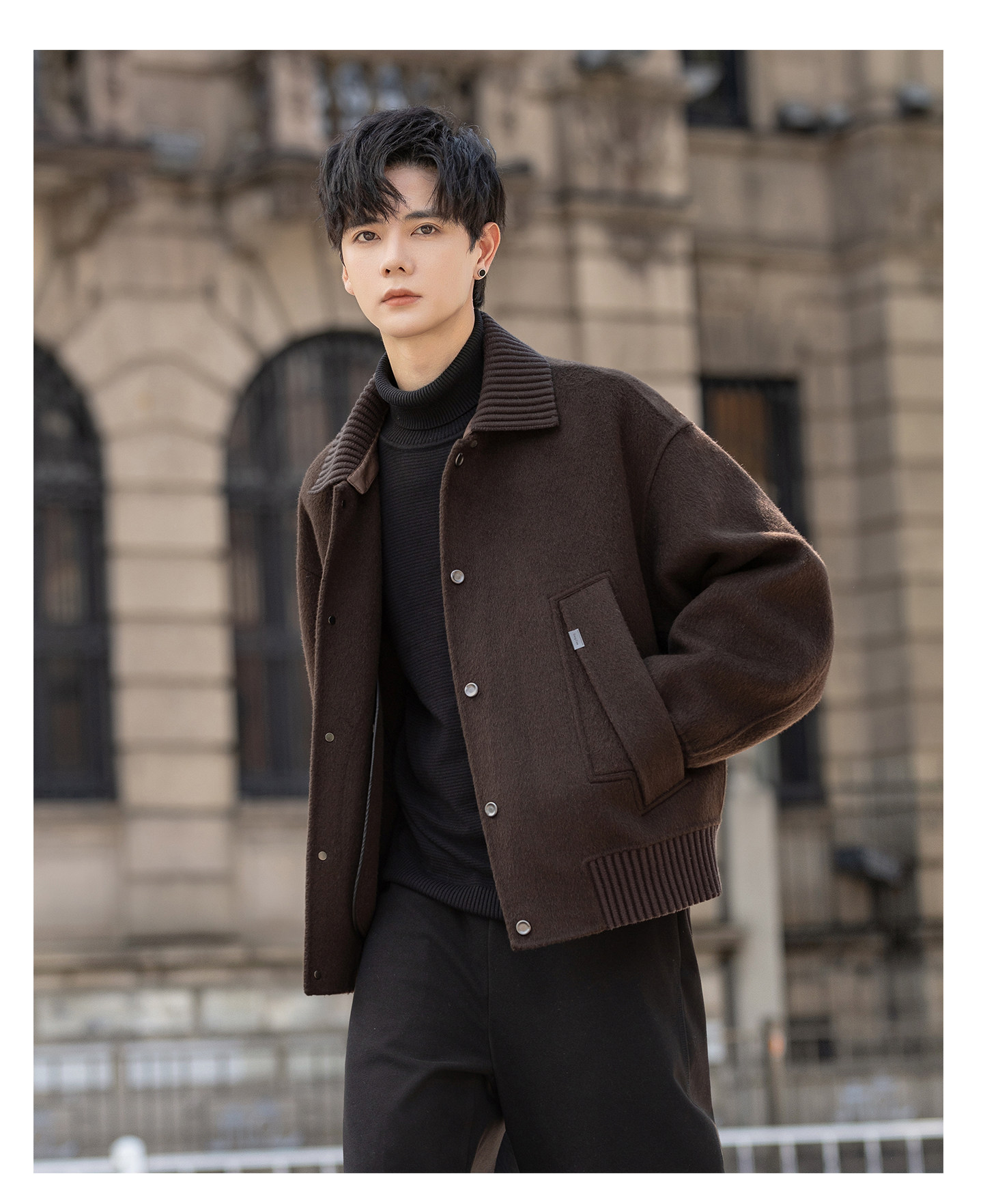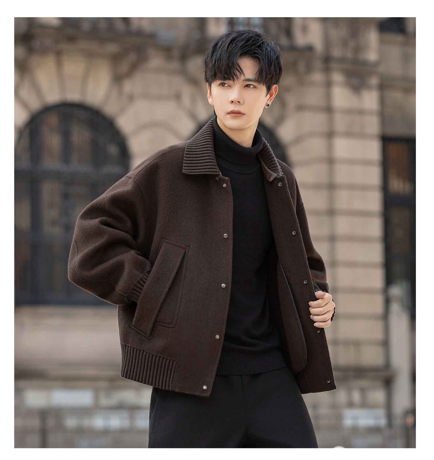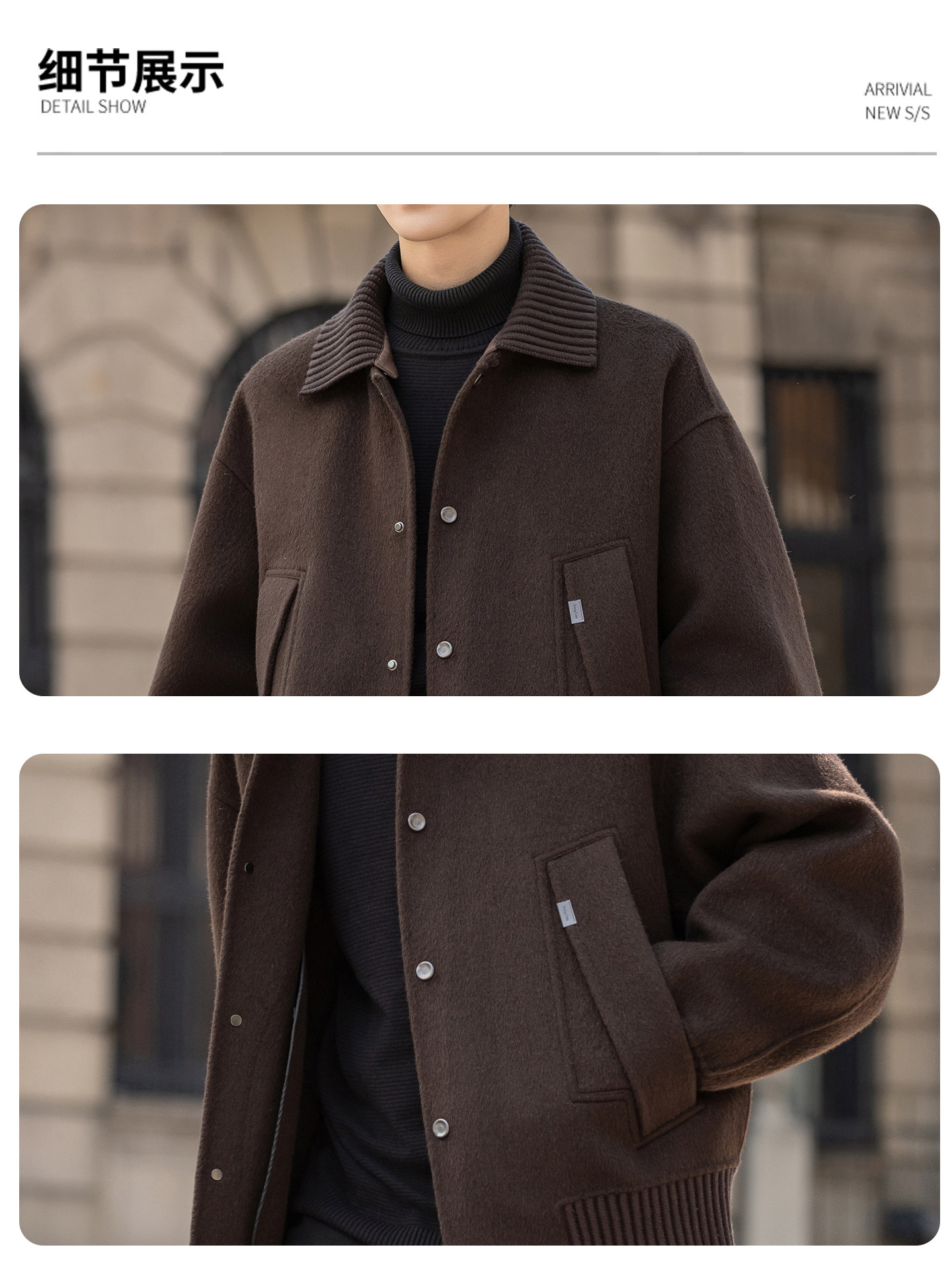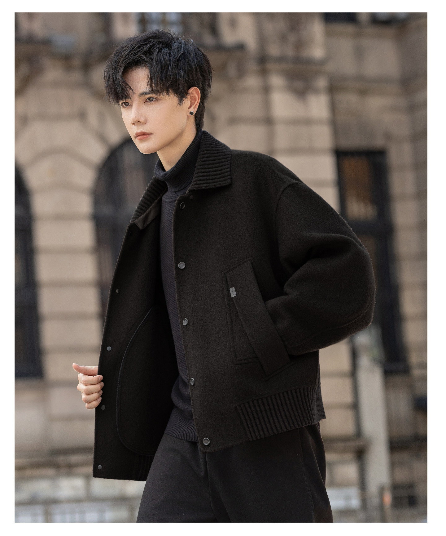 Men's Double-Sided Fleece Short Coat with Detachable Lapel, Ribbed Pure Wool Woolen Jacket, Thickened for Winter